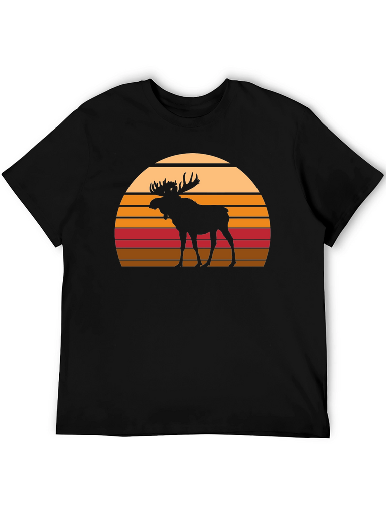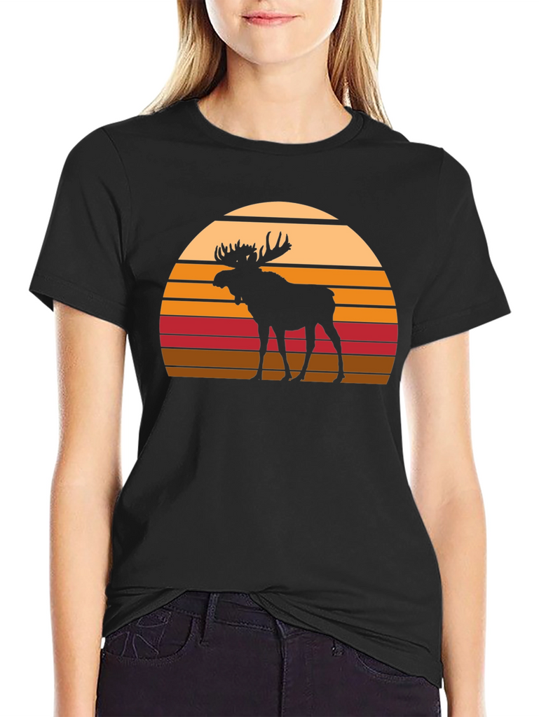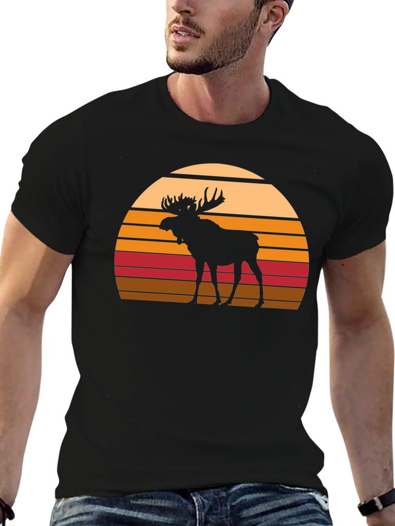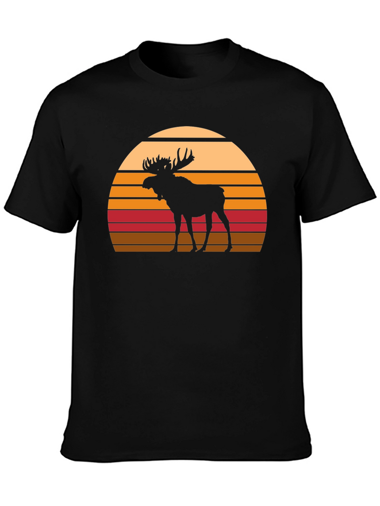 Embrace vintage vibes with this eye-catching black T-shirt! This soft, comfortable tee features a bold retro-style graphic of a moose silhouette set against a vibrant sunset backdrop. The warm hues of orange, yellow, and red create a striking contrast against the dark silhouette, making this shirt a stylish statement piece. Perfect for casual outings, weekend adventures, or simply lounging at home, this tee combines comfort and unique design. Show off your love for nature and timeless fashion with this must-have addition to your wardrobe. Get yours today and stand out with this classic, eye-catching style!