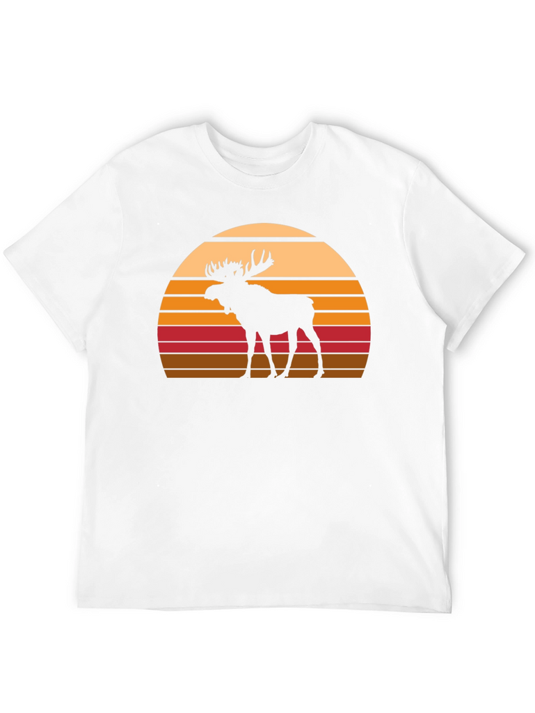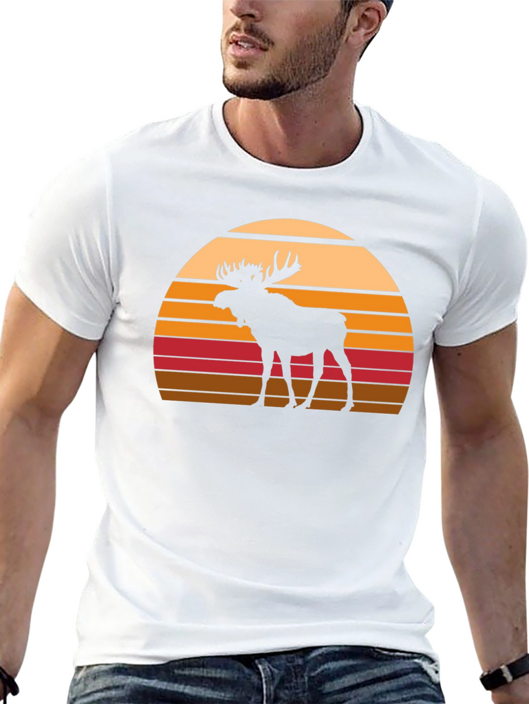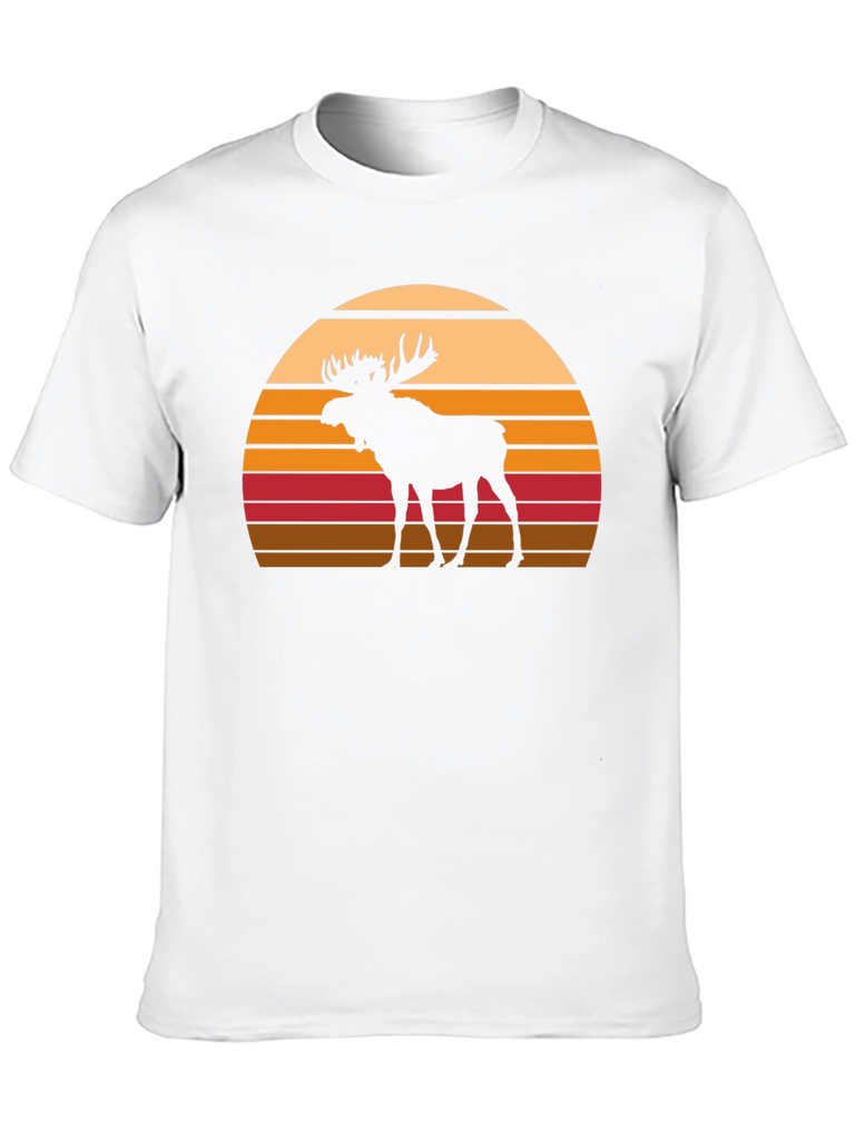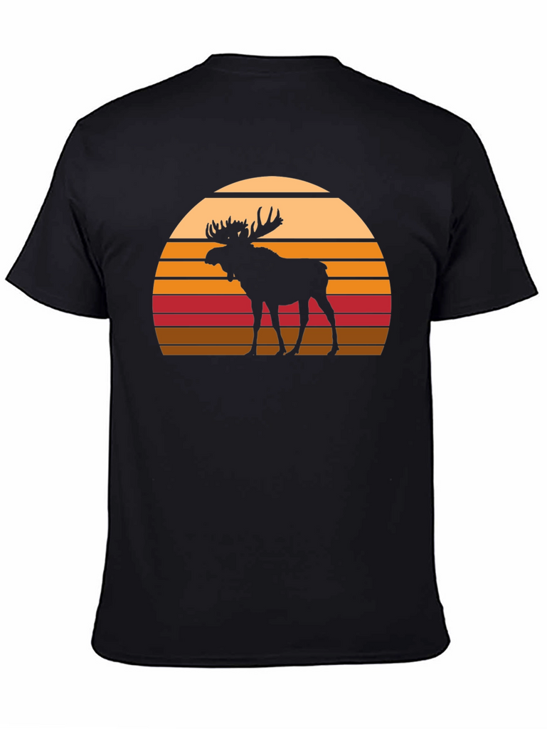 Embrace vintage vibes with this eye-catching black T-shirt! This soft, comfortable tee features a bold retro-style graphic of a moose silhouette set against a vibrant sunset backdrop. The warm hues of orange, yellow, and red create a striking contrast against the dark silhouette, making this shirt a stylish statement piece. Perfect for casual outings, weekend adventures, or simply lounging at home, this tee combines comfort and unique design. Show off your love for nature and timeless fashion with this must-have addition to your wardrobe. Get yours today and stand out with this classic, eye-catching style!