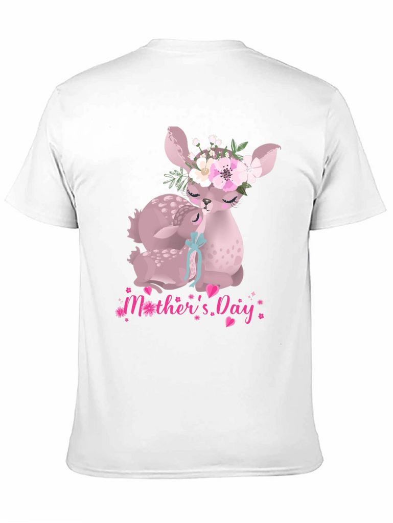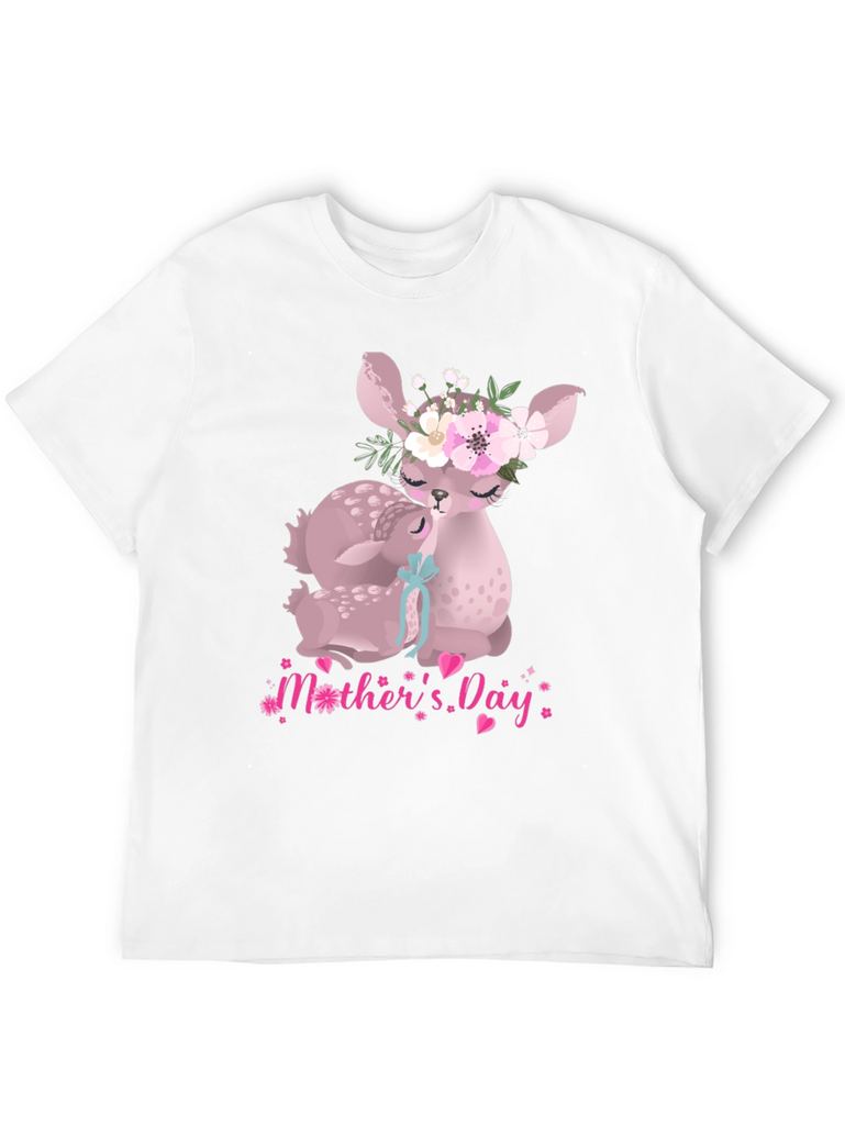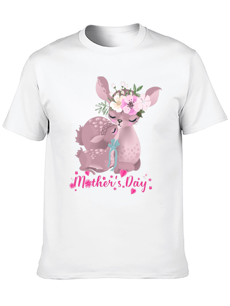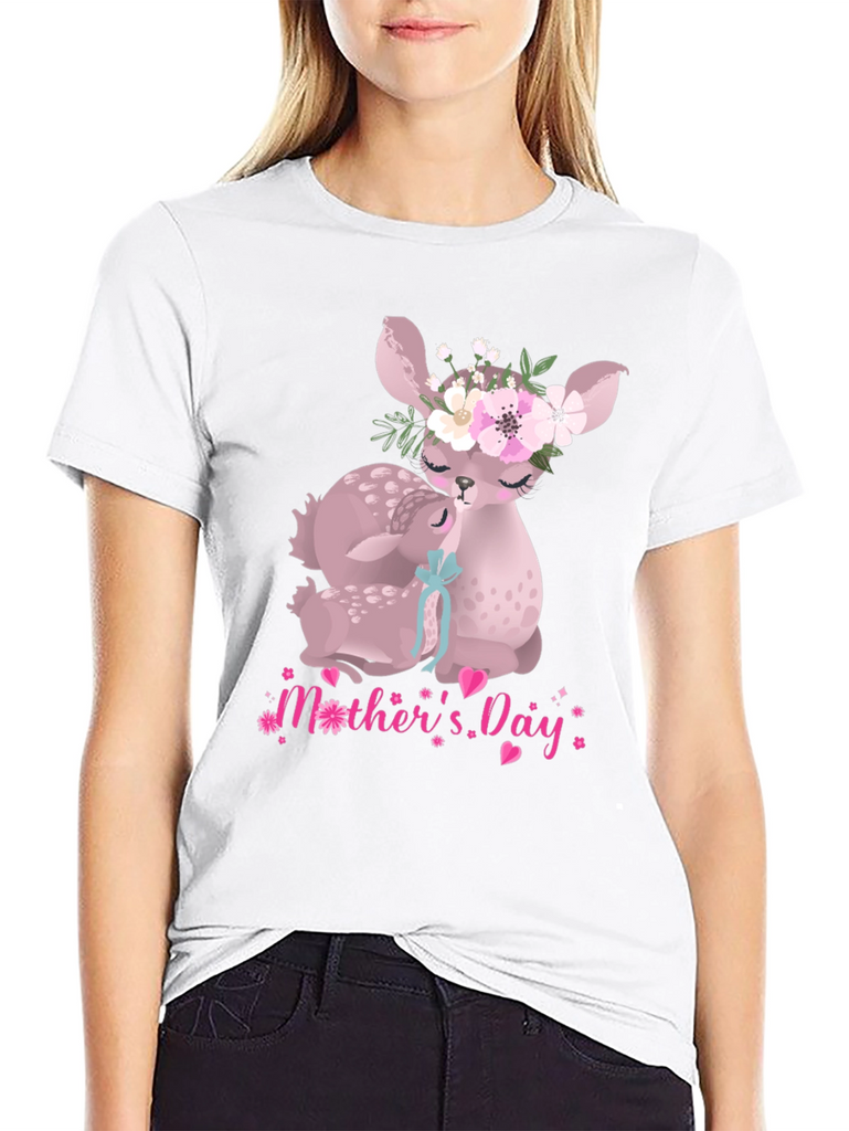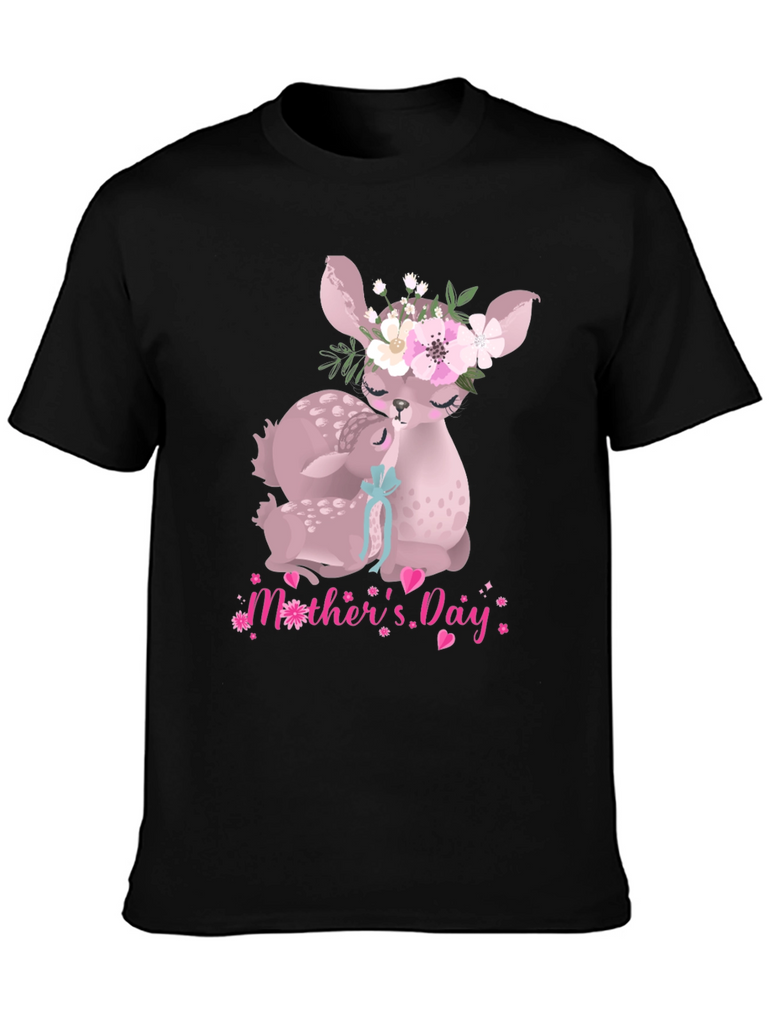 Celebrate Mother's Day with this adorable black T-shirt! Featuring a heartwarming graphic of a mama deer embracing her baby, both adorned with delicate flower crowns, this tee is perfect for showing your love. The design also includes a sweet "Mother's Day" message with heart accents. Crafted from comfortable fabric, it's ideal for everyday wear or as a thoughtful gift for the special mom in your life. A stylish and tender way to express your appreciation this Mother's Day!