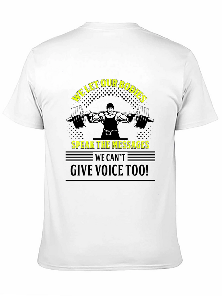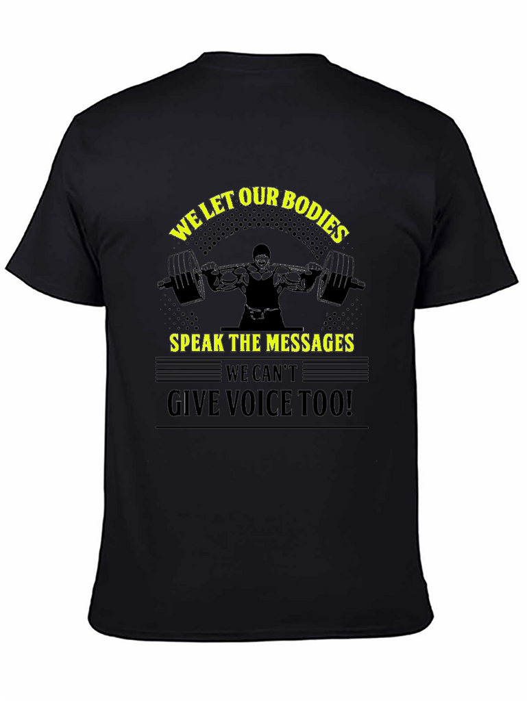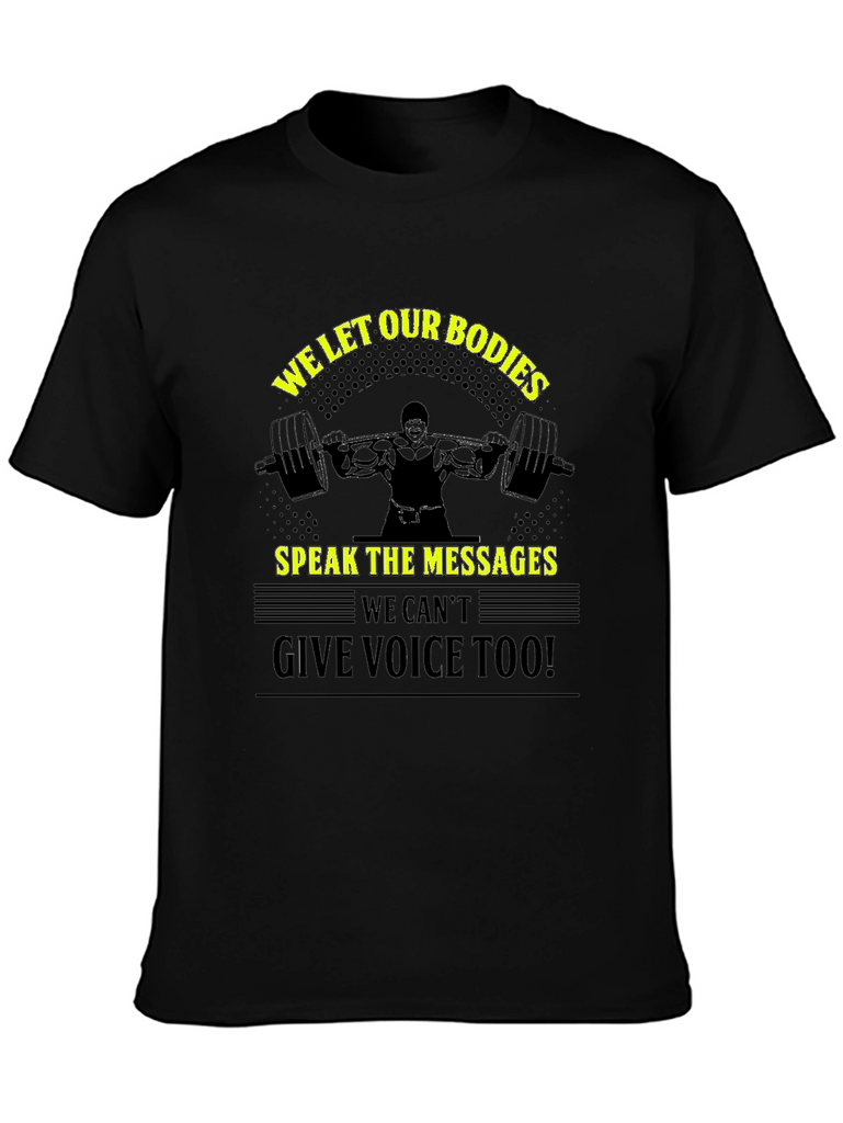 This stylish black t-shirt features a powerful motivational design for fitness enthusiasts. The shirt displays the text "WE LET OUR BODIES SPEAK THE MESSAGES WE CAN'T GIVE VOICE TOO!" in a bold yellow font, accompanied by a silhouette of a weightlifter. Made from comfortable fabric, this tee is perfect for workouts or casual wear. Show off your dedication to fitness and inspire others with this eye-catching design. It’s an excellent choice for gym sessions, casual outings, or as a gift for the bodybuilder. Make a statement and let your body do the talking! This shirt is sure to turn heads and spark conversations wherever you go.