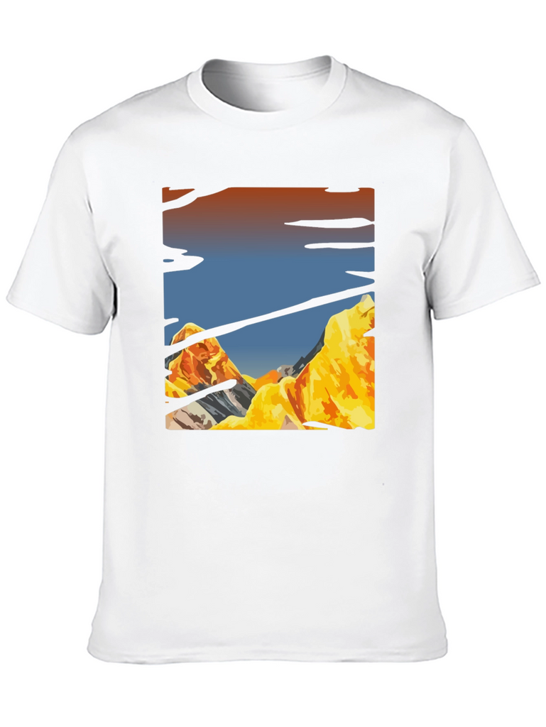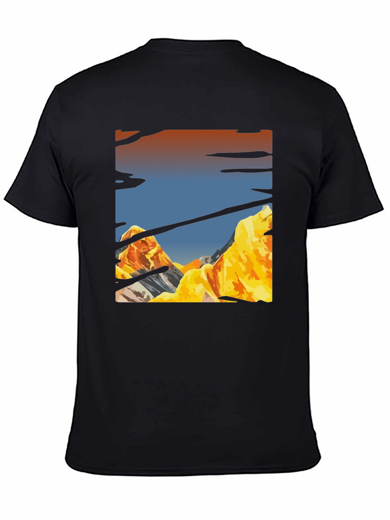 Elevate your casual style with this striking black t-shirt. Featuring a unique mountain landscape graphic print, this tee adds a touch of adventure to your everyday wardrobe. The design showcases rugged mountain peaks under a vibrant sky. Crafted from a soft, comfortable fabric, this shirt is perfect for all-day wear. Pair it with jeans or shorts for a relaxed yet stylish look. Ideal for outdoor enthusiasts and anyone who appreciates nature-inspired apparel, this t-shirt is sure to become a favorite. Express your adventurous spirit with this eye-catching graphic tee!