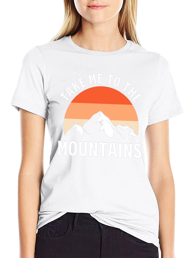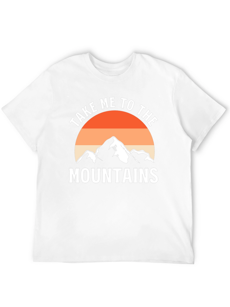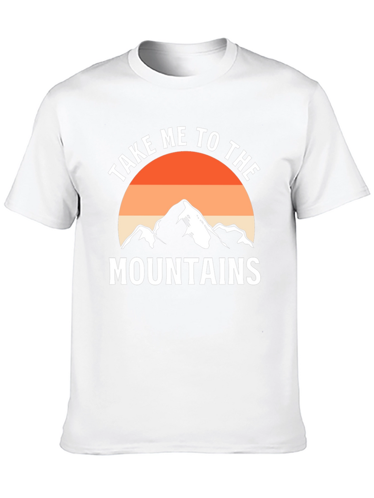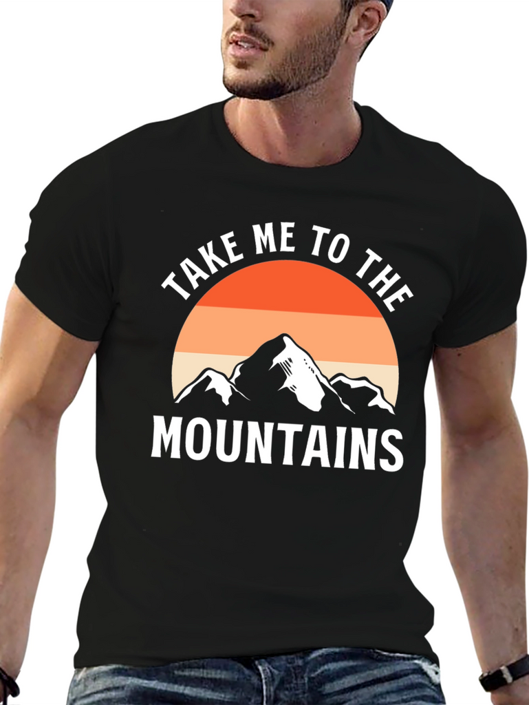 Embrace the call of the wild with this stylish black tee. Featuring a striking mountain graphic against a sunset backdrop, framed by the words 'Take Me To The Mountains'. This classic fit tee is perfect for outdoor lovers and adventurers. The print has white letters in a semi-circle arc. Pair it with jeans or hiking pants for a casual and cool look. Whether you're dreaming of your next hike or simply want to showcase your love for nature, this T-shirt is sure to be a favorite. This will become a staple for any wardrobe, the high quality design will keep you looking and feeling great all day long.