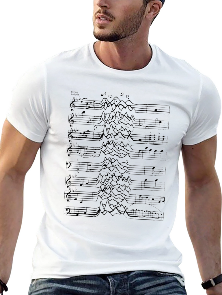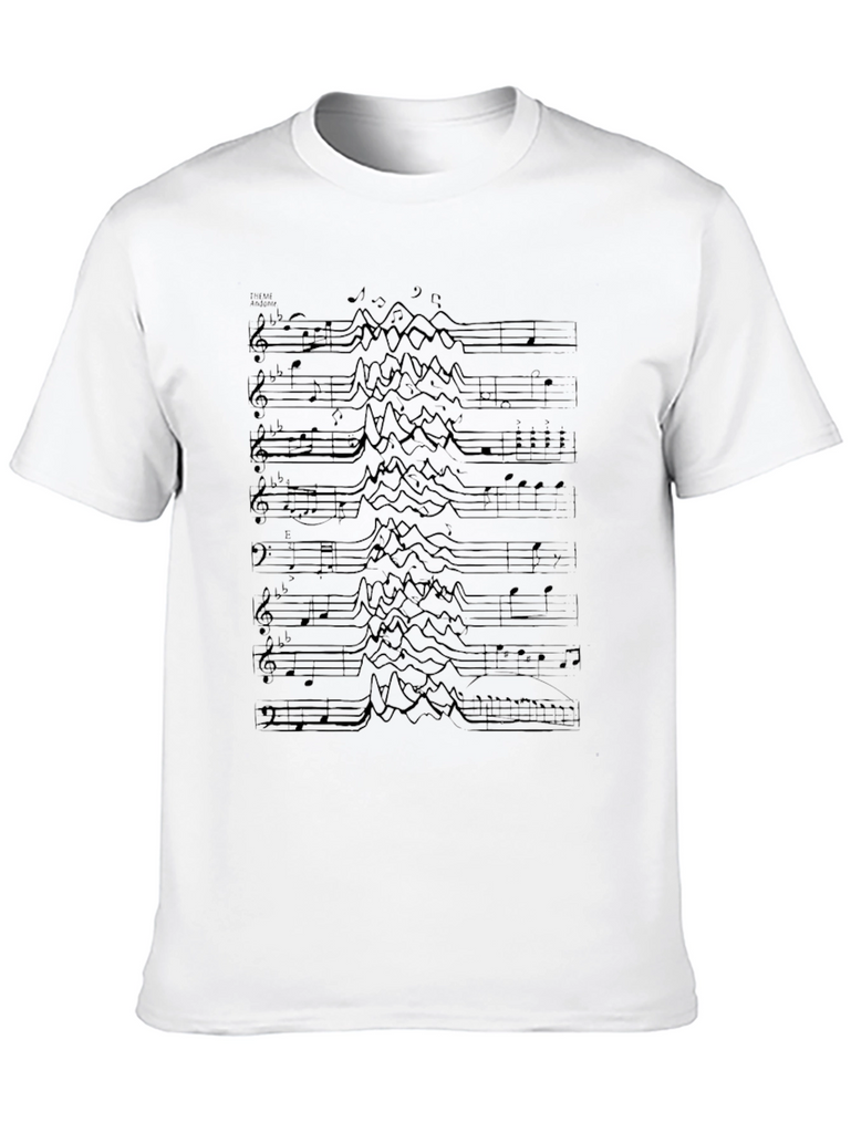 This stylish black t-shirt features a unique graphic design composed of musical notes. The intricate pattern adds a touch of artistic flair, making it perfect for music lovers and anyone who appreciates distinctive fashion. Made from a comfortable-looking fabric, this tee is ideal for everyday wear. Whether you're heading to a concert, hanging out with friends, or just relaxing at home, this shirt is sure to make a statement. Show off your passion for music with this eye-catching and comfortable t-shirt!
