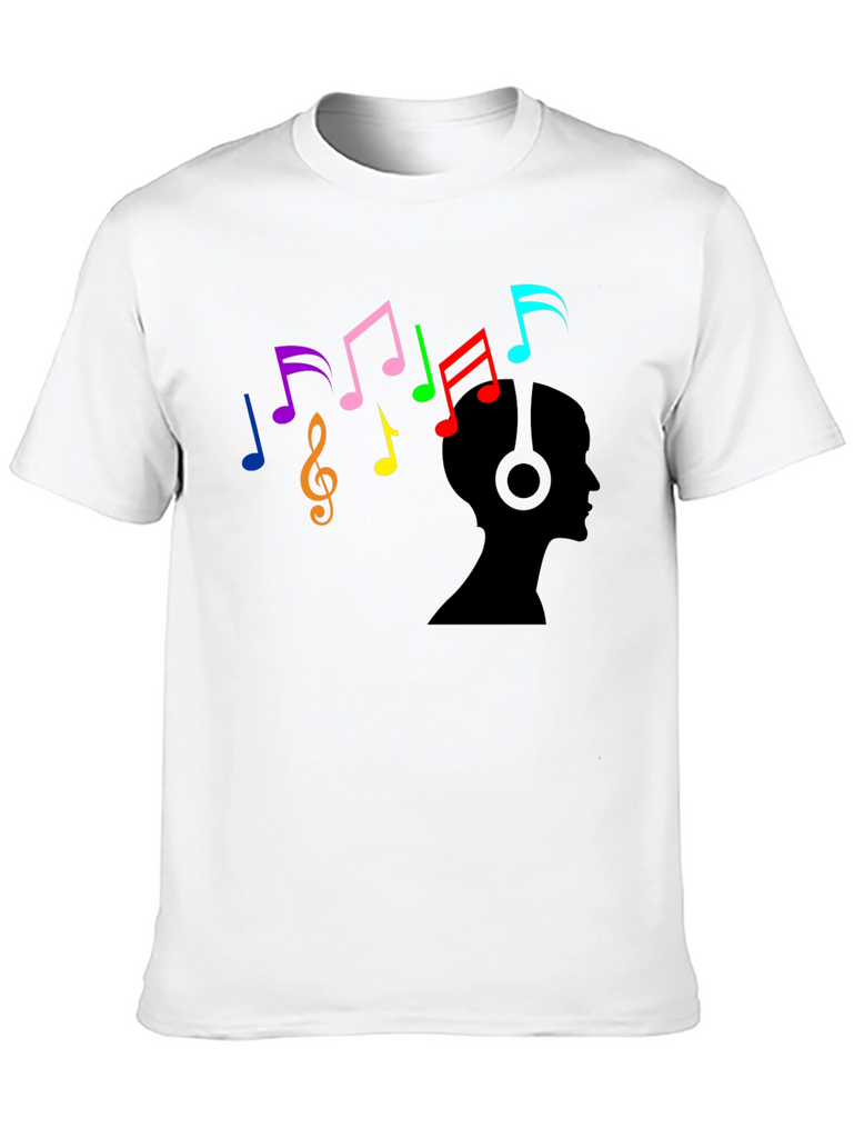 Express your love for music with this stylish black t-shirt. Featuring a silhouette of a person wearing headphones with colorful musical notes floating above, this tee is a fun and unique way to showcase your passion. Made from comfortable cotton material, it's perfect for everyday wear, music festivals, concerts, or just hanging out with friends. The vibrant musical notes add a playful touch to the classic black backdrop, making it a standout piece in any wardrobe. Get yours today and let the world know you're always in tune!