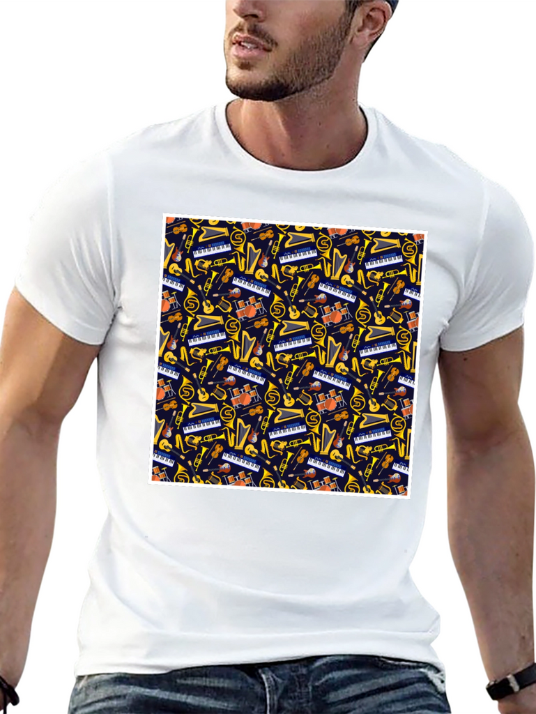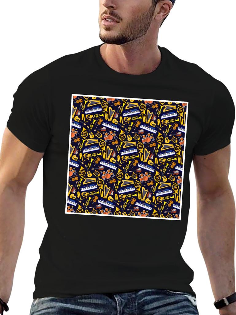 Show off your love for music with this unique t-shirt! Featuring a fun and vibrant pattern of various musical instruments such as pianos, guitars, trumpets, and more, this shirt is sure to catch the eye. Made from a soft and comfortable fabric, this tee is perfect for casual wear, music events, or as a gift for the music lover in your life. This eye-catching tee is a fun addition to any wardrobe. Order yours today and let the music speak!