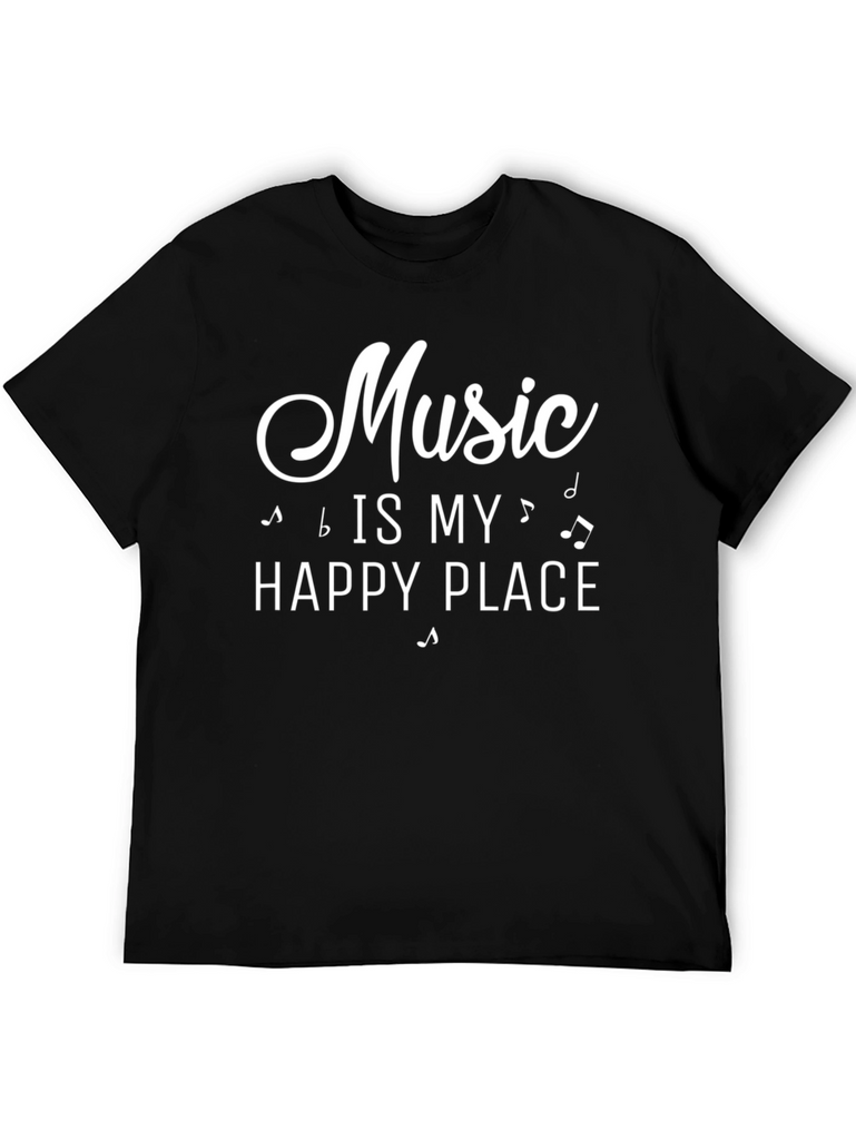 Express your love for music with this stylish black T-shirt. Featuring the catchy phrase "Music is My Happy Place" in a bold, white font, this tee is perfect for music lovers of all kinds. The design includes musical notes for extra flair. Made from comfortable fabric, this shirt is perfect for everyday wear, concerts, music festivals, or simply lounging around. It's a great way to show off your passion for music and start conversations with fellow enthusiasts. Get yours today and wear your happy place!