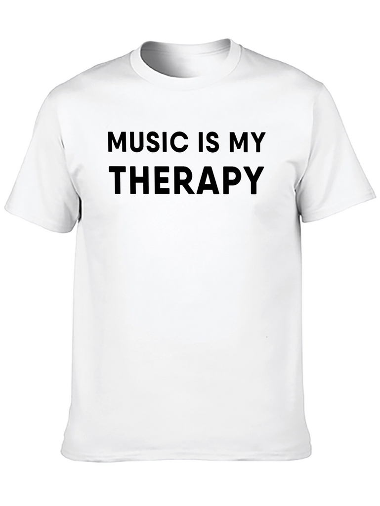 Showcase your love for music with this stylish black t-shirt. Featuring the statement "Music Is My Therapy" in bold lettering, this tee is perfect for musicians and music lovers alike. The classic crew neck and short sleeves make it a comfortable and versatile choice for everyday wear. Crafted from a soft-looking fabric, this shirt will keep you feeling good all day long. This T-shirt makes a great addition to your wardrobe. Get yours today!