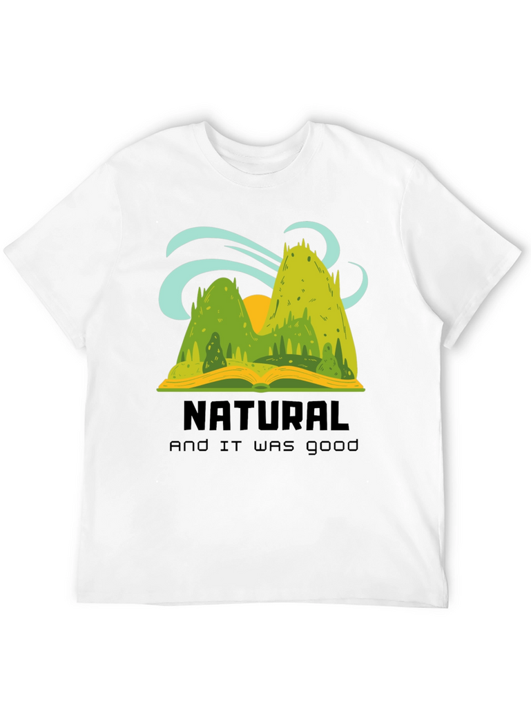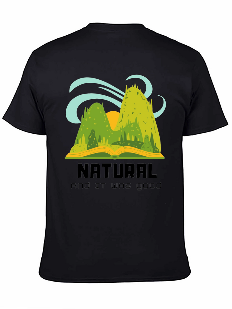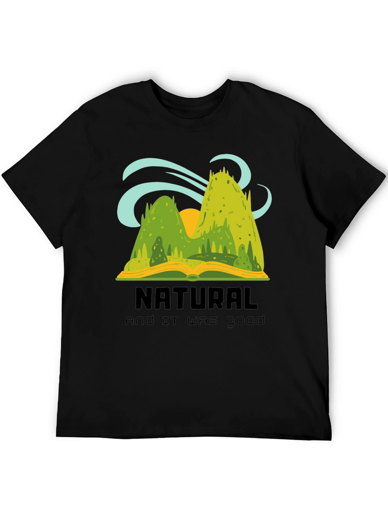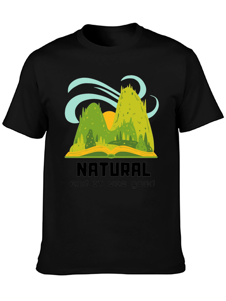 Embrace your love for the natural world with this unique graphic tee. The design features a whimsical illustration of a landscape emerging from an open book, complete with rolling hills, trees, and gentle wind. The word "NATURAL" is prominently displayed, along with "And it was good" beneath it, conveying a love for nature. Perfect for casual wear, hiking, or expressing your appreciation for the great outdoors. Made from comfortable material, this shirt is sure to become a staple in your wardrobe. Available in black. Great conversation starter and comfy to wear!