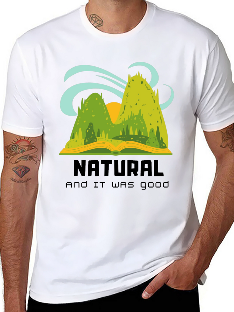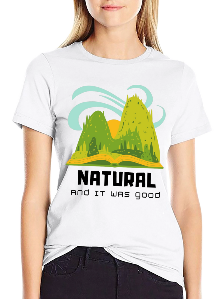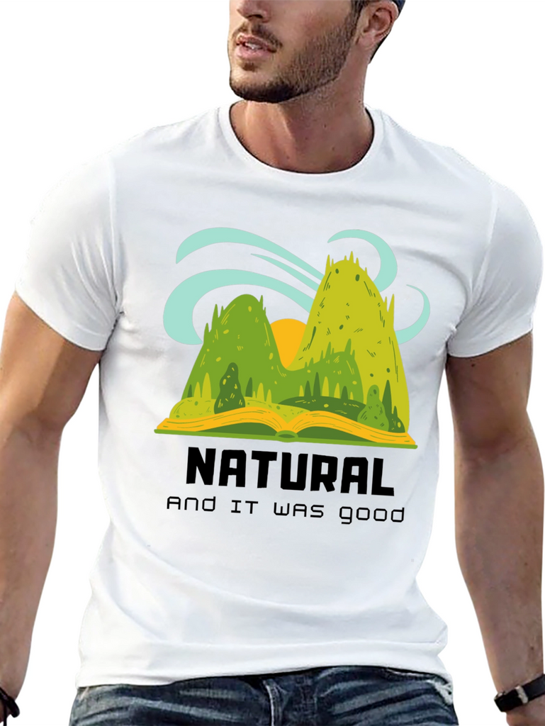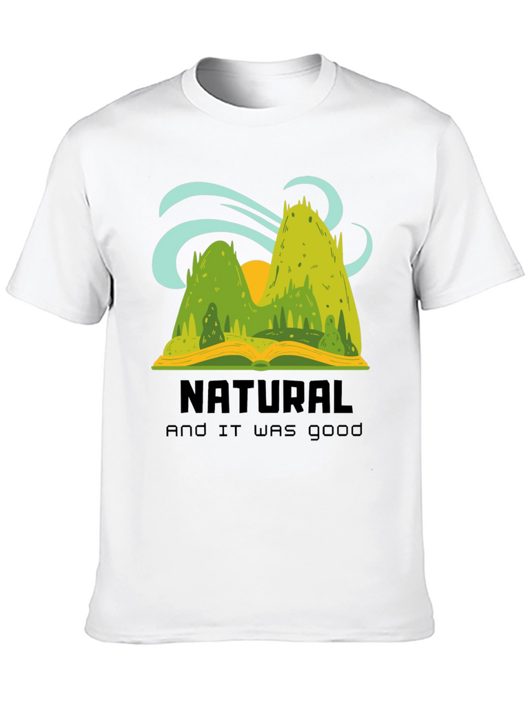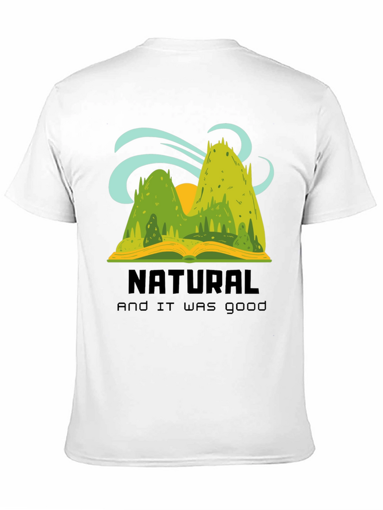 Embrace your love for the natural world with this unique graphic tee. The design features a whimsical illustration of a landscape emerging from an open book, complete with rolling hills, trees, and gentle wind. The word "NATURAL" is prominently displayed, along with "And it was good" beneath it, conveying a love for nature. Perfect for casual wear, hiking, or expressing your appreciation for the great outdoors. Made from comfortable material, this shirt is sure to become a staple in your wardrobe. Available in black. Great conversation starter and comfy to wear!