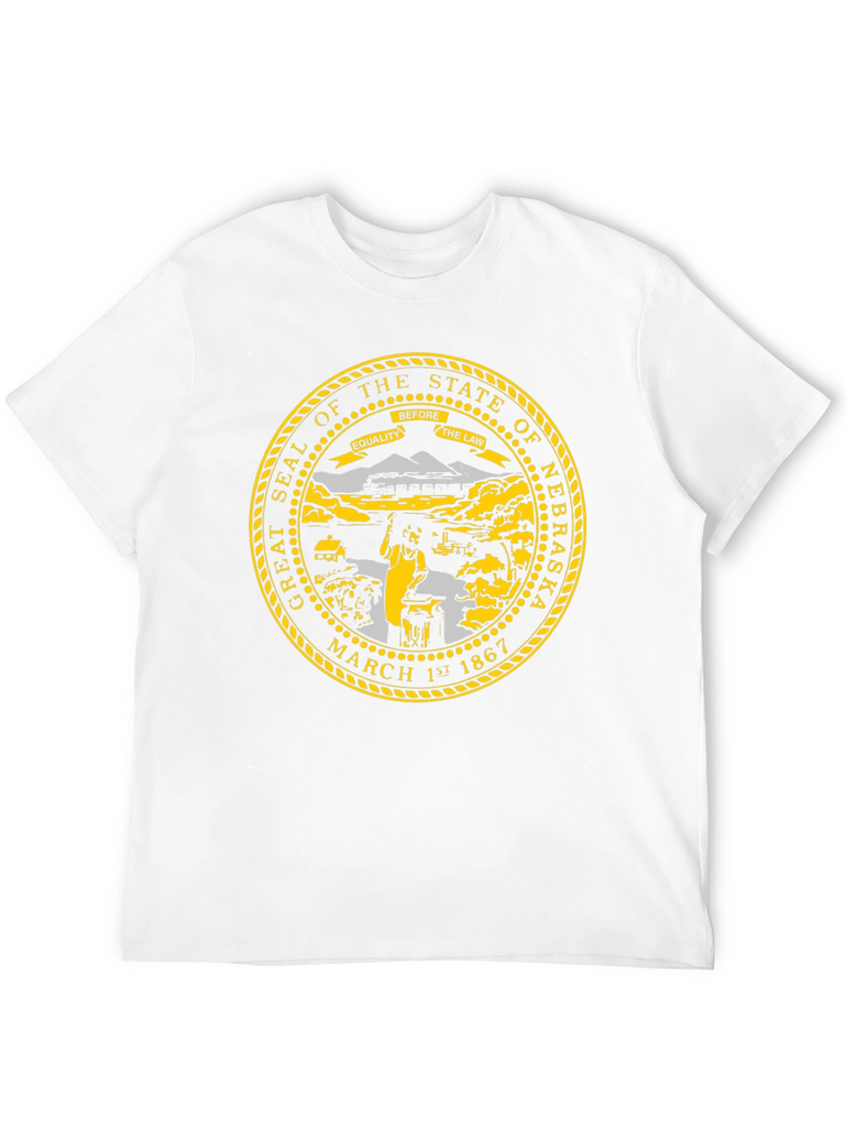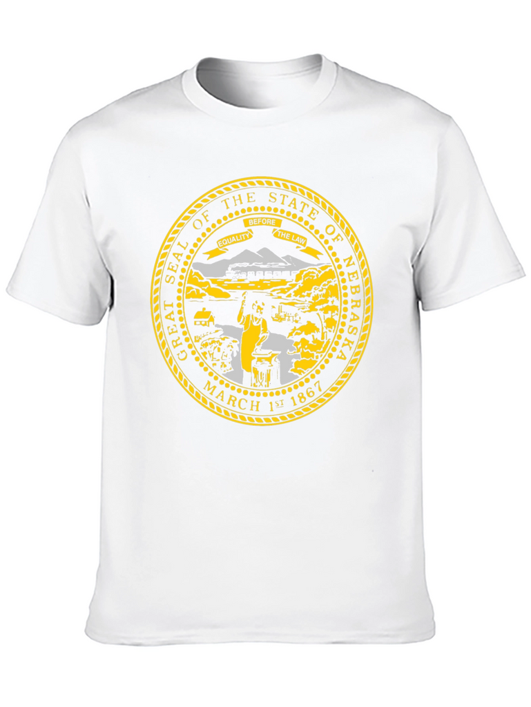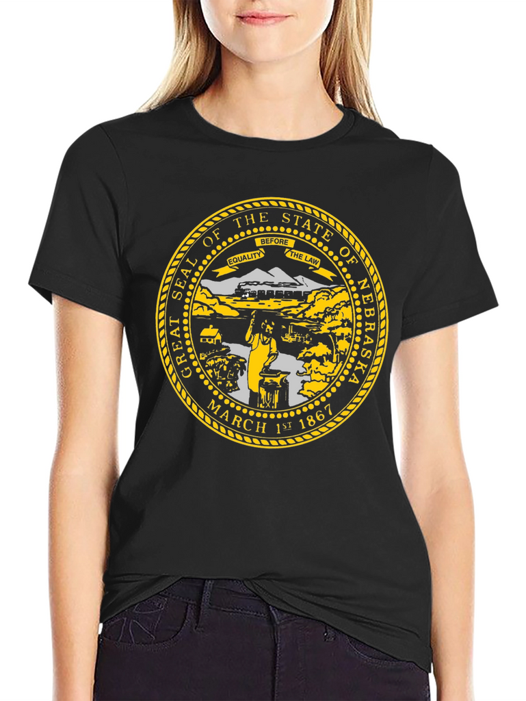 Show your Nebraska pride with this classic graphic tee! This black t-shirt features a detailed print of the Great Seal of the State of Nebraska, complete with its historic imagery and motto. Made from a comfortable and durable fabric, this shirt is perfect for everyday wear. The design is printed clearly and makes a statement without being too loud. Ideal for casual outings, campus wear, or as a thoughtful gift for native Nebraskans or anyone who loves the Cornhusker State. Its relaxed fit ensures comfort, making it a staple piece in any wardrobe. Wear your Nebraska roots with pride!