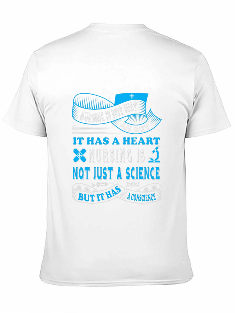 Show your appreciation for nurses with this unique black graphic t-shirt. The design features the message "Nursing is not just an art, it has a heart, nursing is not just a science, but it has a conscience." The text is rendered in a visually appealing way with some words highlighted in a vibrant blue color. The artwork incorporates nursing-related symbols such as a nurse's cap and medical icons, adding a touch of authenticity. This tee is perfect for nurses, nursing students, or anyone who wants to acknowledge the important role of nurses. A comfortable way to make a statement.