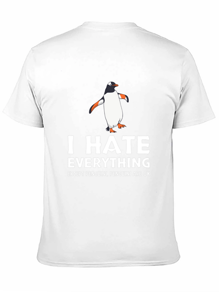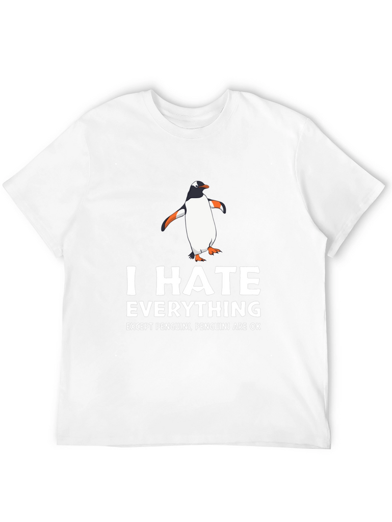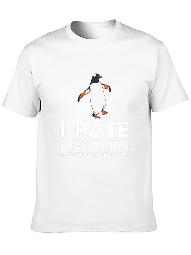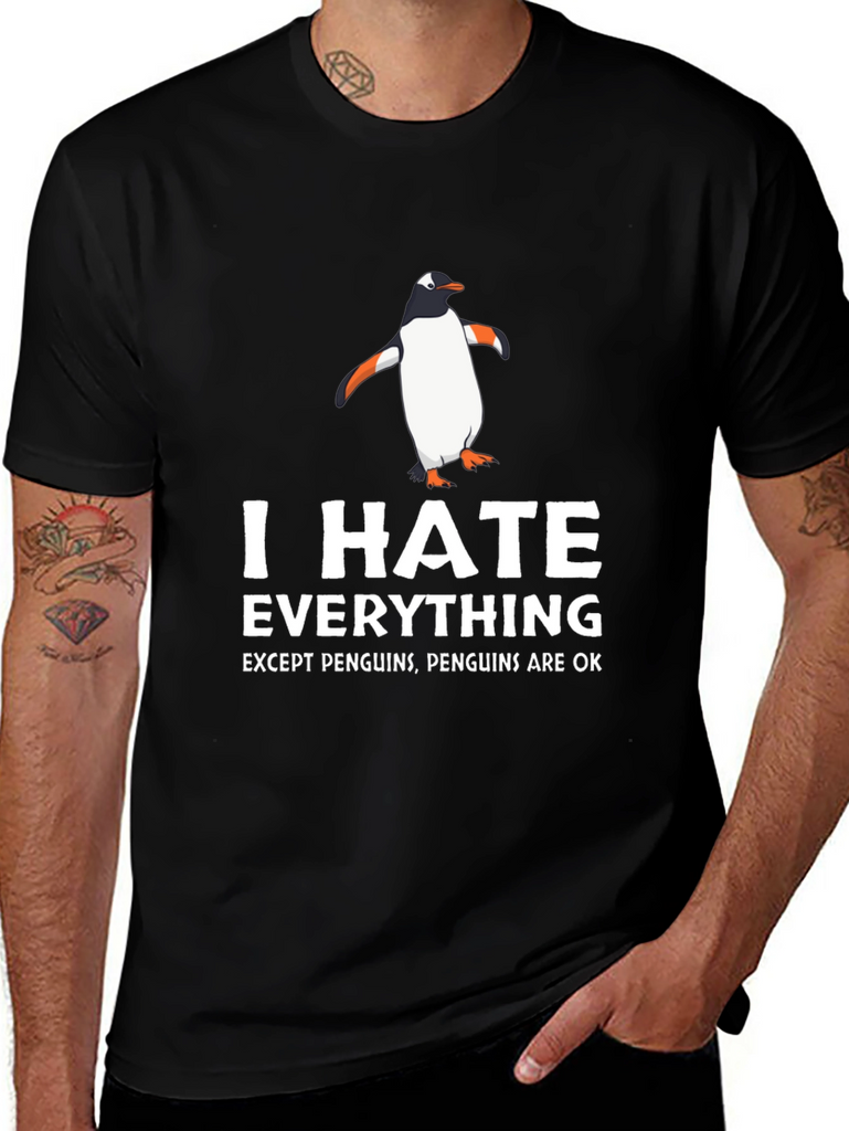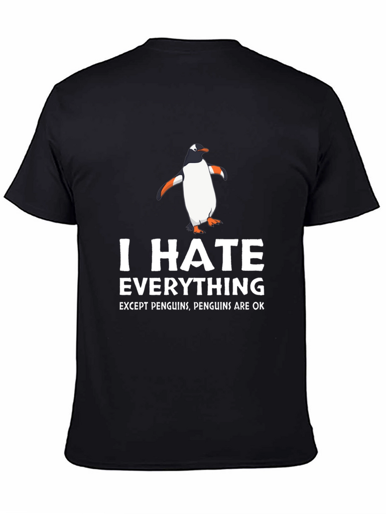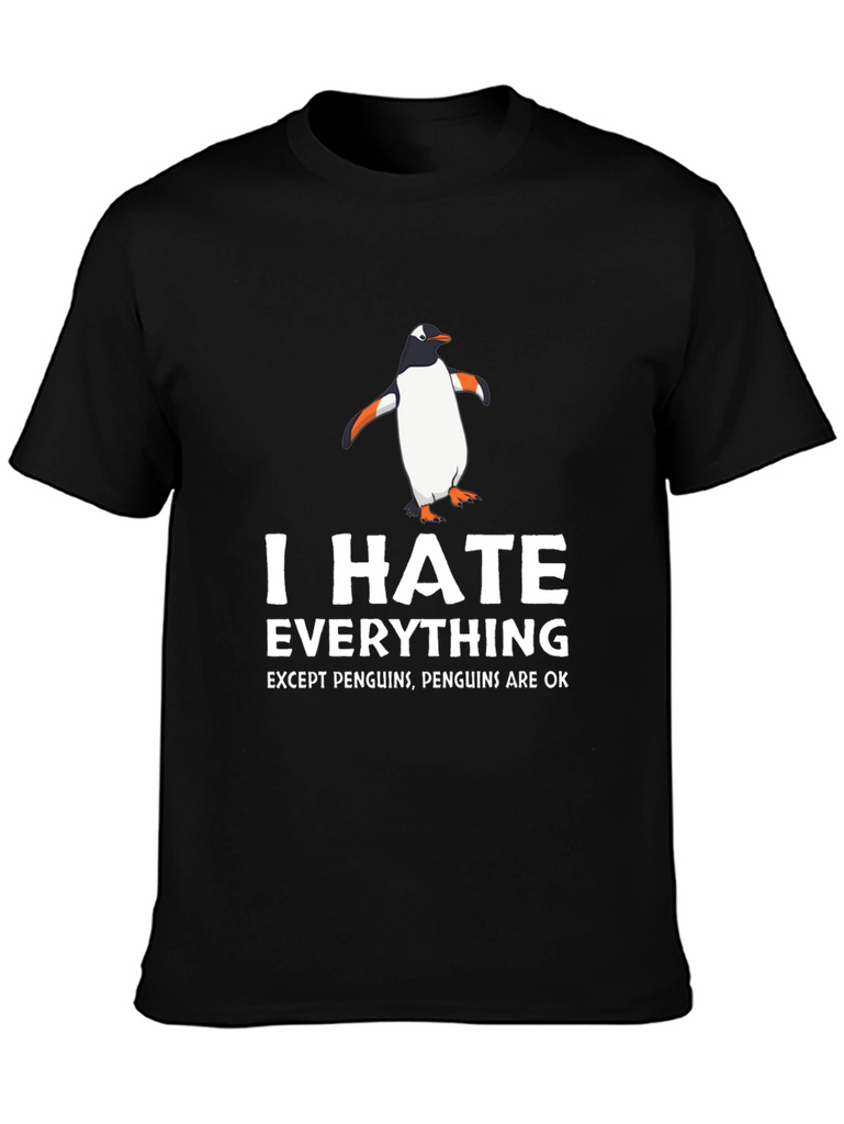 Showcase your unique sense of humor with this eye-catching black t-shirt. Featuring a playful design with a cartoon penguin and bold white text that reads "I HATE EVERYTHING EXCEPT PENGUINS, PENGUINS ARE OK", this tee is a fun way to express yourself. Made from a comfortable-looking fabric, it's perfect for everyday wear. Ideal for casual outings, lounging at home, or as a quirky gift for the penguin enthusiast in your life. Grab yours today and let the world know where you stand!
