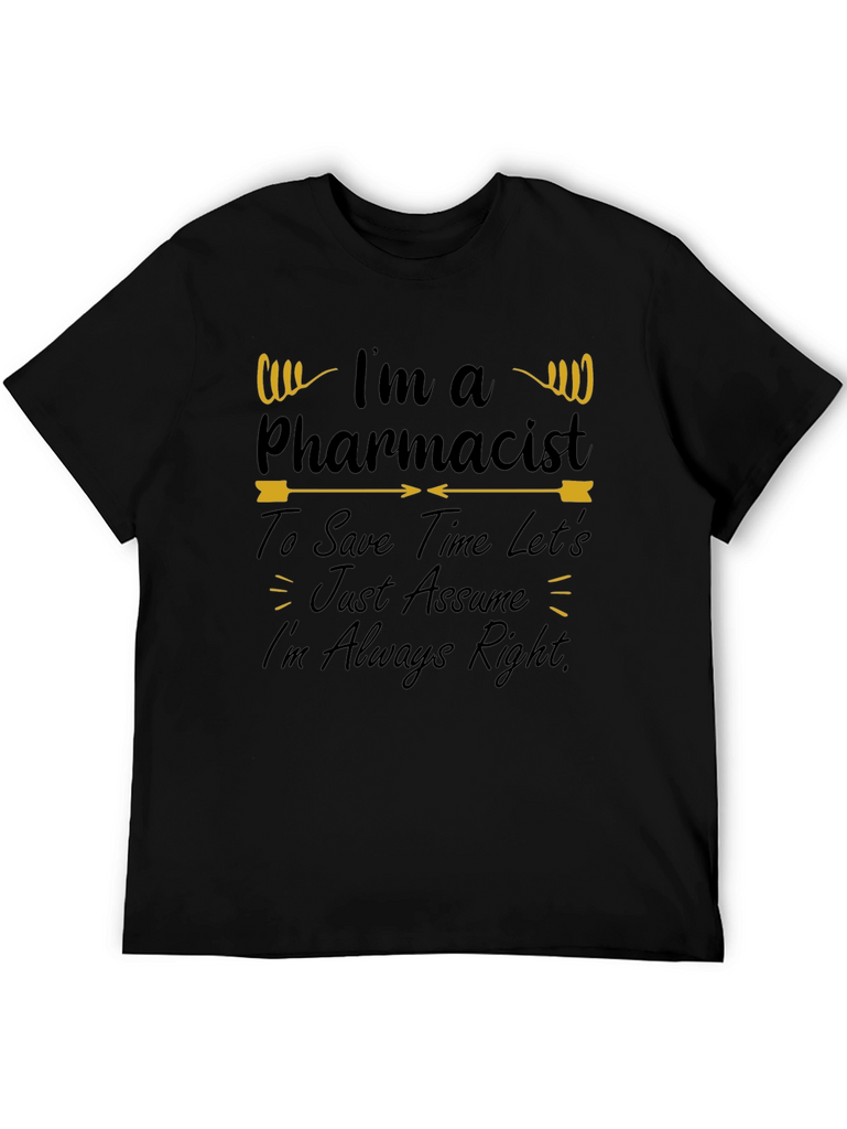 This black t-shirt features a humorous design for pharmacists. The phrase "I'm a Pharmacist To Save Time Let's Just Assume I'm Always Right" is printed in an appealing script font. The design includes decorative elements that add visual interest. It's a comfortable and stylish way for pharmacists to showcase their profession with a touch of humor. The t-shirt is ideal for casual wear, pharmacy events, or as a thoughtful gift for any pharmacist with a sense of humor. The design is bold and clear, ensuring that the message is easily readable and impactful.
