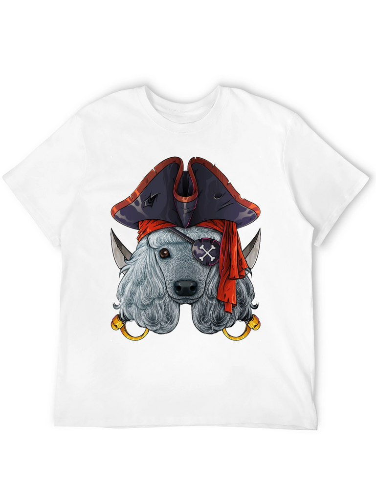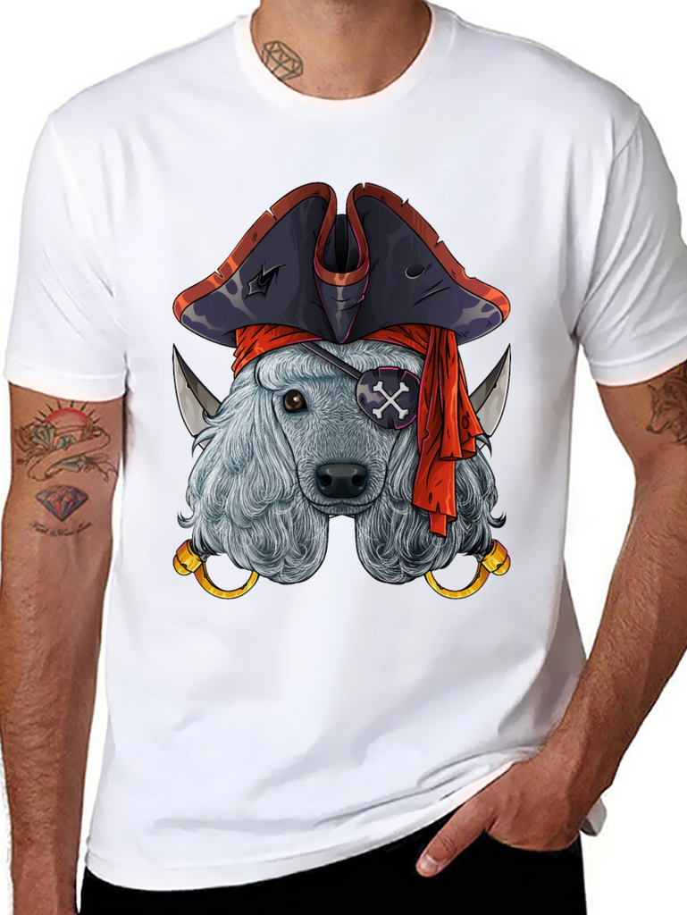 Ahoy, matey! This black t-shirt features a whimsical graphic of a poodle dressed as a pirate. The dog sports a classic pirate hat, an eye patch with a skull and crossbones, and a red bandana. Golden hoop earrings and two daggers add to the piratical theme. The shirt is a comfortable, casual wear item, perfect for dog lovers and pirate enthusiasts alike. Wear it to casual outings, themed parties, or simply show off your unique sense of style. This eye-catching design is sure to turn heads and spark conversations.