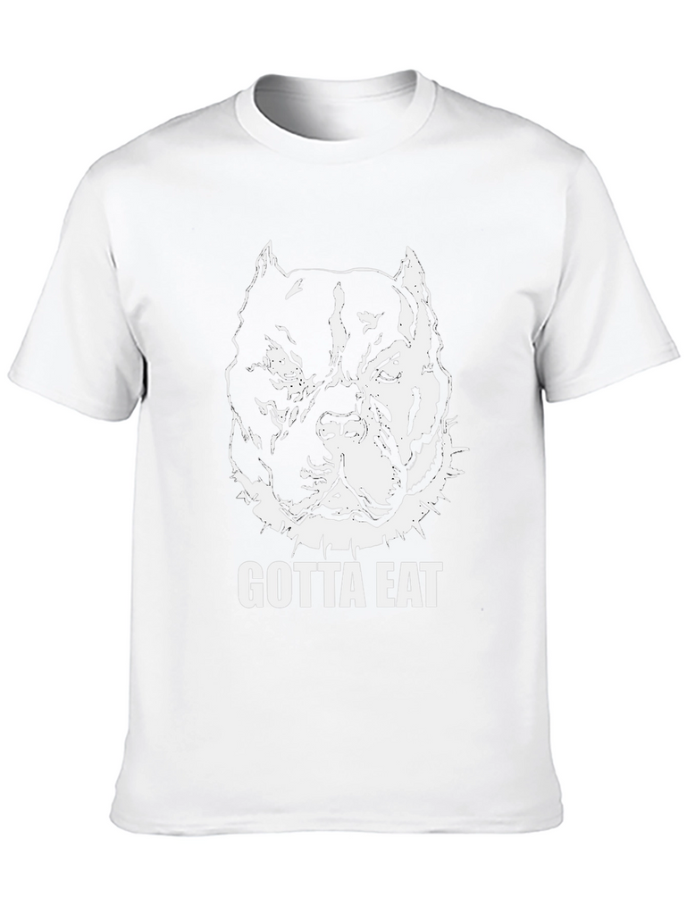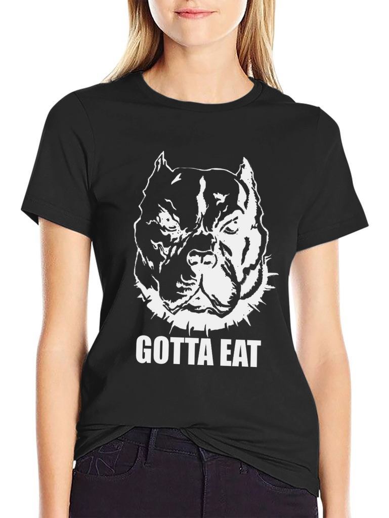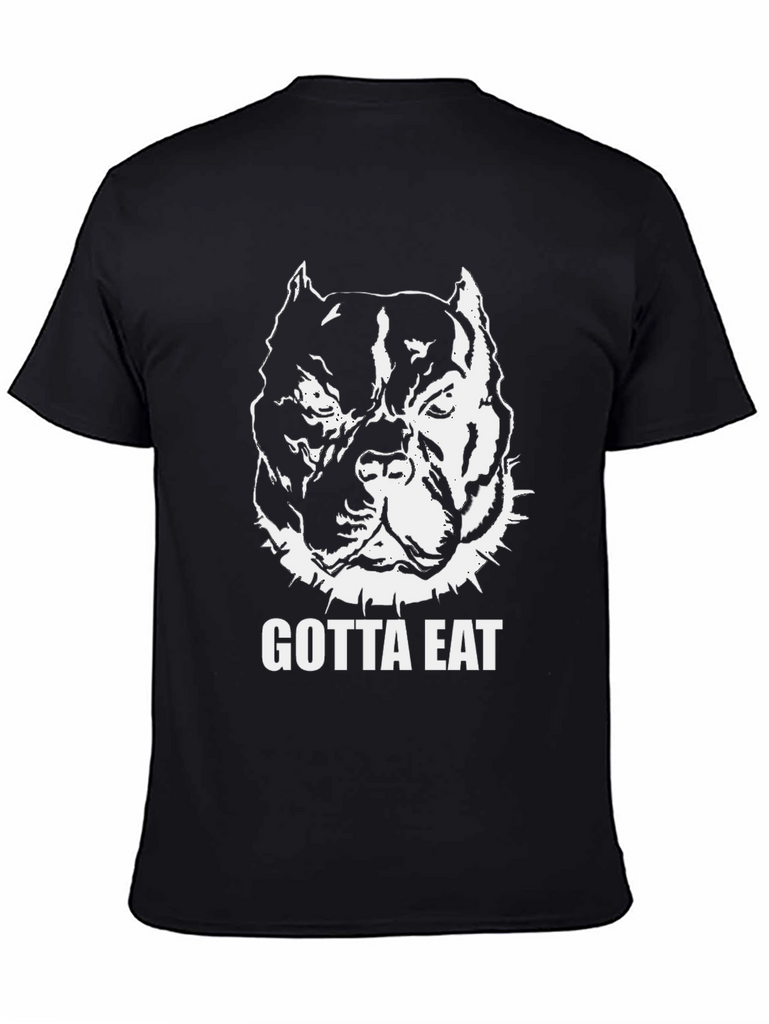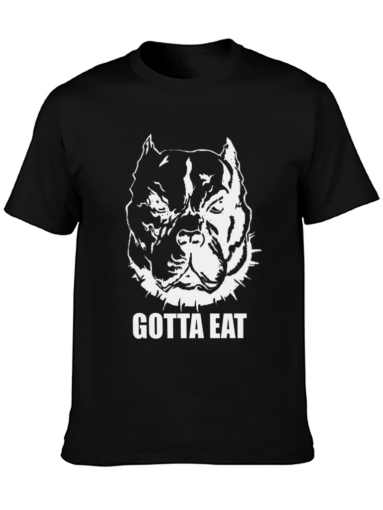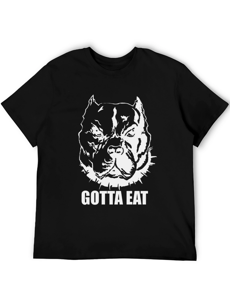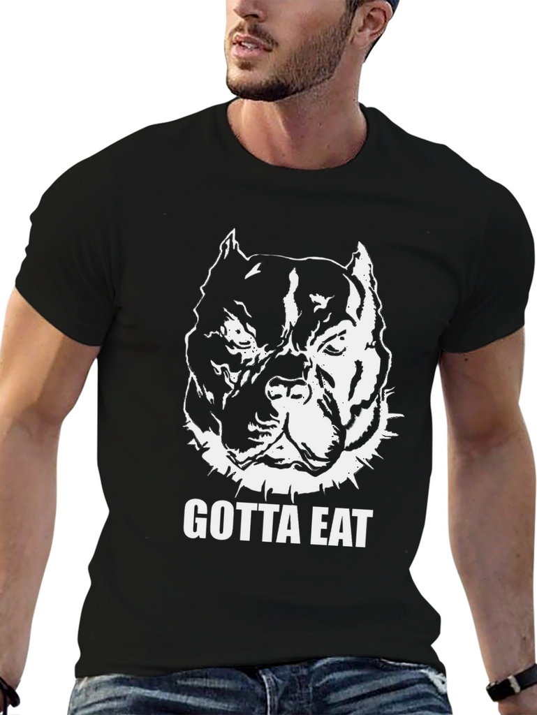 Show off your love for pitbulls with this bold, black graphic t-shirt. The tee features a striking white illustration of a muscular pitbull head, complete with a spiked collar, and the words "GOTTA EAT" in a strong, clear font. Made from what appears to be comfortable cotton fabric, this shirt offers a classic fit that's perfect for everyday wear. Its eye-catching design makes it ideal for casual outings, gym sessions, or simply relaxing at home. A must-have for any pitbull enthusiast looking to make a statement!