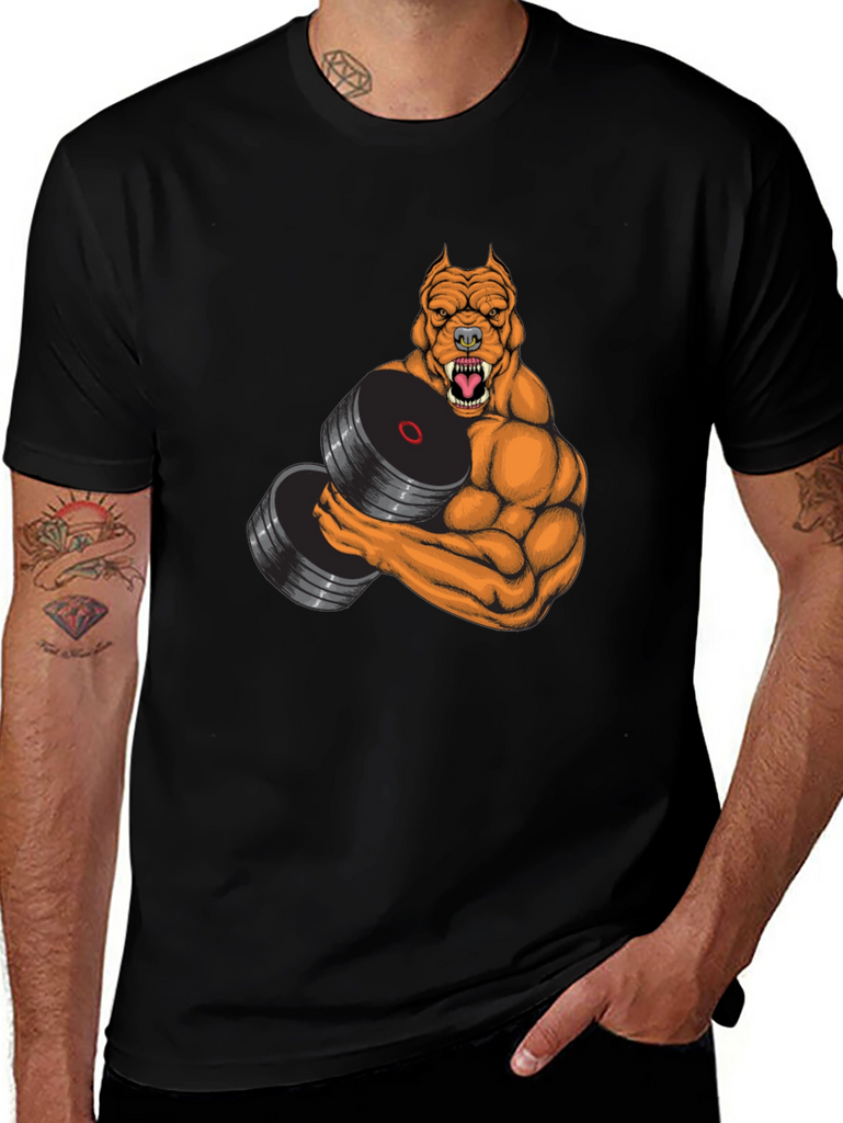 Show off your love for dogs and fitness with this unique black t-shirt. This shirt features a striking graphic of a muscular, orange pitbull lifting weights. The fierce expression and detailed musculature of the dog make for a bold design. Made from soft fabric, this shirt offers both comfort and durability. It's perfect for workouts, casual outings, or simply lounging around. Express your personality and passion with this one-of-a-kind tee. Makes a great gift for dog lovers and fitness enthusiasts.