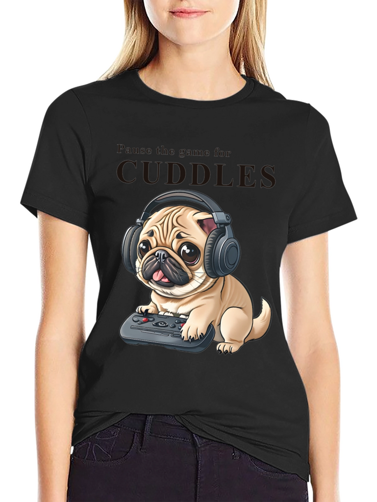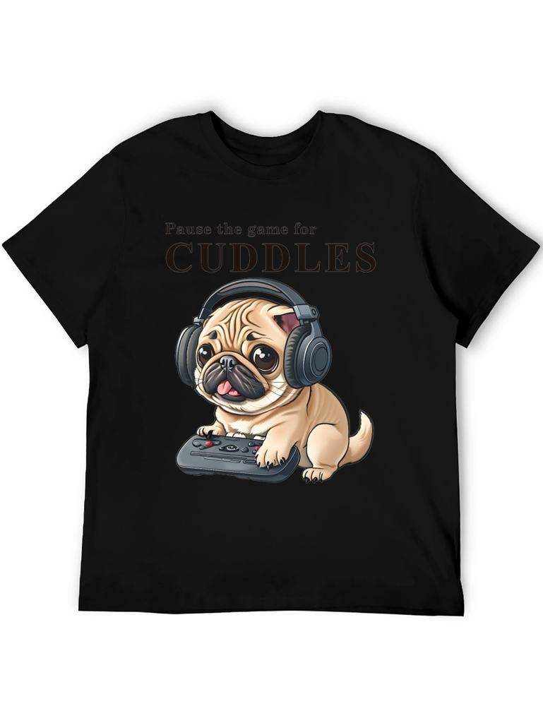 Show off your love for pugs and gaming with this unique black t-shirt! The design features an adorable pug wearing headphones and holding a game controller, ready for a marathon gaming session. Made from comfortable fabric, this tee is perfect for casual wear, gaming nights, or just lounging around. The cool graphic print is sure to turn heads and spark conversations. Grab this tee and let everyone know you're a proud pug lover and a dedicated gamer!