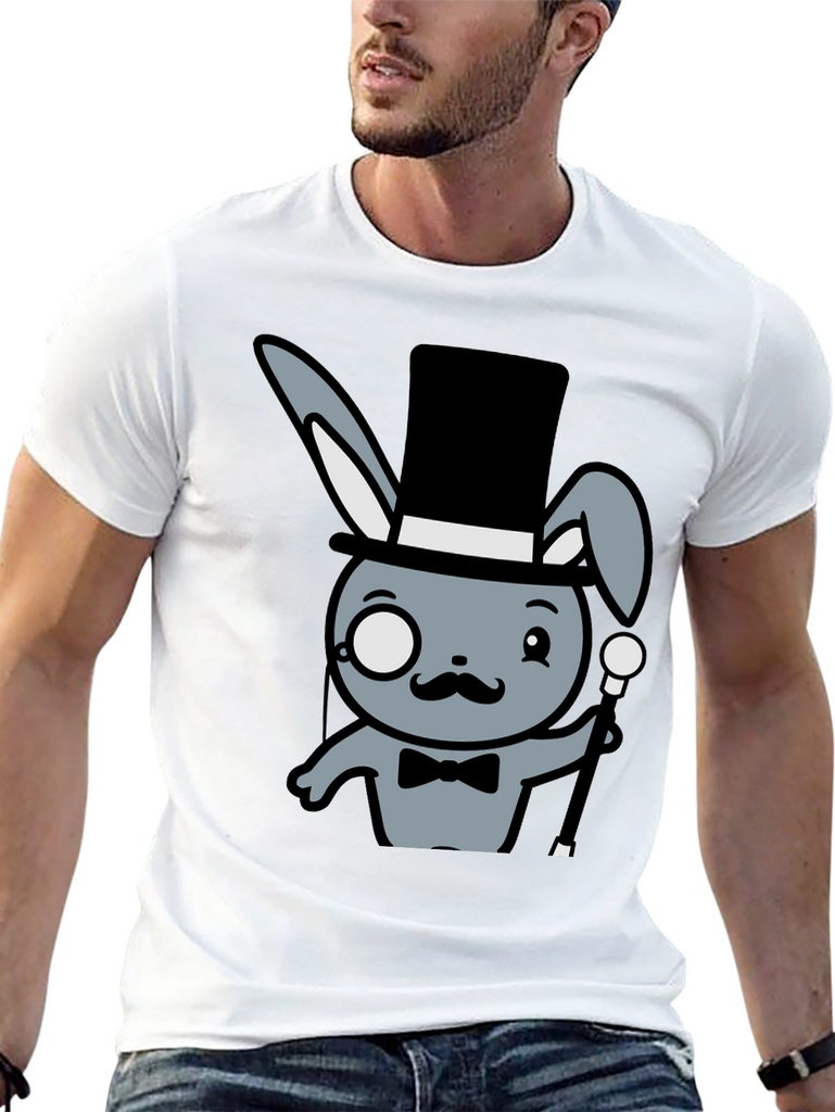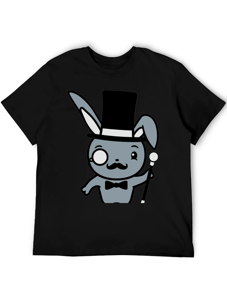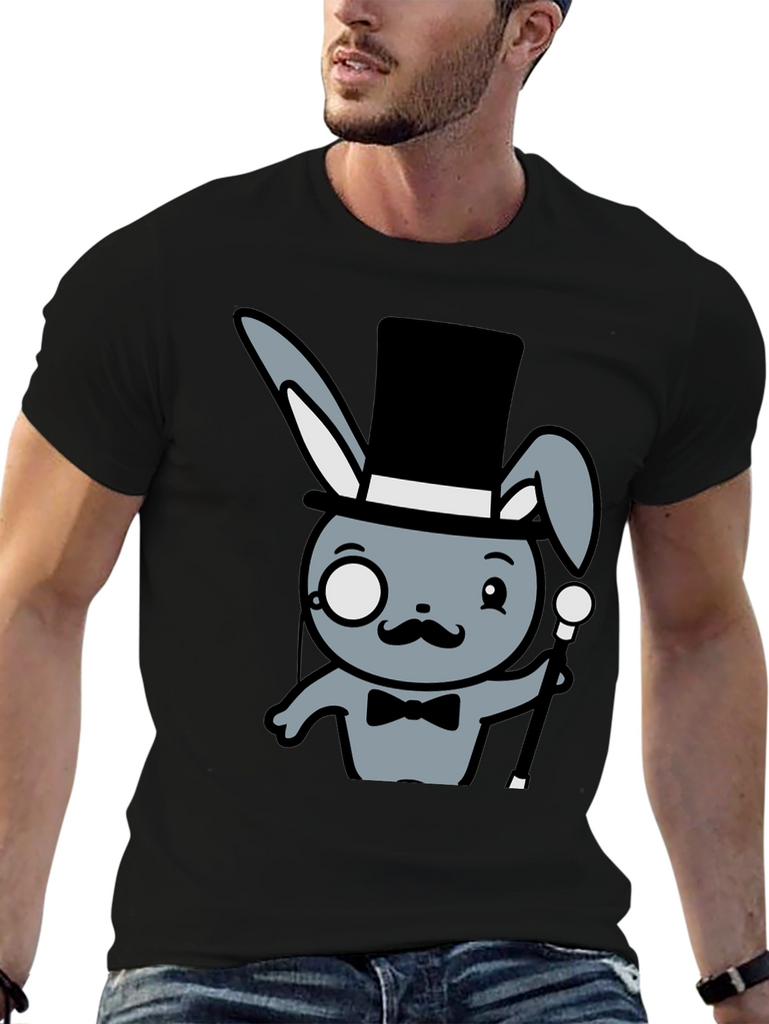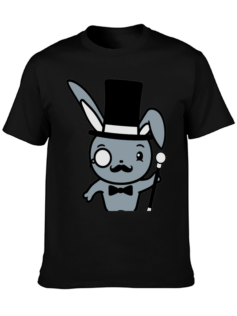 Show off your quirky style with this unique t-shirt! This black tee features a cartoon rabbit wearing a top hat, bowtie, and monocle while holding a cane. This shirt is sure to grab attention and start conversations. This tee combines comfort and style effortlessly. Wear it to casual gatherings, themed parties, or simply for adding a touch of whimsy to your day. It's a fun, fashionable way to express your unique personality.