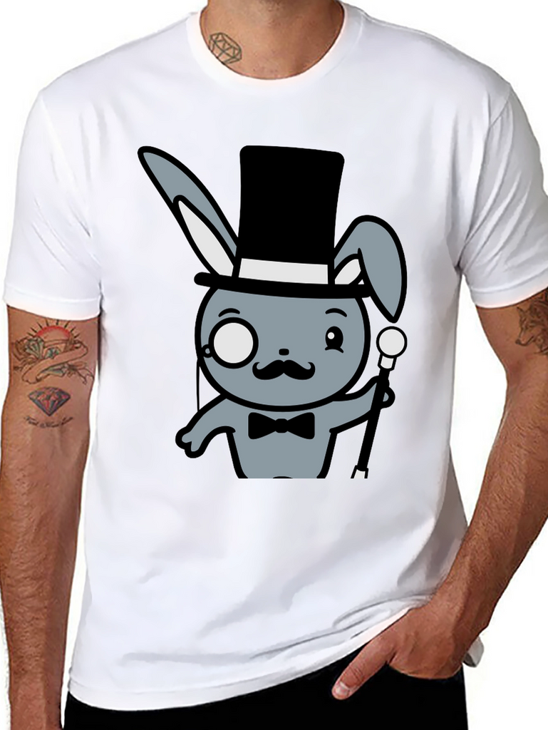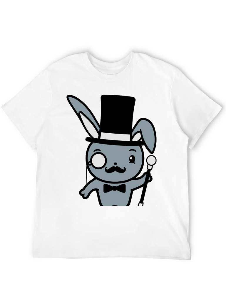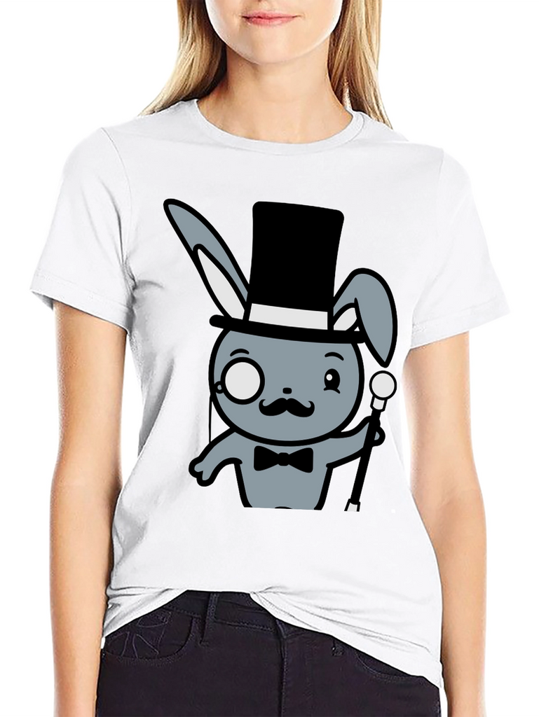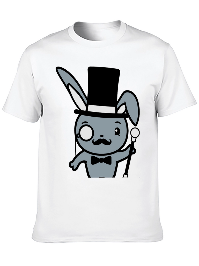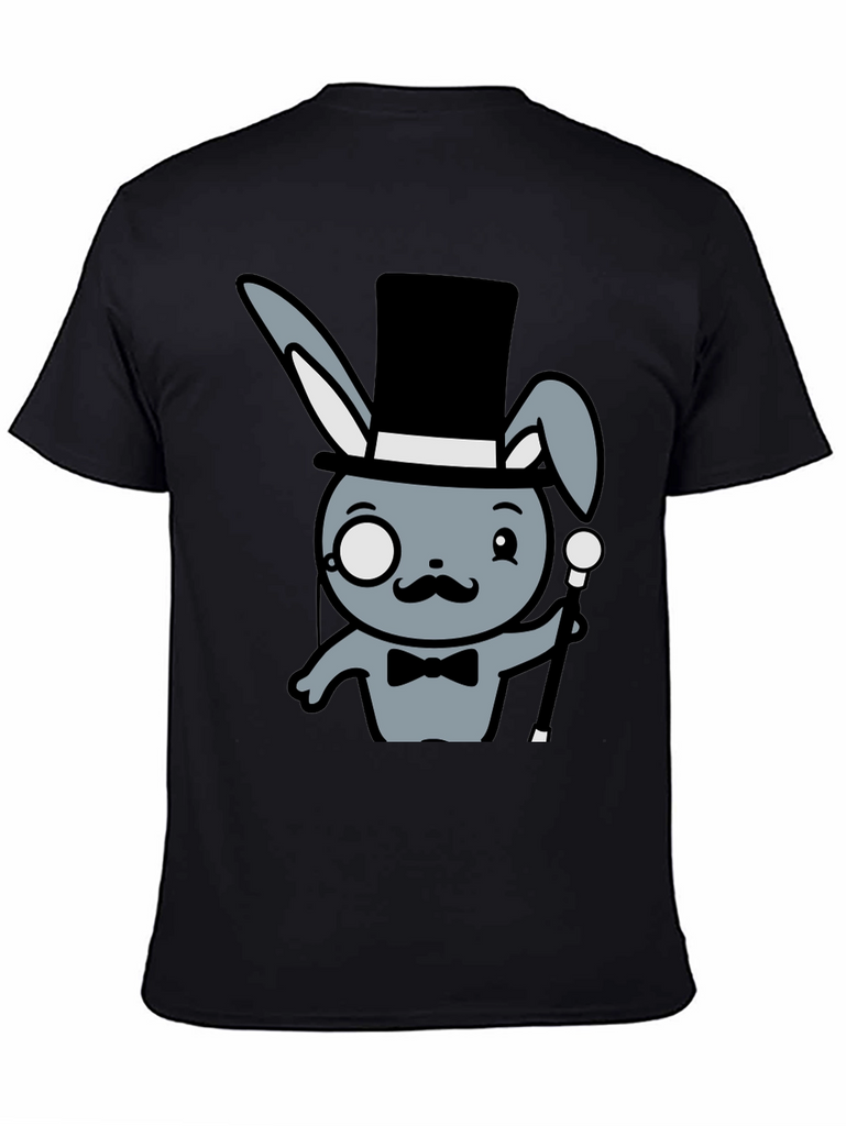 Show off your quirky style with this unique t-shirt! This black tee features a cartoon rabbit wearing a top hat, bowtie, and monocle while holding a cane. This shirt is sure to grab attention and start conversations. This tee combines comfort and style effortlessly. Wear it to casual gatherings, themed parties, or simply for adding a touch of whimsy to your day. It's a fun, fashionable way to express your unique personality.