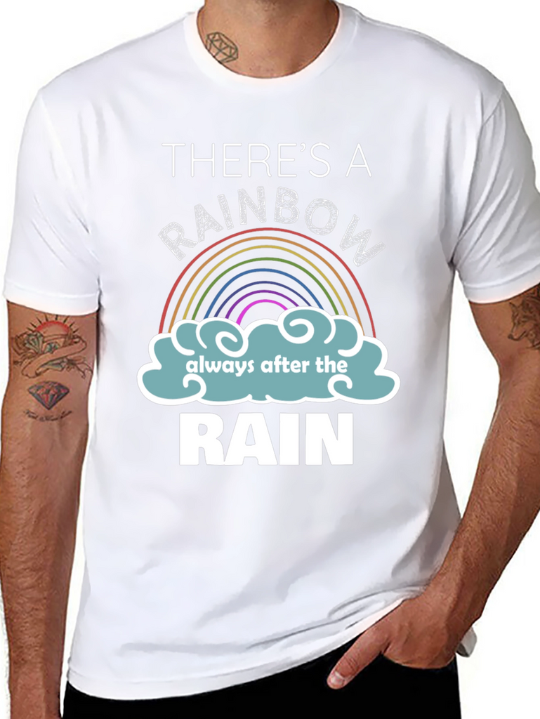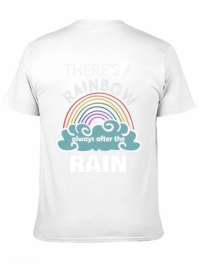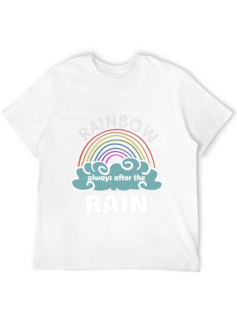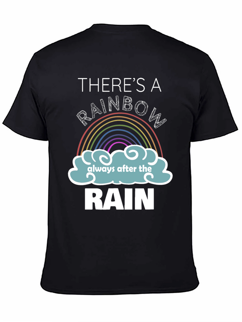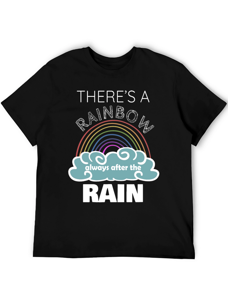 Embrace positivity with this stylish black t-shirt featuring a colorful rainbow graphic. Above the rainbow, the phrase "There's a" is printed. Below the rainbow, a cloud sits with the words "always after the". Underneath the cloud, the shirt is completed with the word "Rain" printed in bold white font. Made from comfortable material, this tee is perfect for everyday wear and a great conversation starter about hope and resilience. Ideal for casual outings, layering under jackets, or simply relaxing at home. Show your optimistic side with this eye-catching and inspiring t-shirt!