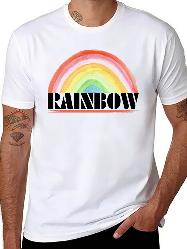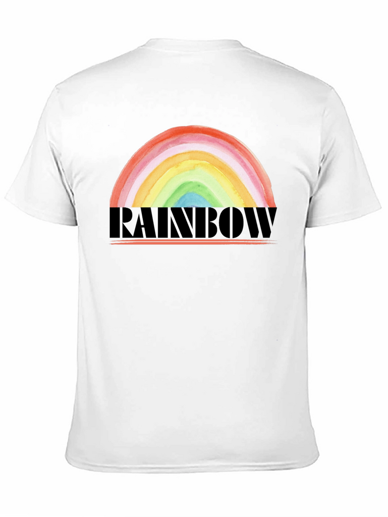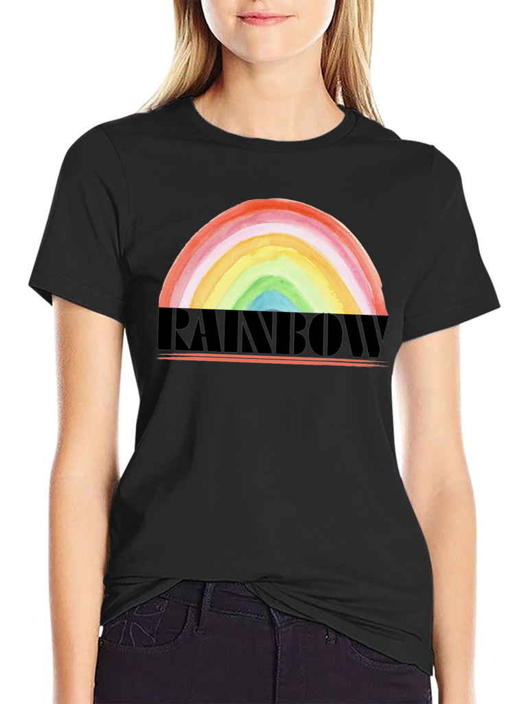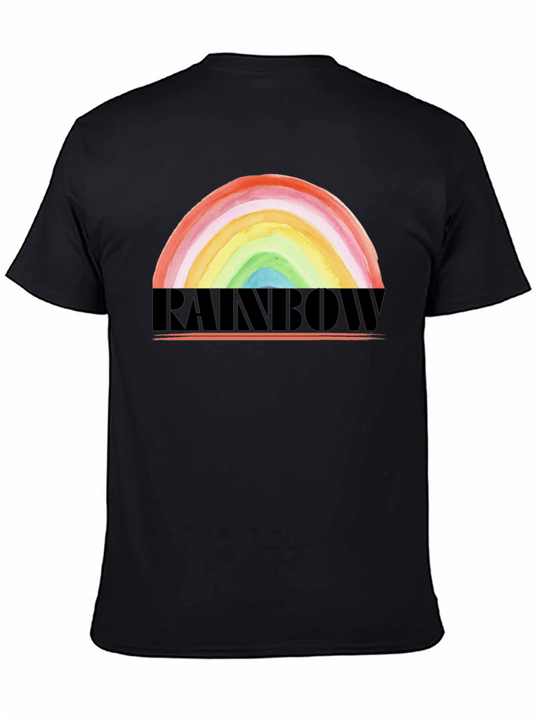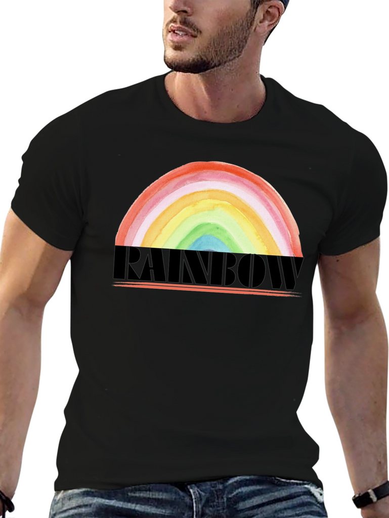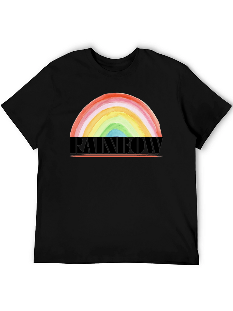 Show your pride with this stylish black t-shirt featuring a vibrant watercolor rainbow graphic. The word "RAINBOW" is boldly displayed, bisecting the colorful arc. Made from comfortable cotton, this tee is perfect for casual wear, pride events, or adding a pop of color to your everyday look. The classic fit makes it a versatile addition to any wardrobe. Express yourself with this unique and eye-catching design. This shirt is sure to become a favorite for its comfort and statement-making style. Get yours today!