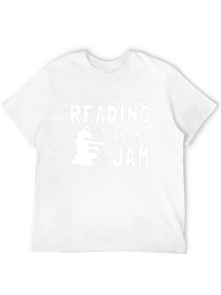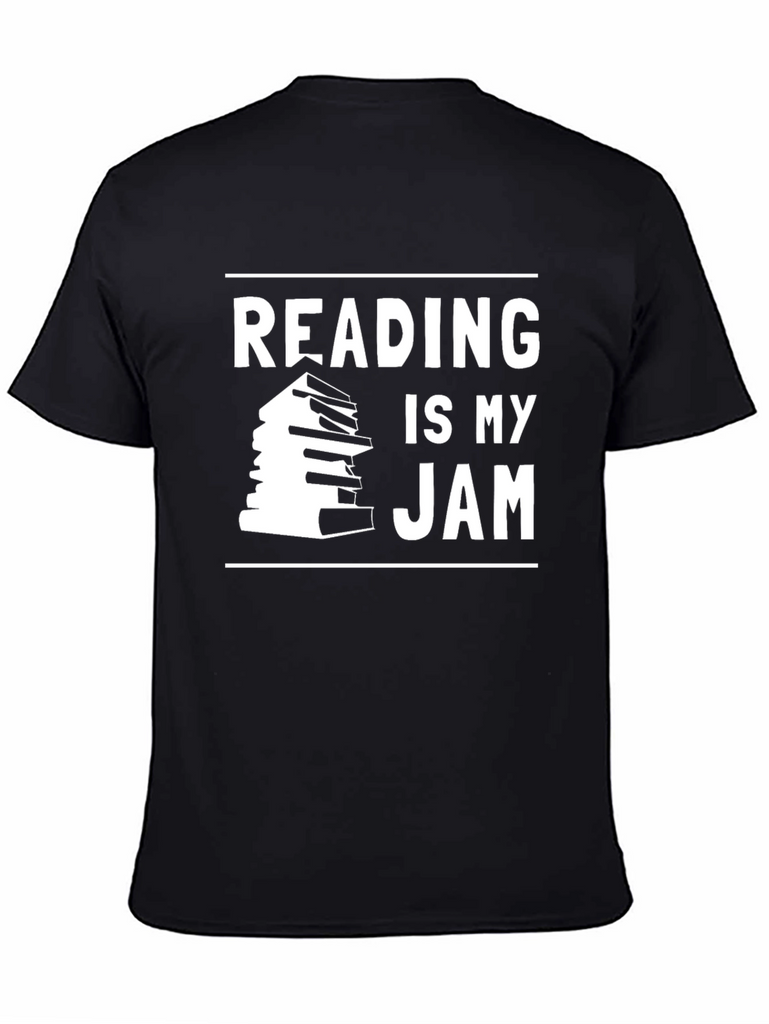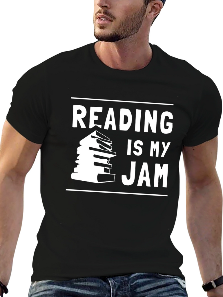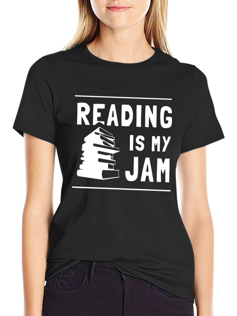 Express your love for reading with this stylish black t-shirt. Featuring a bold white graphic that reads "READING IS MY JAM" with a stack of books, this tee is perfect for bookworms and literature enthusiasts. Made from a comfortable fabric, it's ideal for casual wear, library visits, or book club meetings. Show off your passion for reading in a fun and fashionable way. A perfect gift for the reader in your life!