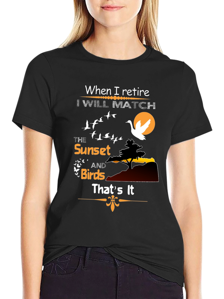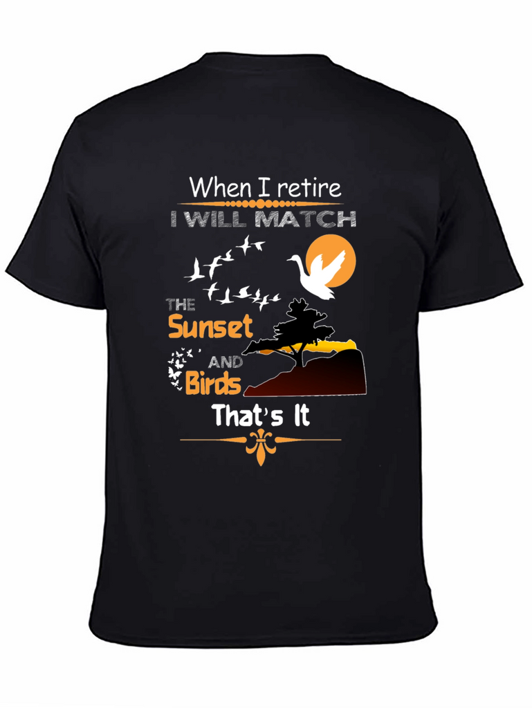 Embrace relaxation with this black t-shirt featuring a nature-inspired design. The shirt displays a vivid sunset and birds graphic, perfect for retirement life. The graphic includes a flock of birds and a sunset landscape with a single tree. Made from a soft, comfortable fabric, this tee is ideal for casual wear and easy styling. Show off your love for nature with this eye-catching t-shirt. Enjoy the simple things in life and make a statement about your retirement goals.