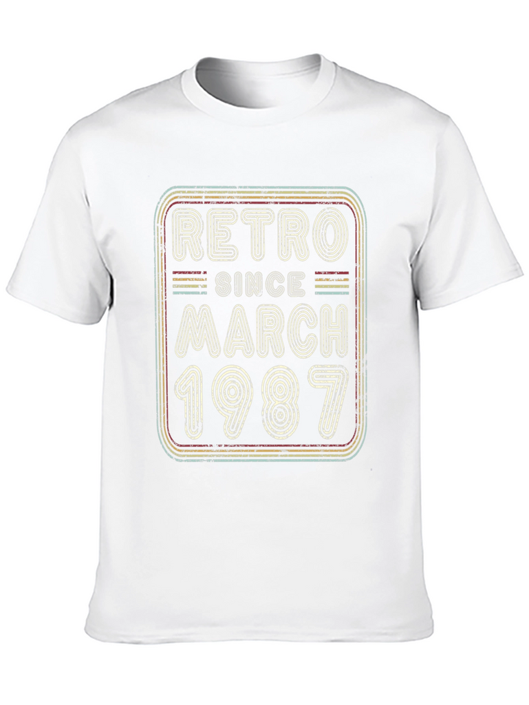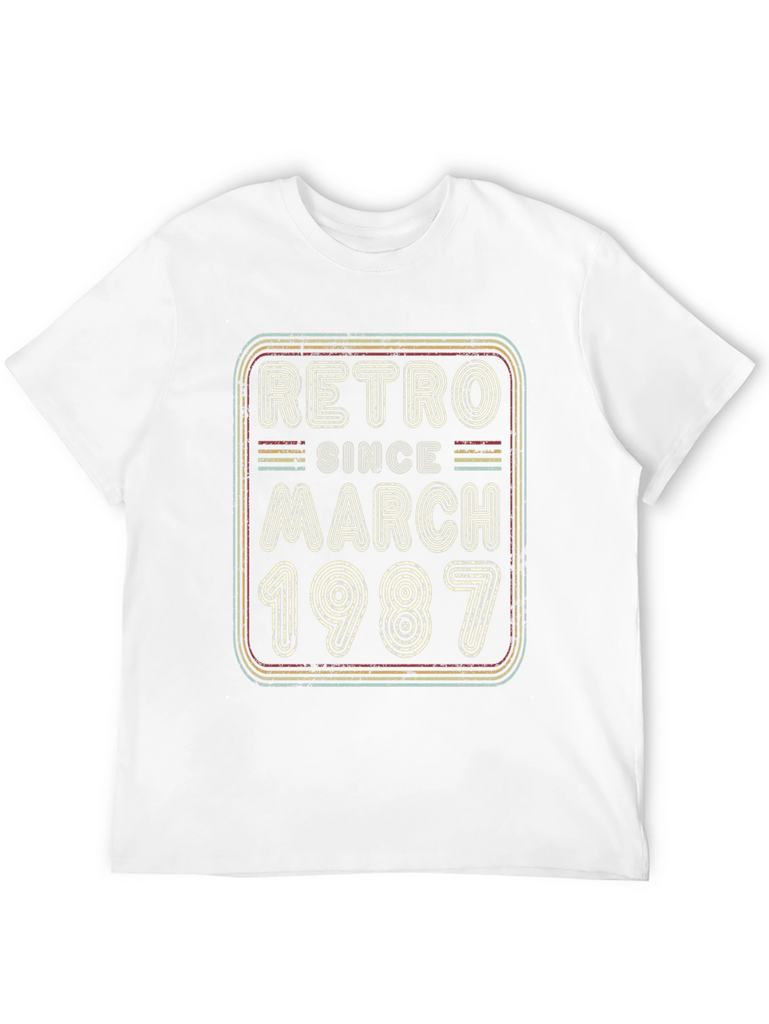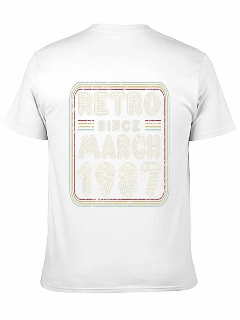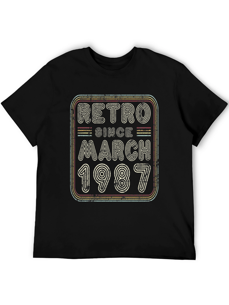 Celebrate a March 1987 birthday with this vintage-inspired black t-shirt. The design features a retro-style graphic with the words "Retro Since March 1987" in distressed lettering and multi-colored outlines. Perfect for casual wear, birthday parties, or as a unique gift for someone born in March 1987. The shirt appears to be made of soft, breathable fabric for comfortable all-day wear. Show off your birth year in style with this eye-catching tee! It's the perfect way to add a touch of retro cool to your wardrobe and celebrate a milestone birthday.