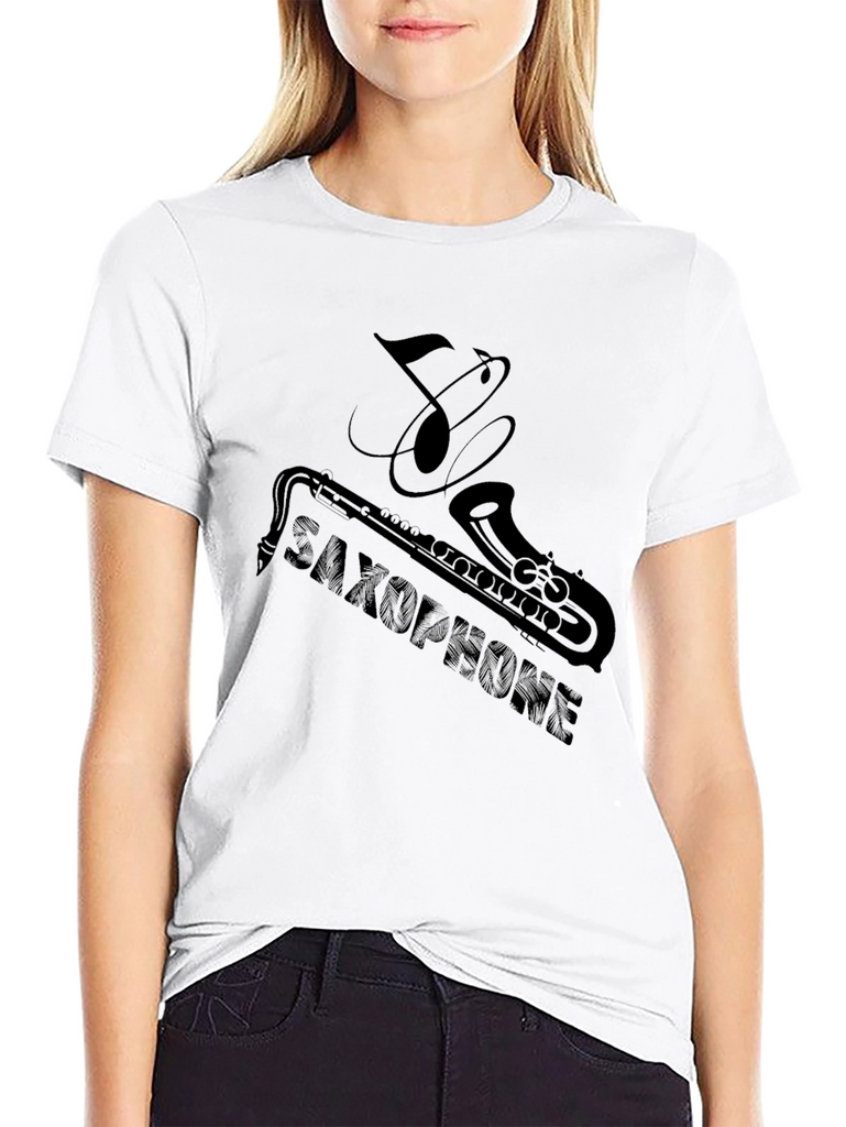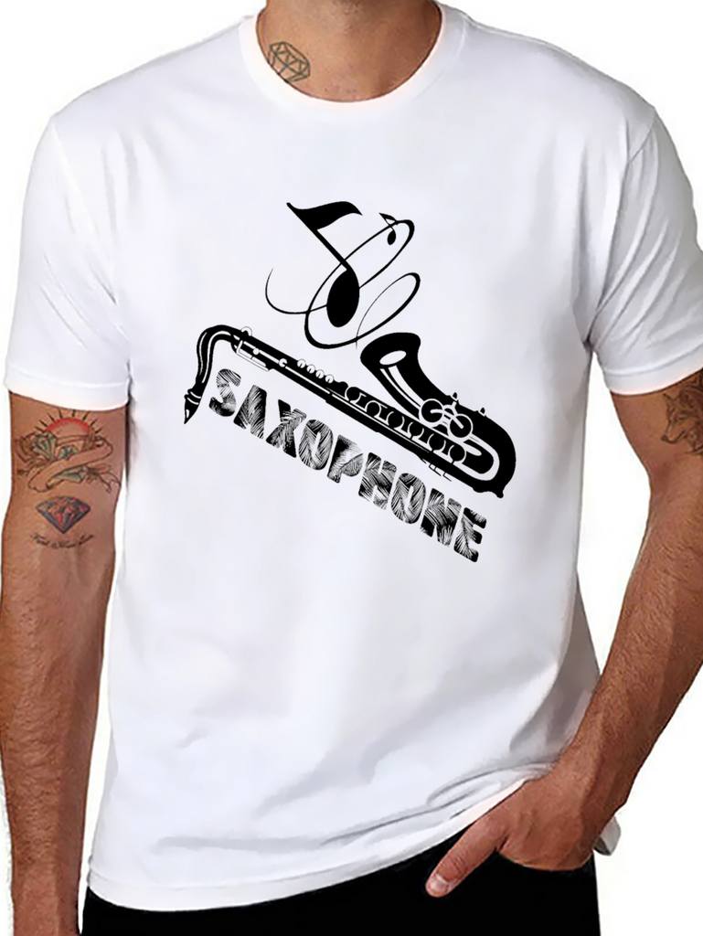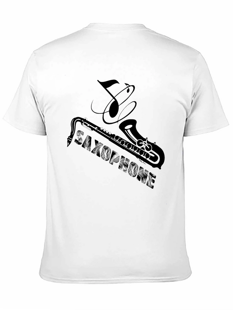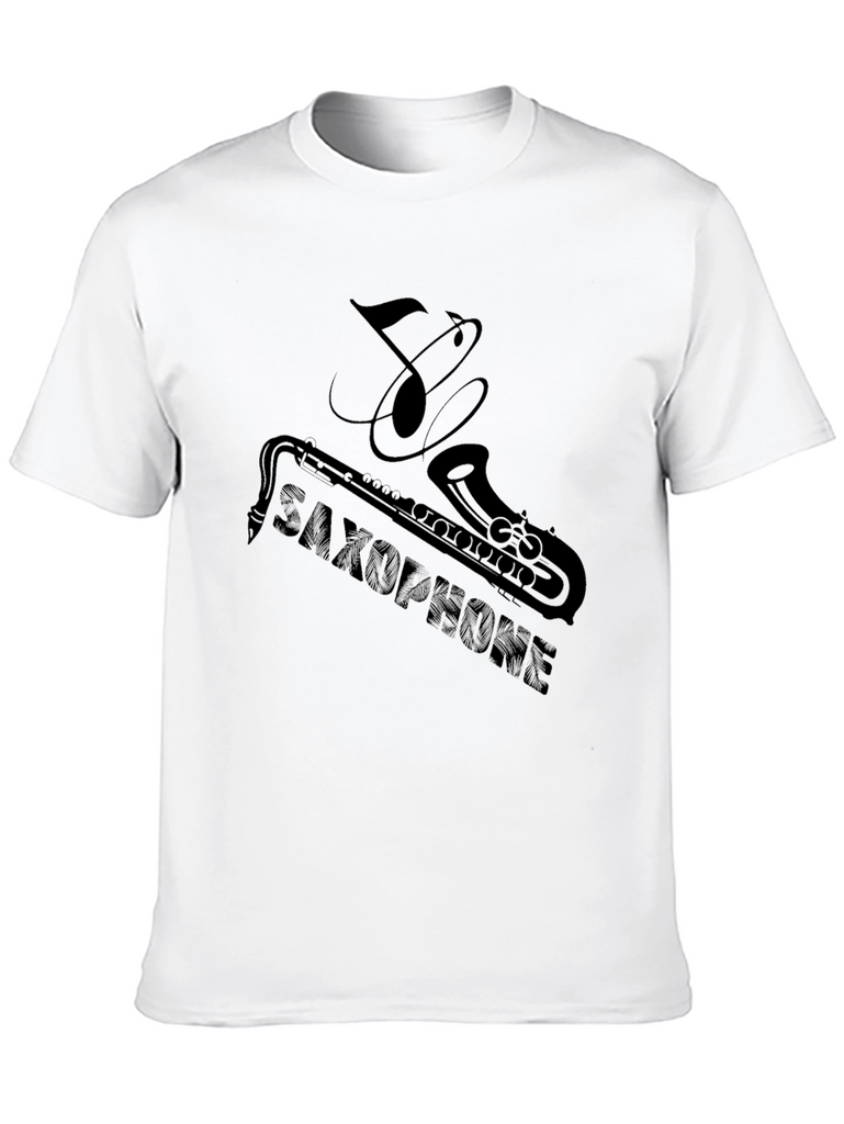 Rock your love for music with this striking black graphic t-shirt. Featuring a detailed black saxophone illustration overlaid with a musical note design, this tee is a must-have for musicians and music enthusiasts alike. The word "SAXOPHONE" is cleverly integrated into the design, adding a unique touch. Made from what appears to be a comfortable and breathable fabric, this t-shirt is perfect for casual wear, band practice, or concerts. Show off your passion for music with this stylish and eye-catching tee!
