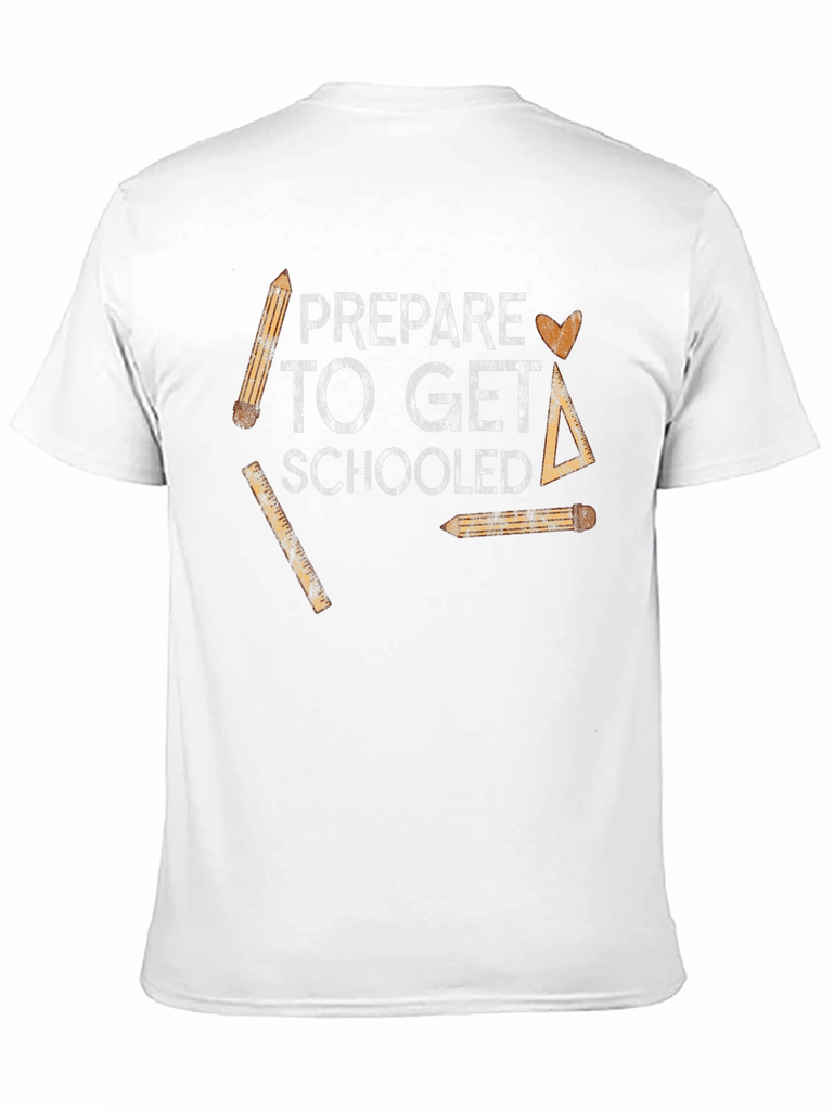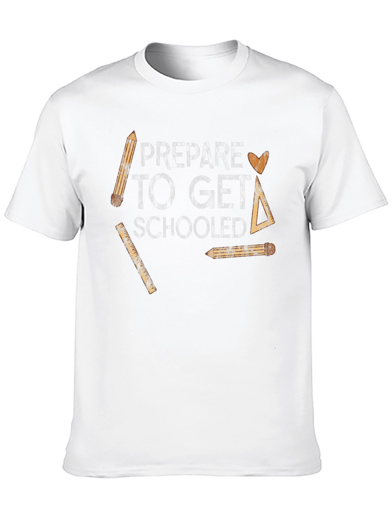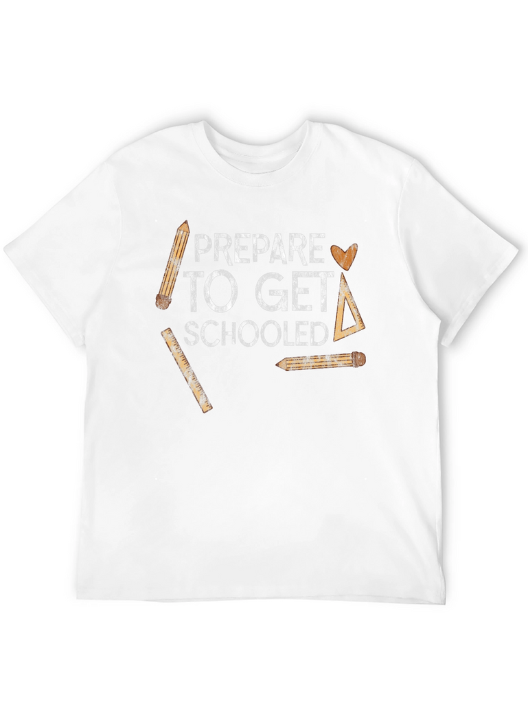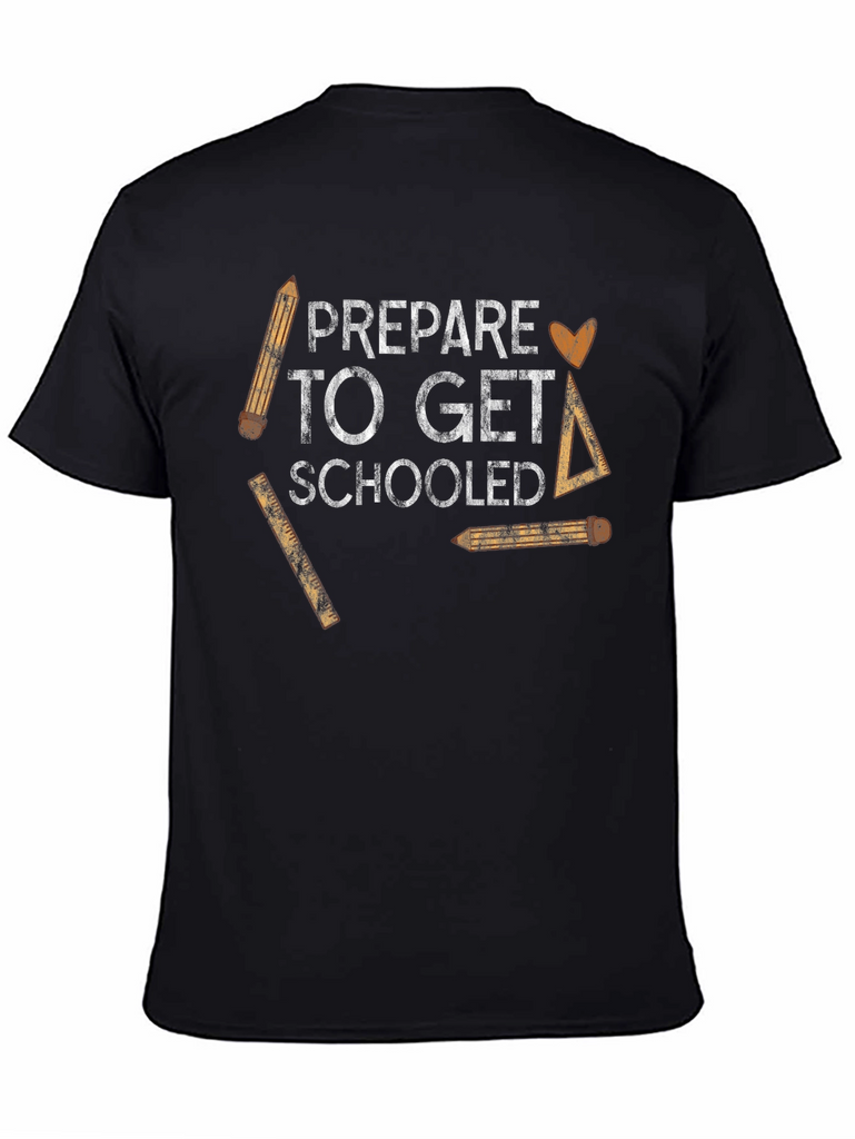 Show your love of school with this stylish "Prepare to Get Schooled" graphic t-shirt! The design features school supplies like pencils, rulers, and protractors. Made from comfortable, breathable fabric, this shirt is perfect for students, teachers, or anyone who enjoys a clever, education-themed design. Wear it to class, a tutoring session, or simply as a fun and unique everyday outfit. Makes a great gift for the scholar in your life.