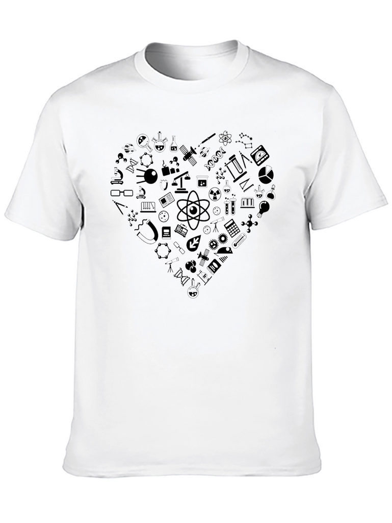 Show your love for science with this unique black t-shirt! Featuring a heart-shaped design composed of various science-related icons like atoms, beakers, and microscopes, this tee is perfect for science enthusiasts, students, and teachers alike. The soft, comfortable fabric ensures all-day wearability, whether you're in the lab, classroom, or simply expressing your passion. Stand out from the crowd and spark conversations with this eye-catching and stylish garment. It's the perfect gift for the science geek in your life, combining comfort, style, and intellectual flair. A great way to wear your heart on your sleeve – or rather, your passion on your chest!