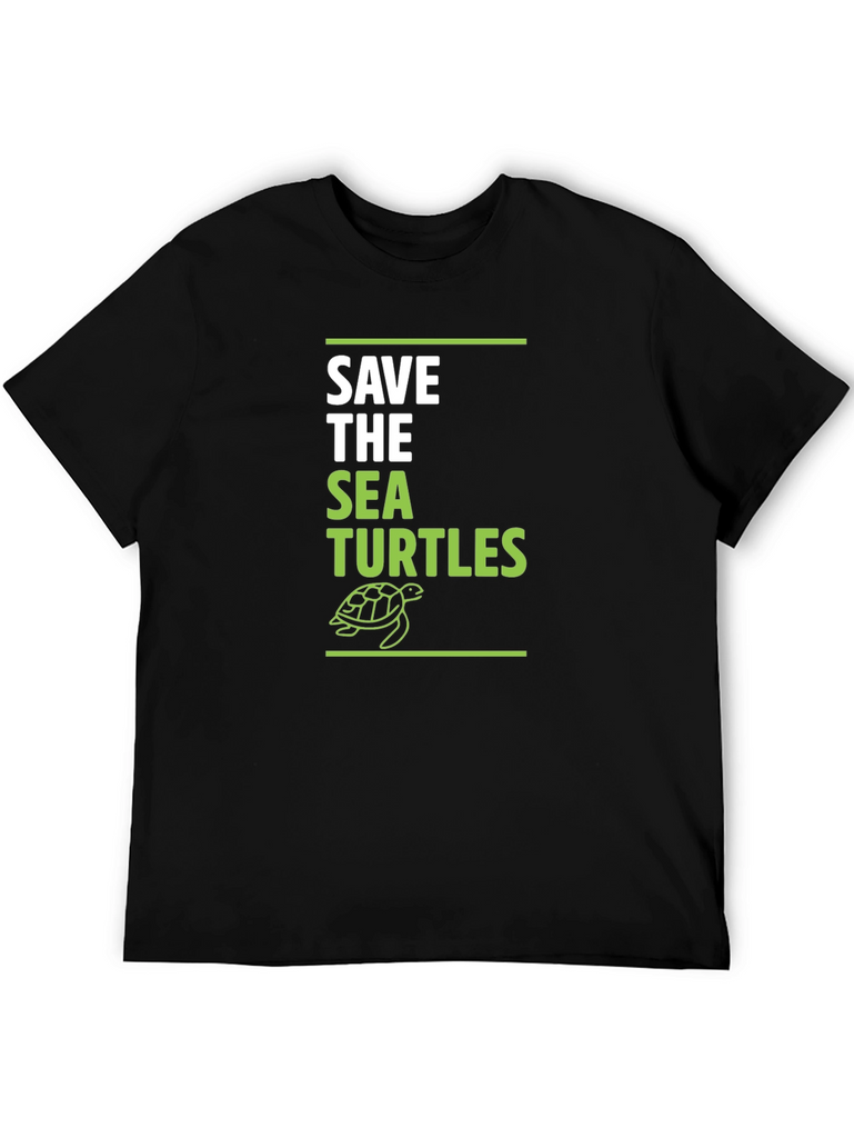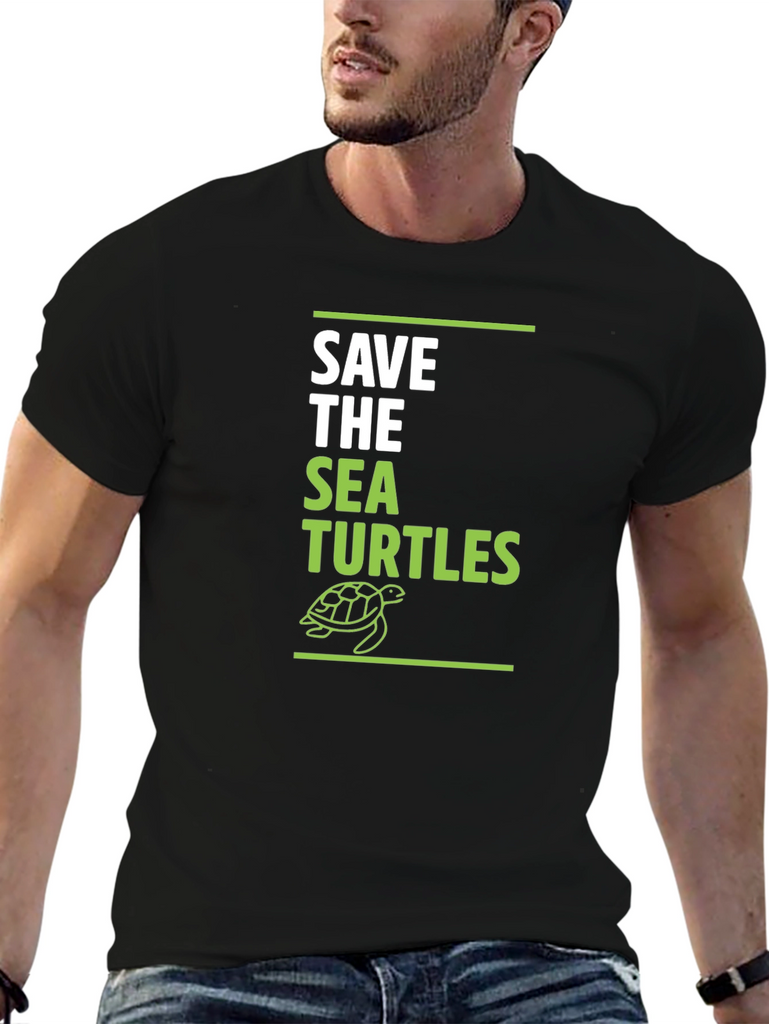 Show your love for marine life with this stylish black t-shirt. The design features the words "SAVE THE SEA TURTLES" in a bold white and green font. A line art style turtle graphic completes the design, set between green horizontal lines. Made from a soft, comfortable fabric, this tee is perfect for everyday wear and spreading awareness about protecting these amazing creatures. Whether you're heading to the beach or just hanging out with friends, this t-shirt is a great way to show your support.