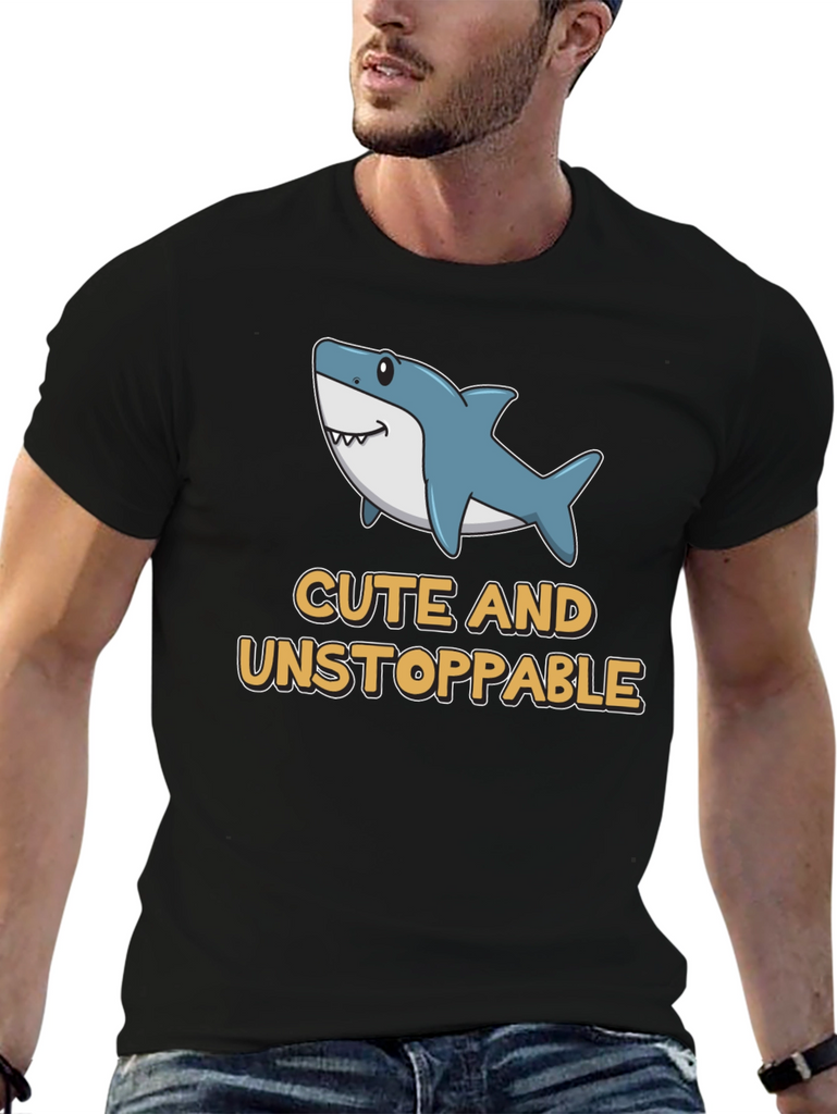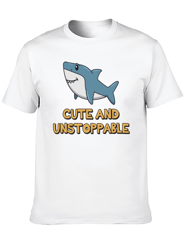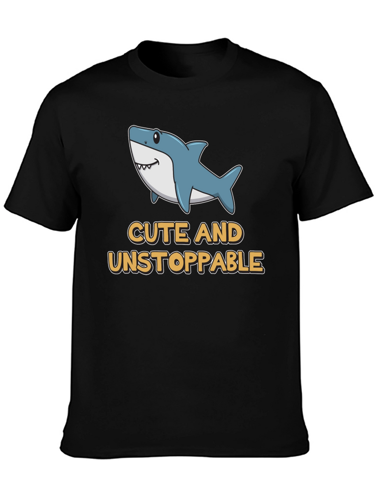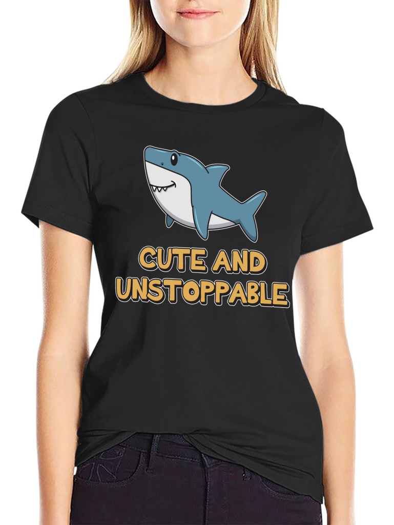 Showcase your unique personality with this eye-catching graphic tee. Featuring a playful cartoon shark design and the bold statement "Cute and Unstoppable", this shirt is sure to turn heads. Crafted from a soft, breathable fabric, it offers all-day comfort. The classic crew neck and short sleeves make it a versatile addition to any wardrobe. Pair it with jeans for a casual look or dress it up with a blazer for a night out. Perfect for shark enthusiasts and anyone who wants to make a statement, this tee is a must-have for those who dare to be different and embrace their inner strength with a touch of charm.