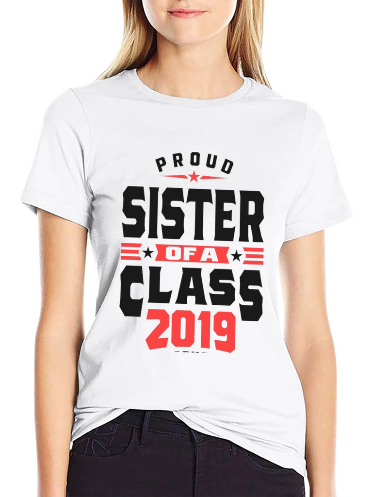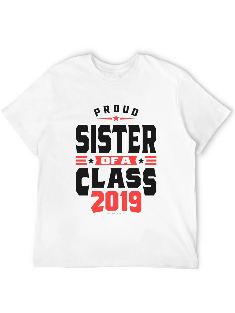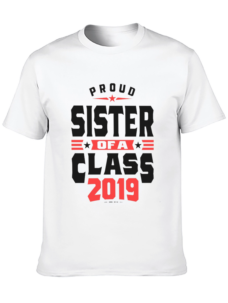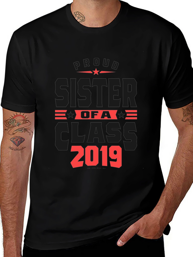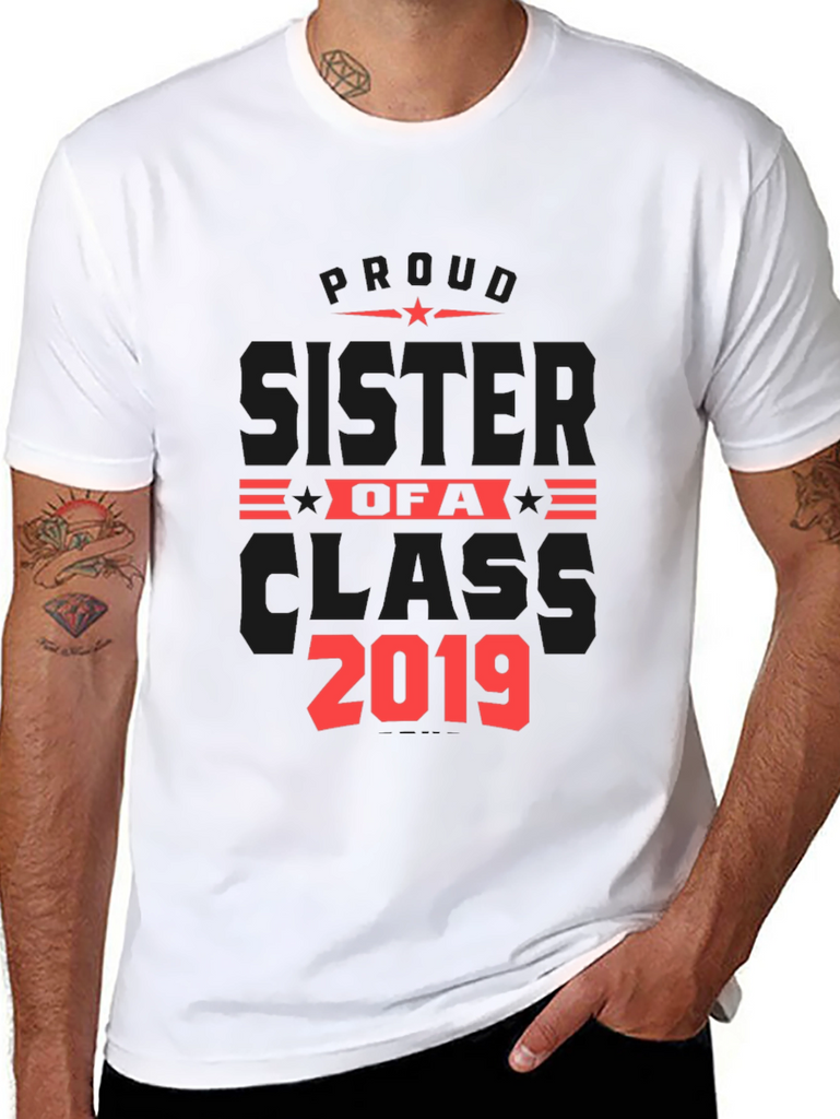 Show your pride with this stylish black t-shirt! This shirt features a bold red graphic design proclaiming "Proud Sister of a Class 2019". The design includes star accents for added flair. Made from a comfortable fabric, this tee is perfect for casual wear, family gatherings, graduation events, or as a thoughtful gift for a proud sister. The classic fit and short sleeves make it a versatile addition to any wardrobe. Wear your pride and celebrate your sibling's achievements with this unique and eye-catching t-shirt.