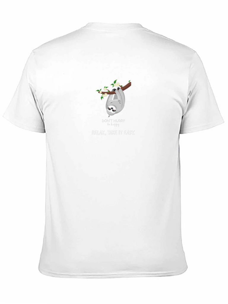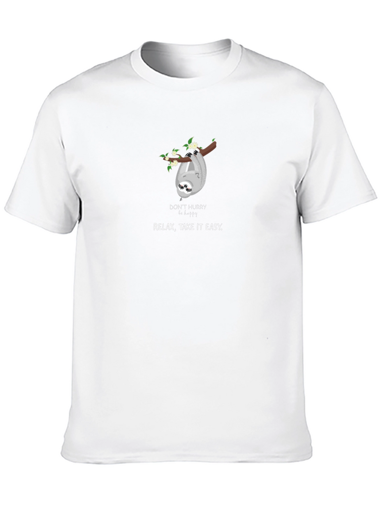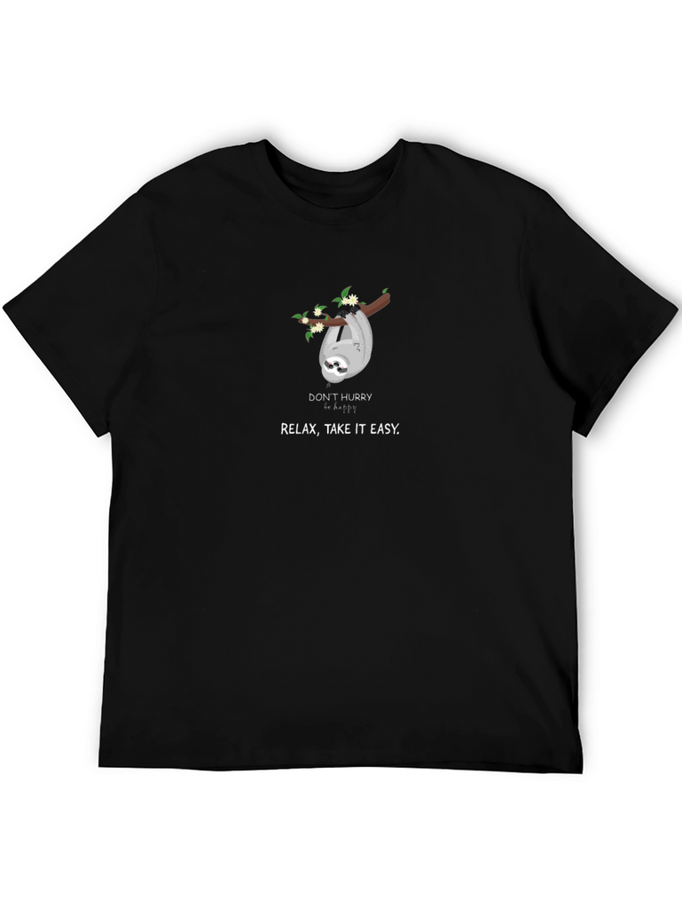 Embrace a laid-back vibe with this black graphic tee featuring a cute sloth design. The shirt showcases a sloth hanging from a branch with delicate white flowers, accompanied by the text "DON'T HURRY be happy RELAX, TAKE IT EASY." Crafted from a soft-looking fabric, this tee offers a comfortable fit for everyday wear. Perfect for casual outings, lounging at home, or expressing your carefree attitude. This unique t-shirt adds a touch of whimsy to any outfit. It's an ideal gift for sloth lovers or anyone who appreciates a reminder to slow down and enjoy life's simple pleasures. Step out in style with this easygoing tee!