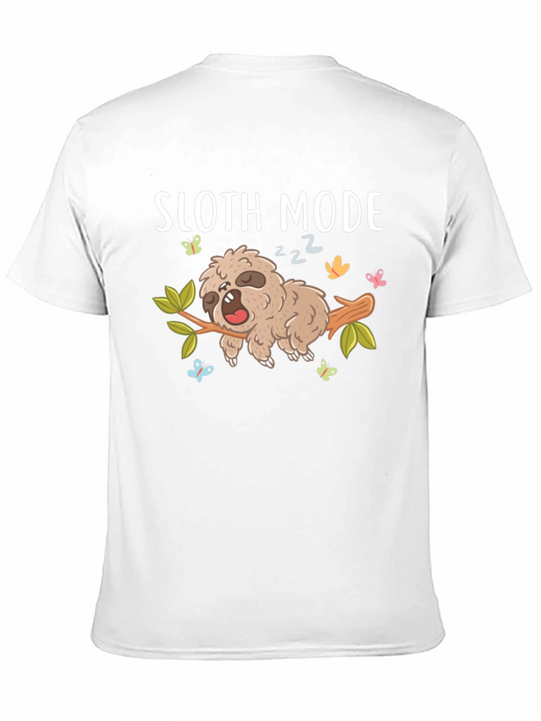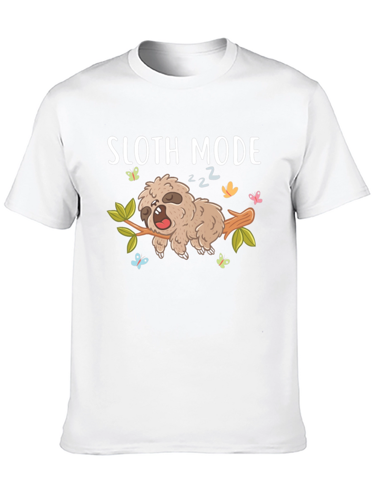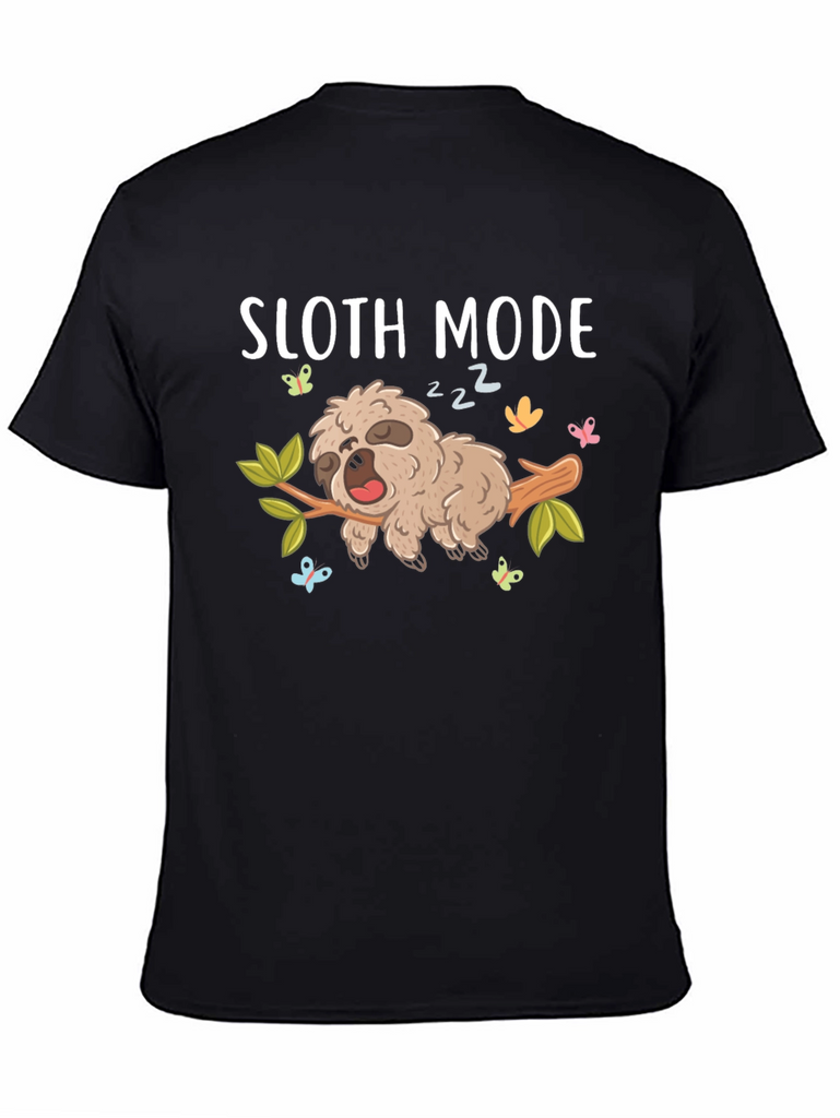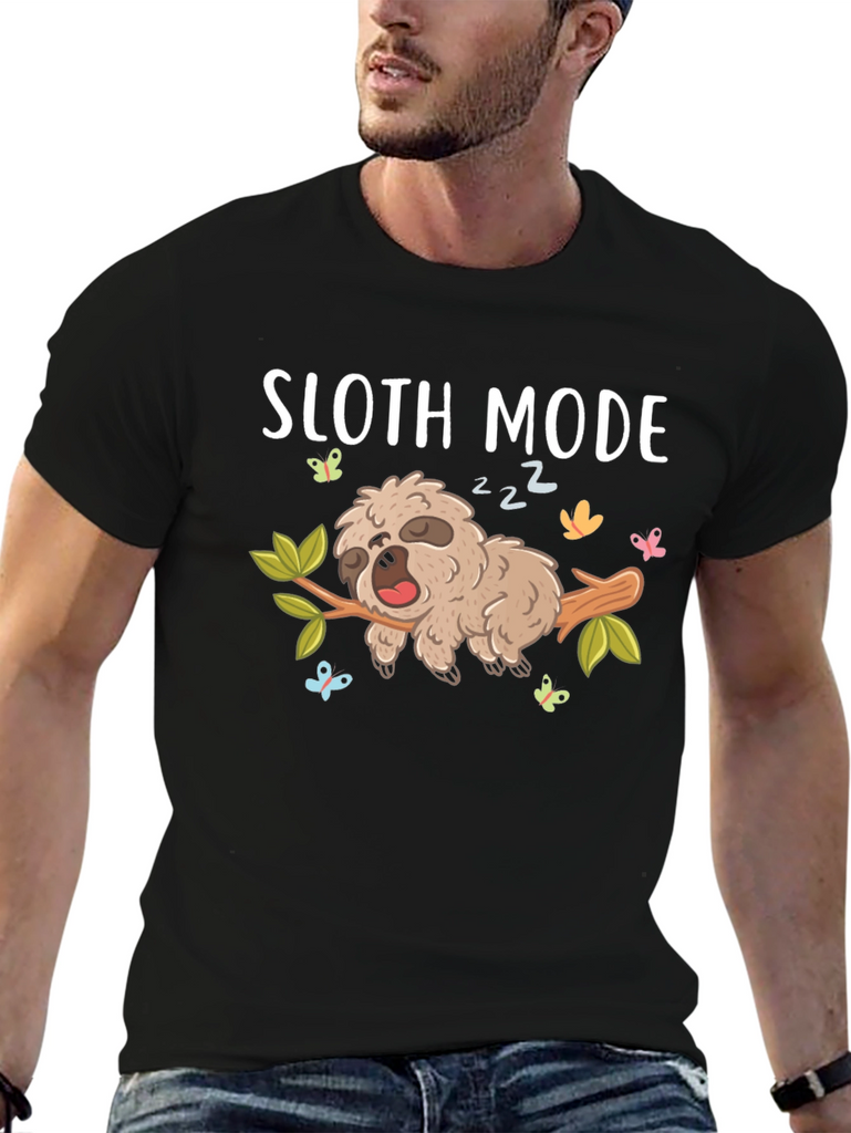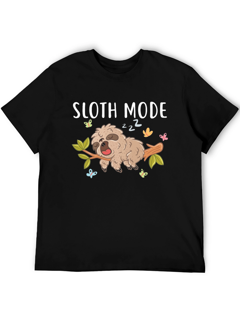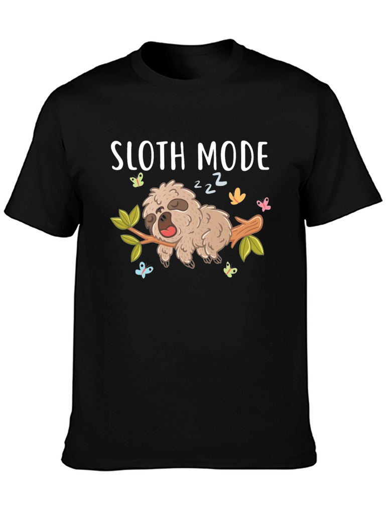 Show off your chill side with this humorous black t-shirt. It features a cute cartoon sloth napping on a branch surrounded by colorful butterflies. Above the sloth is the phrase "Sloth Mode" in white lettering. Made from what appears to be soft, breathable cotton blend, this tee is perfect for casual wear and lazy days. The relaxed fit ensures all-day comfort. Ideal for anyone who loves sloths, animals, or simply enjoys a good nap, this t-shirt makes a great gift or a fun addition to your wardrobe.