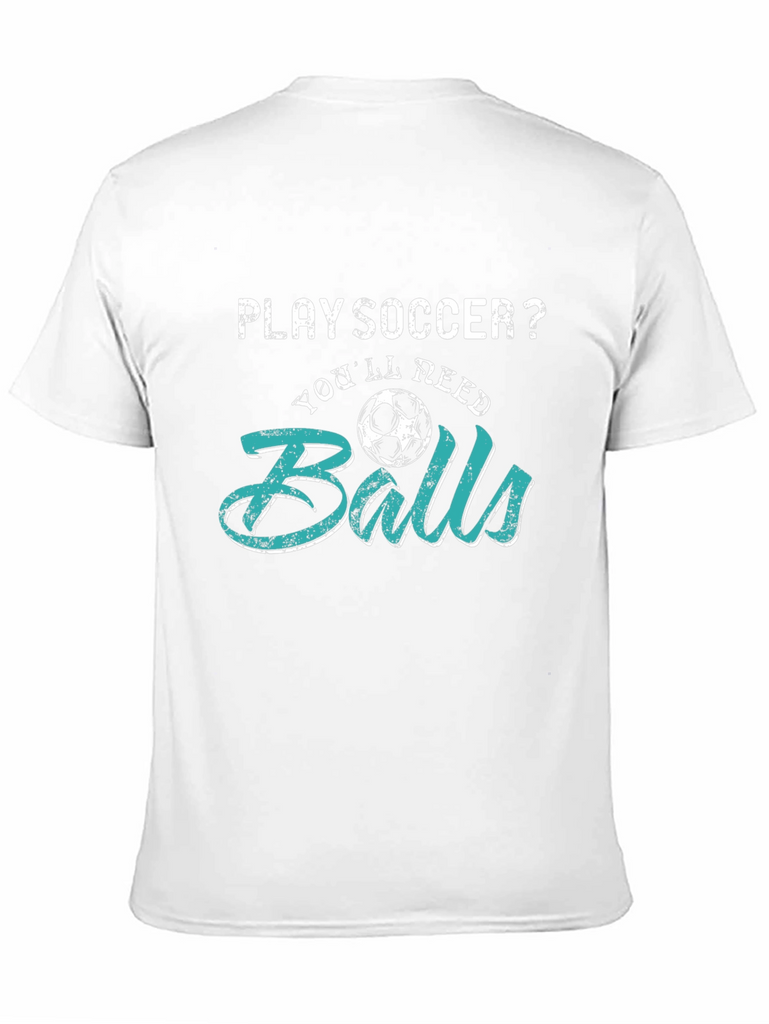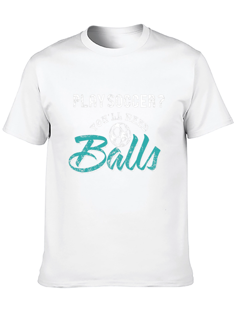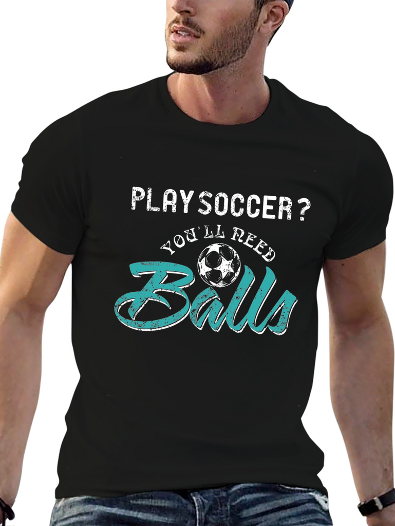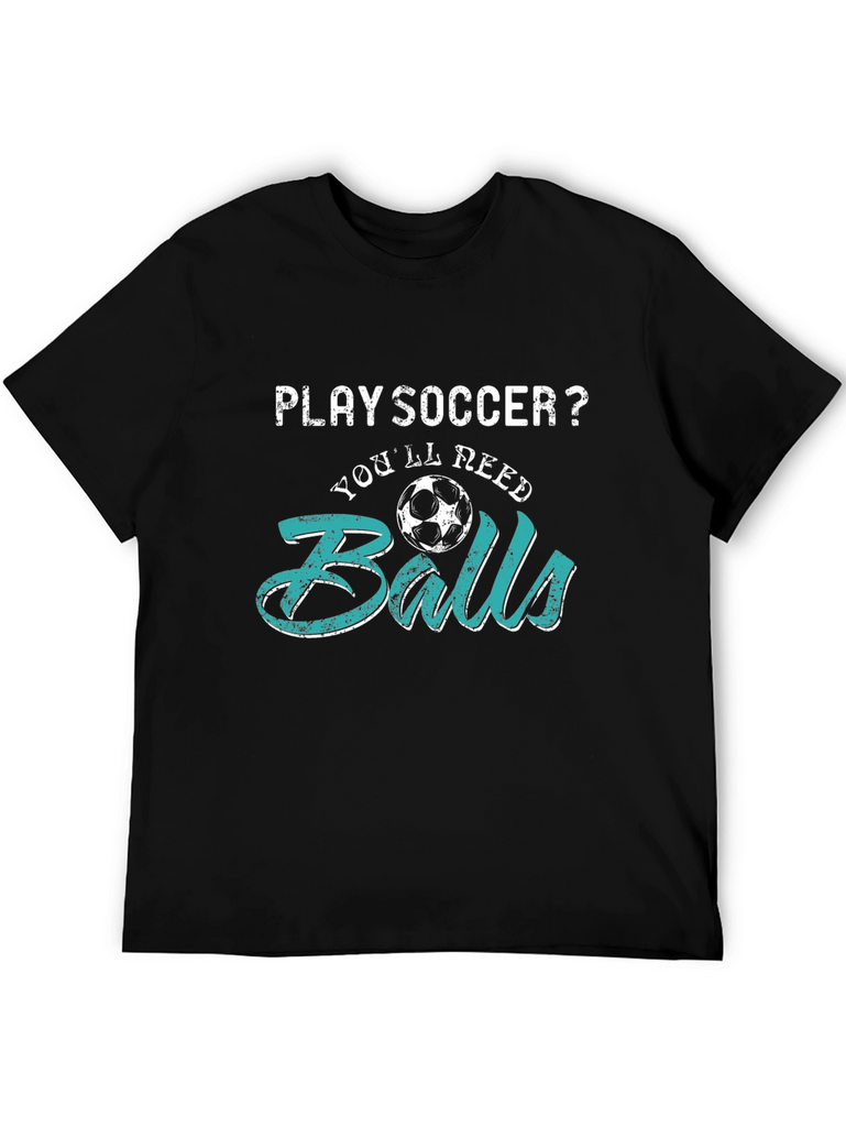 Show off your love for soccer with this witty and stylish t-shirt. This black tee features a bold design with the phrase 'Play Soccer? You'll Need Balls' in a playful font. The word 'Balls' is emphasized in a vibrant teal color with a distressed texture, adding a vintage touch. A soccer ball graphic is cleverly integrated into the design. Made from a comfortable, breathable fabric, this shirt is perfect for casual wear, soccer practice, or game day. Makes a great gift for soccer players and fans alike!