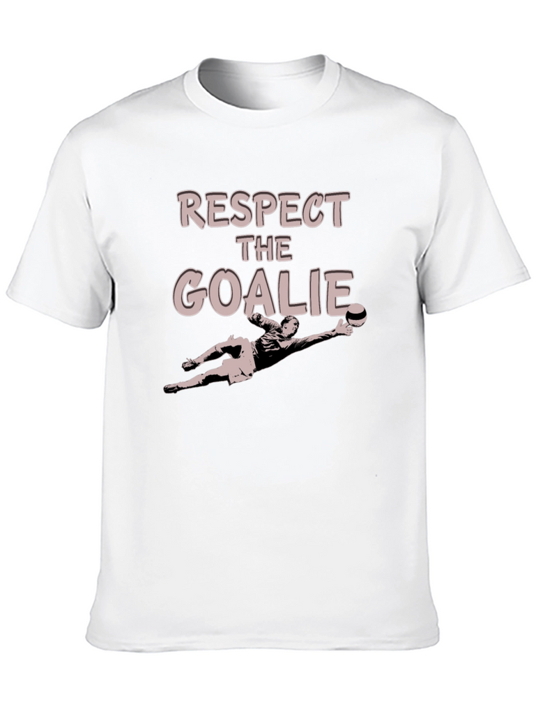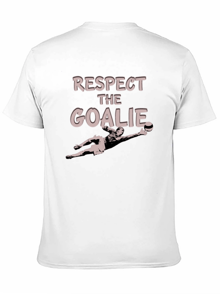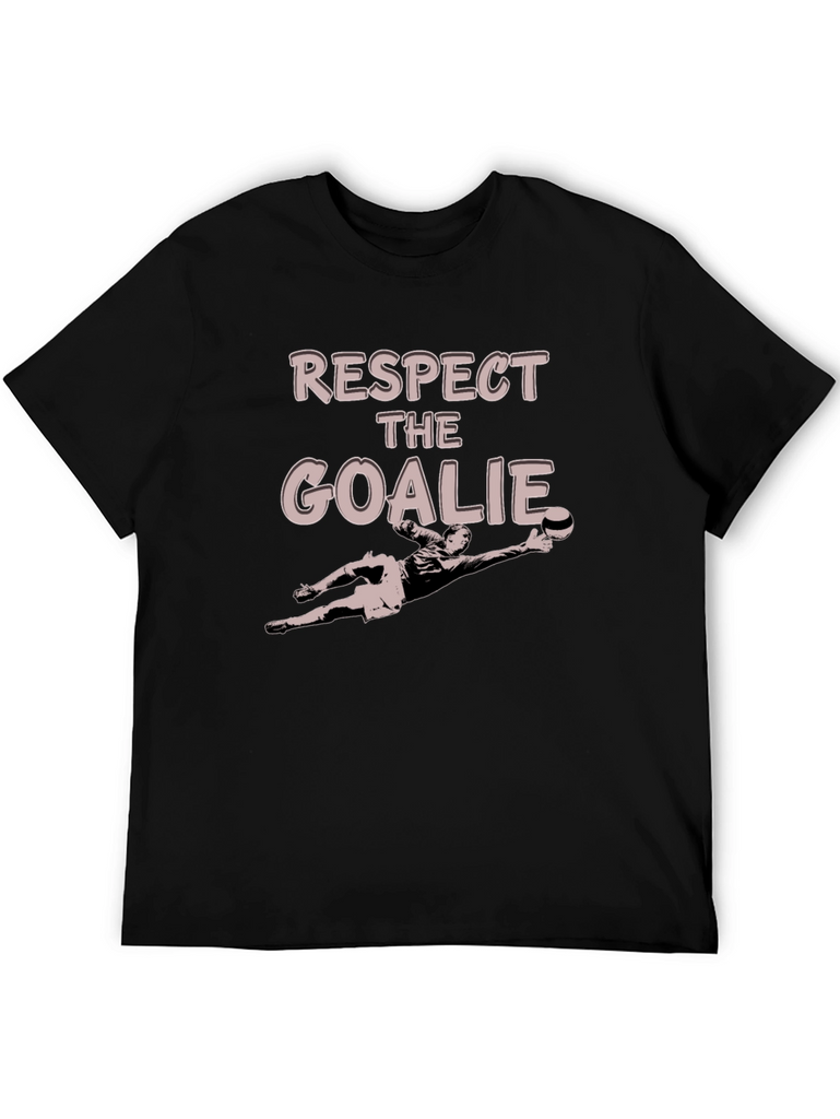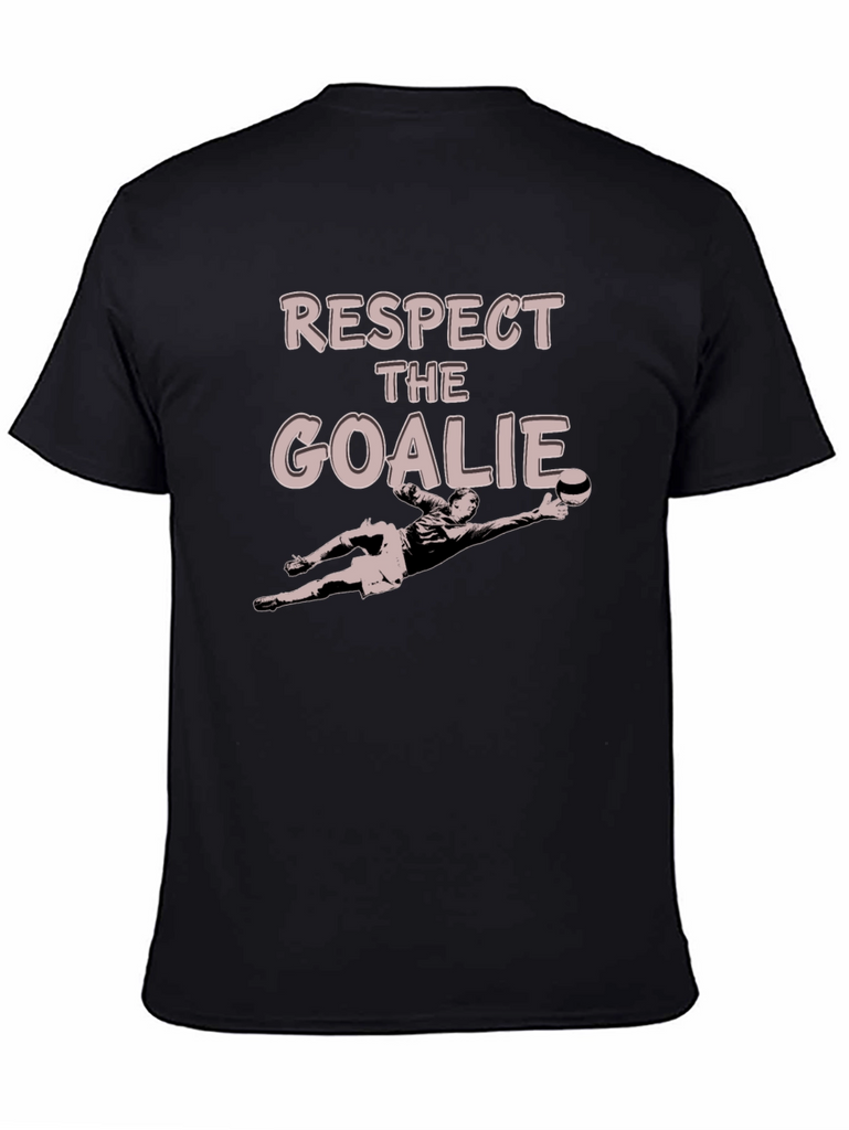Show your love for soccer goalkeepers with this stylish black graphic t-shirt. Featuring the text "RESPECT THE GOALIE" and a goalkeeper illustration, this tee is perfect for players and fans alike. Made from a comfortable, breathable material, it's ideal for casual wear, sports events, or training. The classic fit ensures a flattering look for everyone. A great way to support your favorite goalie while looking great.