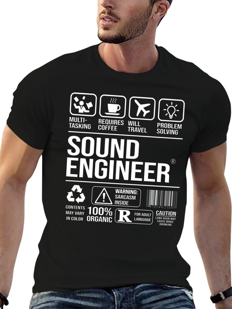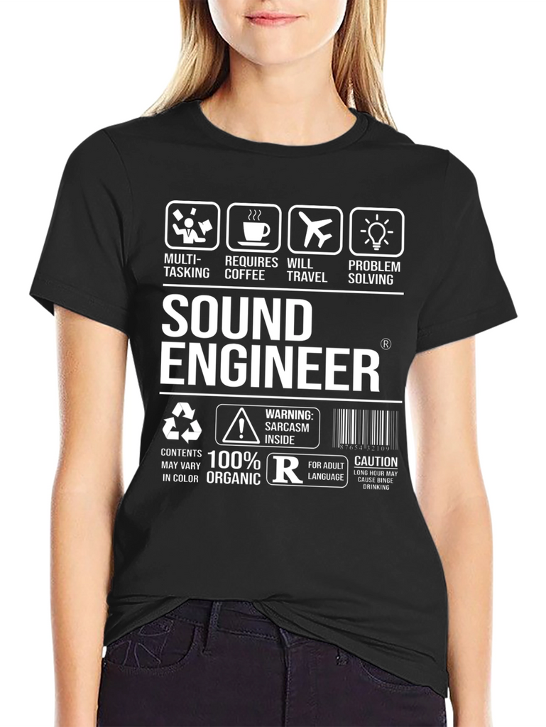 This black t-shirt is designed for a sound engineer. The shirt features funny white graphics illustrating multi-tasking, coffee requirement, travel, and problem-solving. It also includes a 'Sound Engineer' title and warning symbols. The shirt suggests sarcasm inside the wearer. This humorous tee is 100% organic and for adult language. Perfect for daily wear or as a gift to your favorite sound engineer.