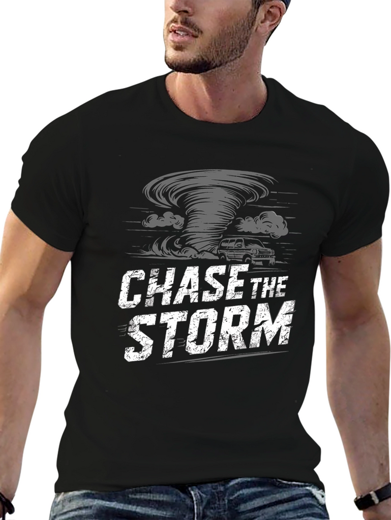 Brave the elements in style with this bold, black t-shirt. Featuring a striking graphic of a tornado looming over a vehicle, emblazoned with the words "CHASE THE STORM," this shirt is perfect for storm chasers and thrill-seekers alike. The design has a distressed, vintage feel. Crafted from a comfortable fabric, this tee offers a relaxed fit for everyday wear. Show off your adventurous spirit and make a statement with this eye-catching graphic tee. Great for casual outings, weather enthusiasts' meetups, or simply expressing your love for nature's raw power. Get yours today!
