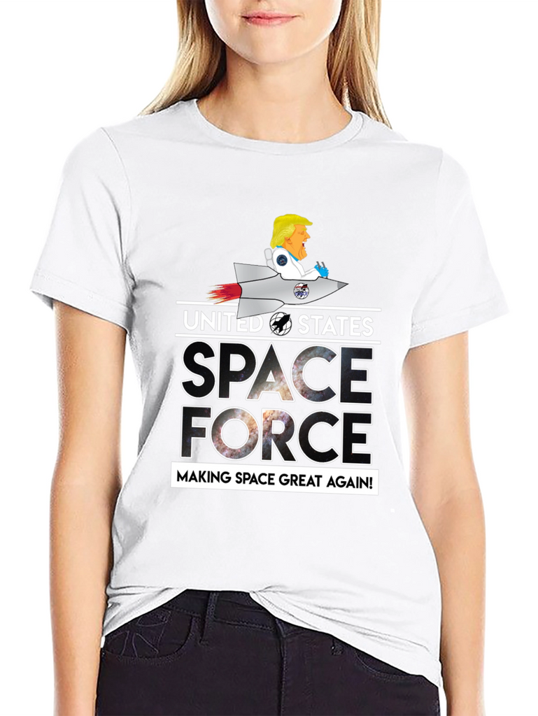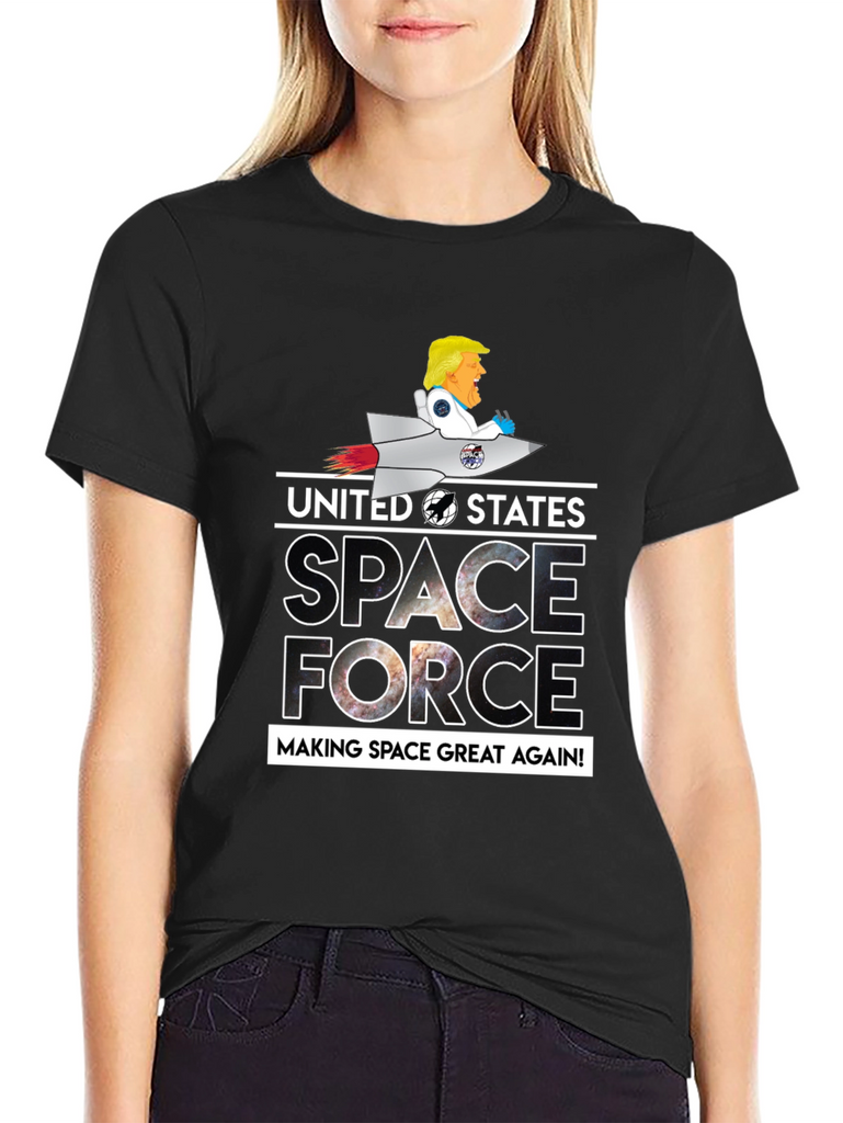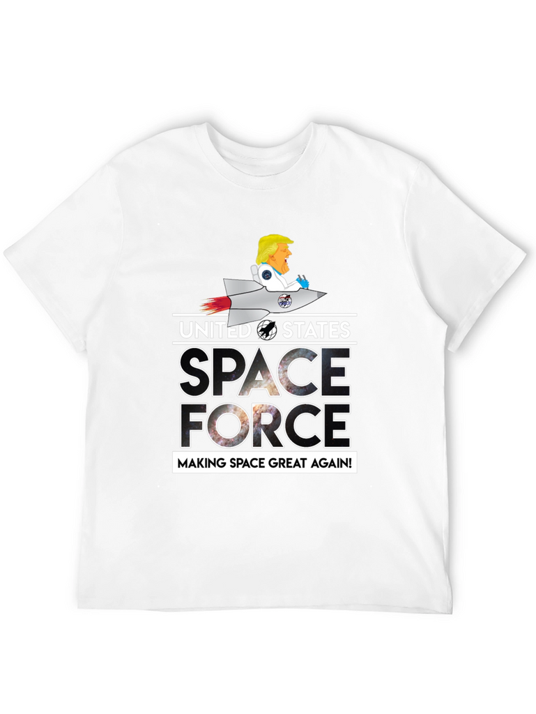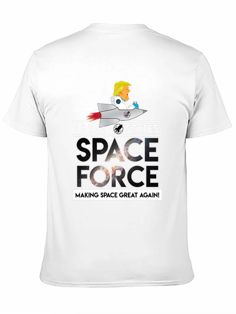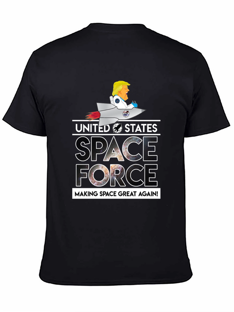 Show your patriotic side with this unique black graphic t-shirt. Featuring a playful design of a cartoon character riding a rocket above the words "UNITED STATES SPACE FORCE MAKING SPACE GREAT AGAIN!", this tee is sure to be a conversation starter. The letters of the word space and force are filled with a captivating galaxy design. The shirt is perfect for casual wear, space enthusiasts, or anyone who enjoys a touch of humor in their wardrobe. Made from comfortable materials, this tee combines style and comfort effortlessly.