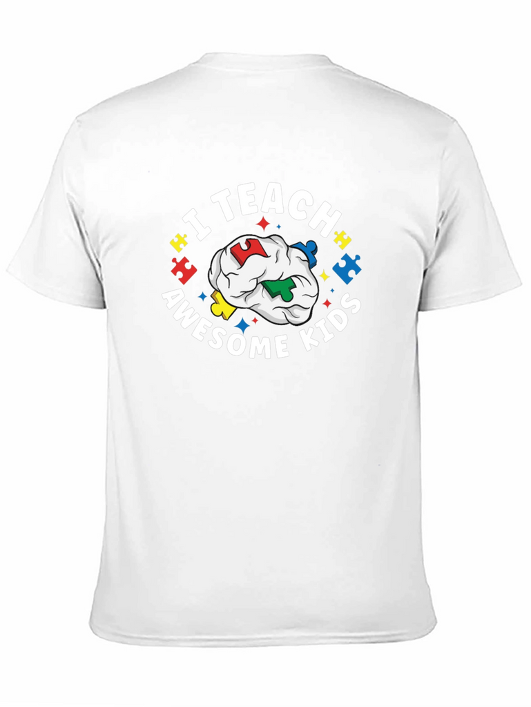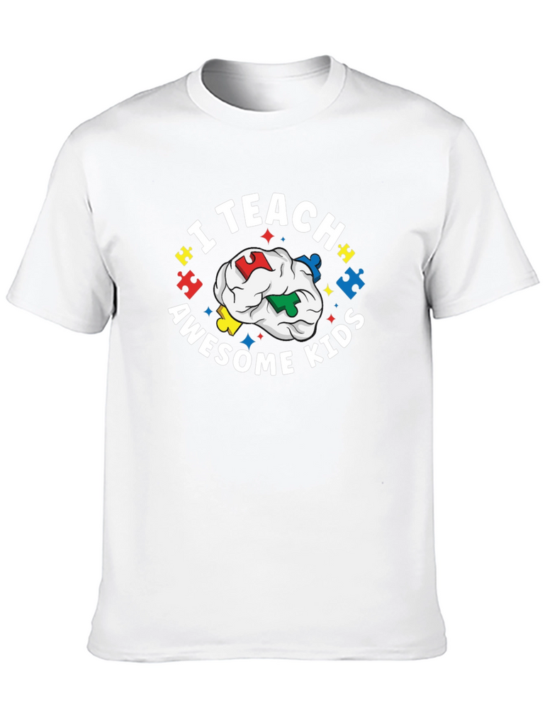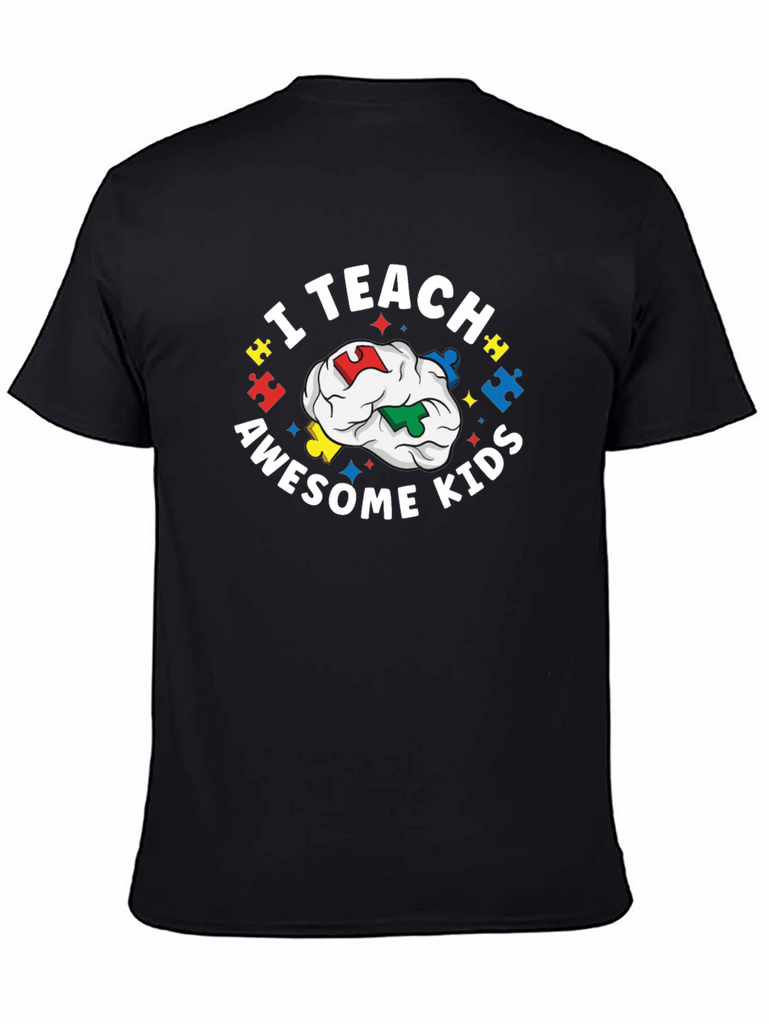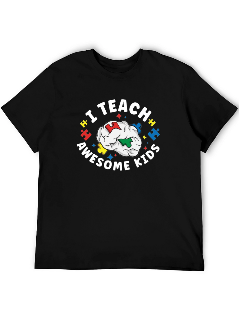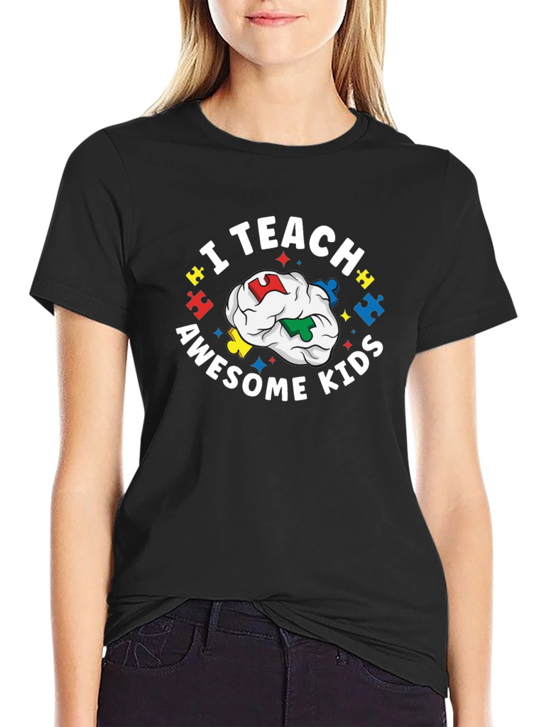 Show your support for neurodiversity with this eye-catching black tee. The shirt features a creative design with a brain illustration adorned with puzzle pieces, surrounded by the phrase "I Teach Awesome Kids." The colorful puzzle pieces represent autism awareness and acceptance. Made from a comfortable material, this t-shirt is perfect for teachers, therapists, or anyone who wants to spread a message of inclusion and appreciation for unique minds. Wear it to school, community events, or casual outings to spark conversations and promote understanding.