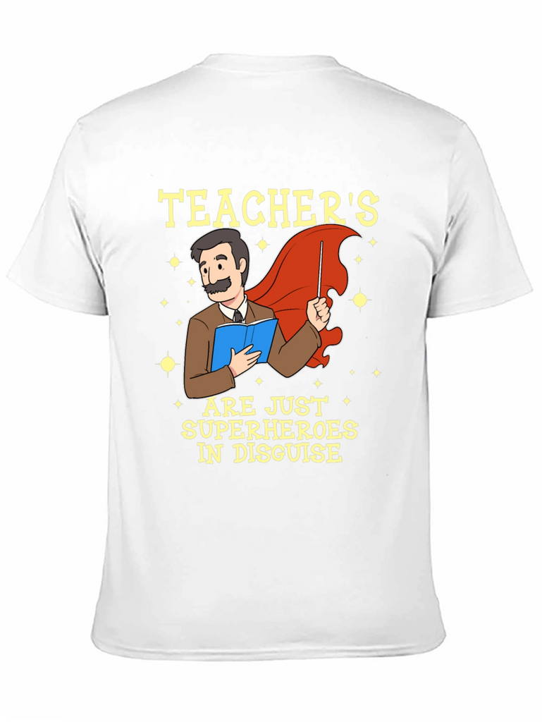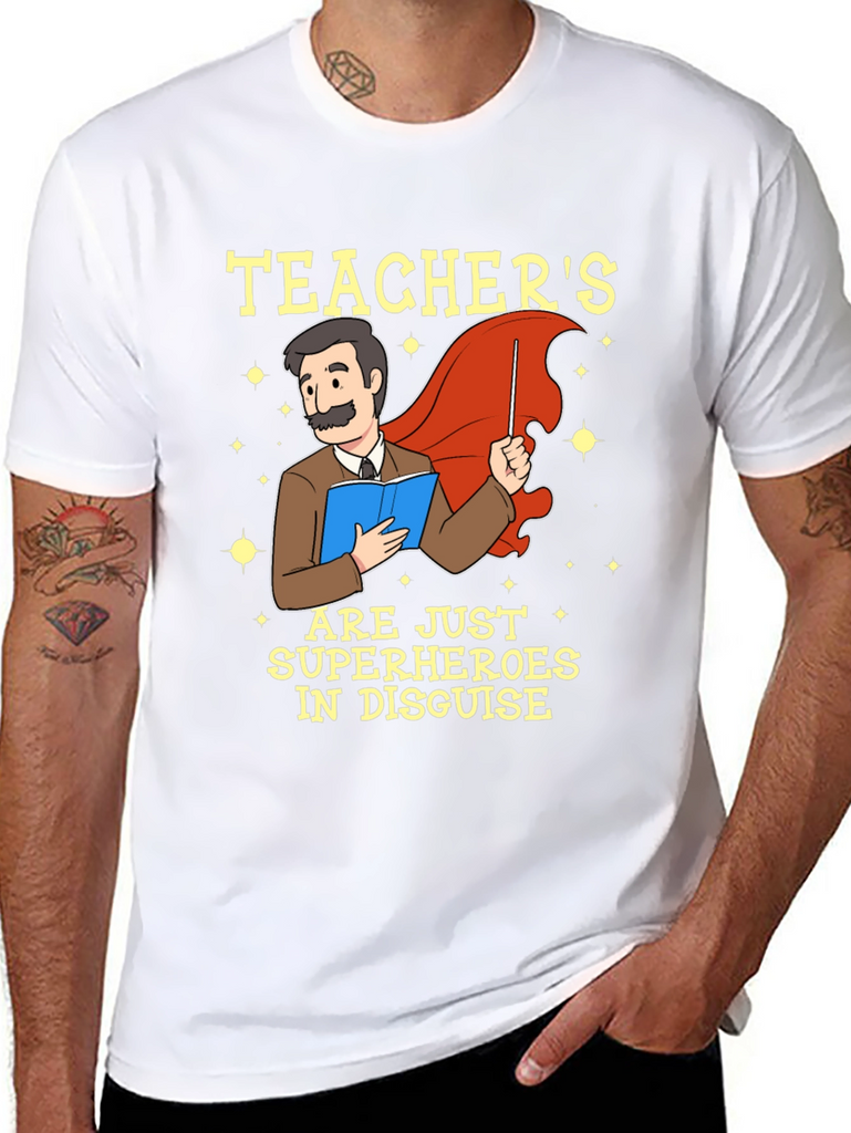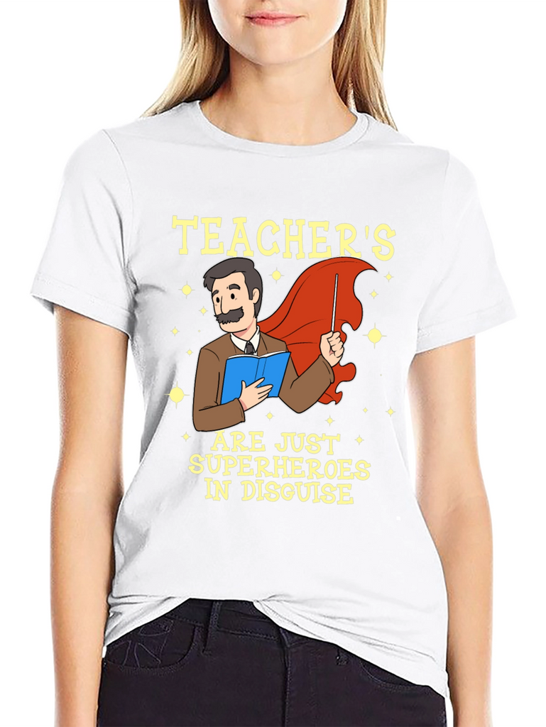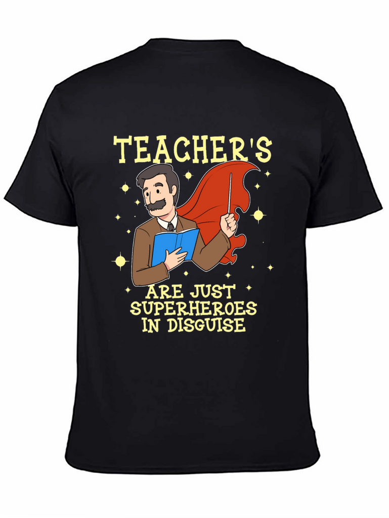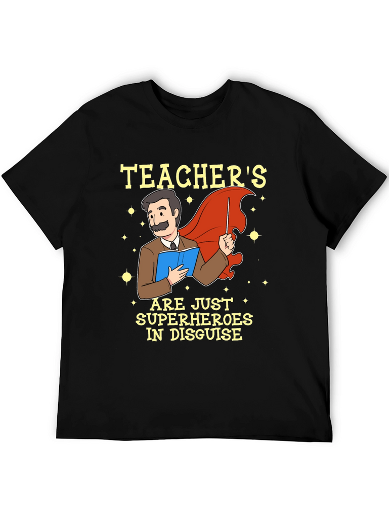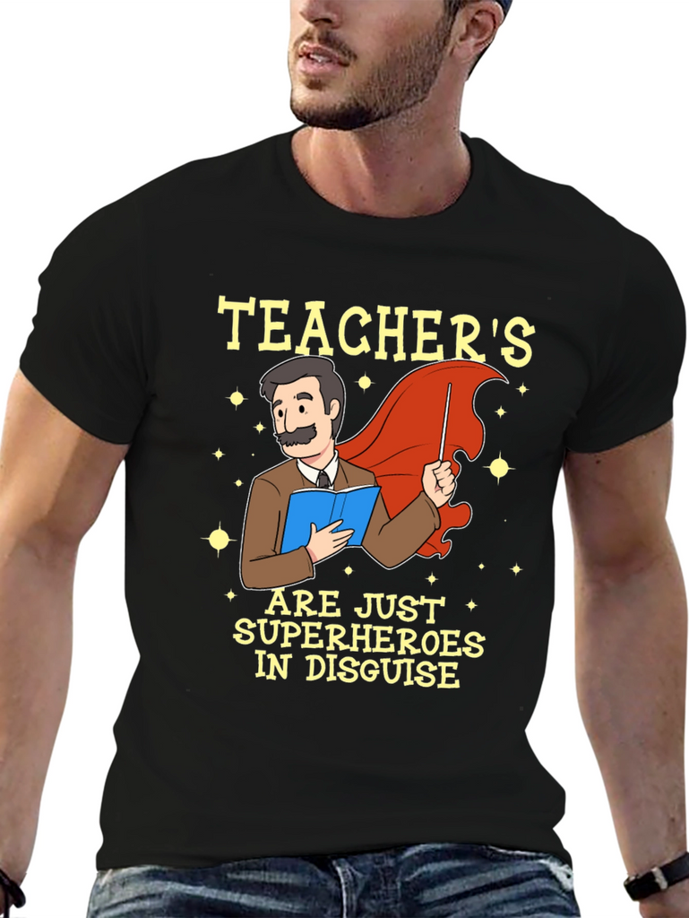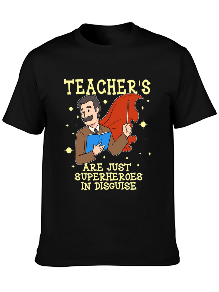 Show your appreciation for teachers with this unique graphic t-shirt! The black tee features a fun design of a teacher dressed as a superhero with a cape. The playful text "Teacher's are just superheroes in disguise" makes this shirt a great gift for educators. Perfect for casual wear, school events, or teacher appreciation day. The shirt appears to be made of comfortable material, ideal for everyday use. Let your favorite teacher know they're valued with this fun and thoughtful tee!
