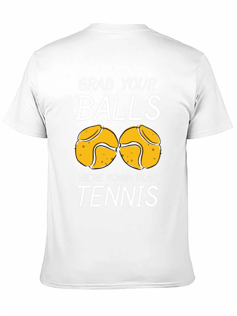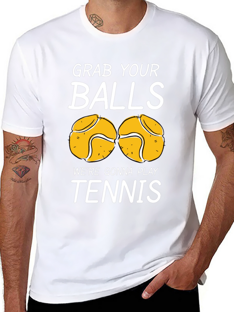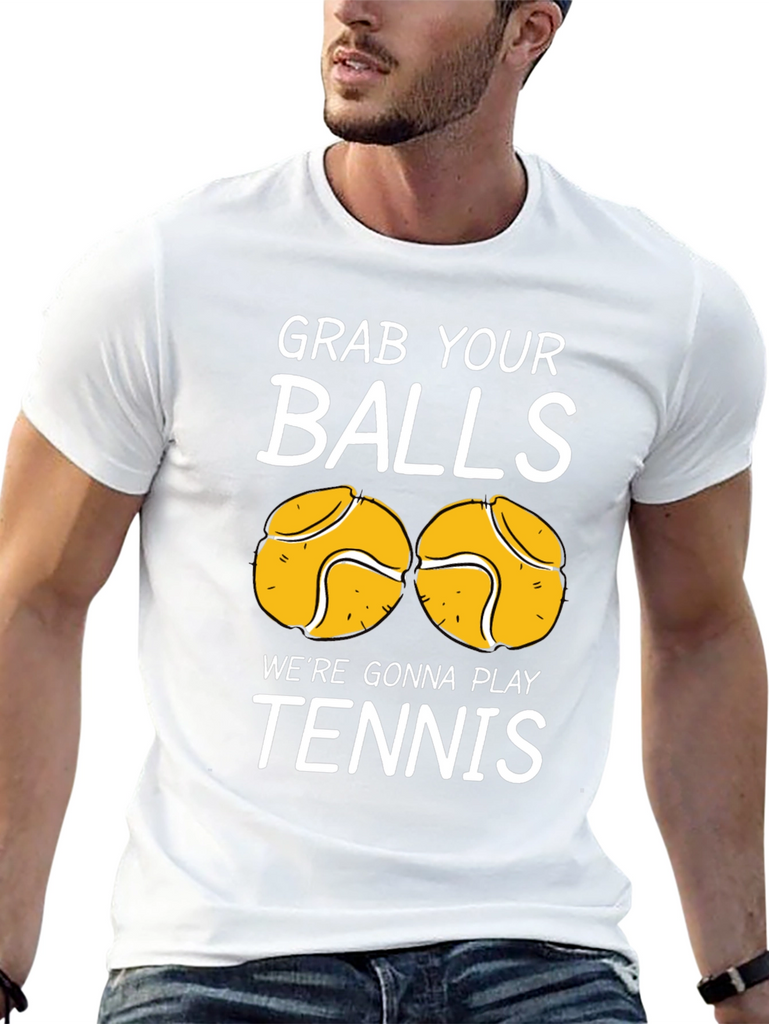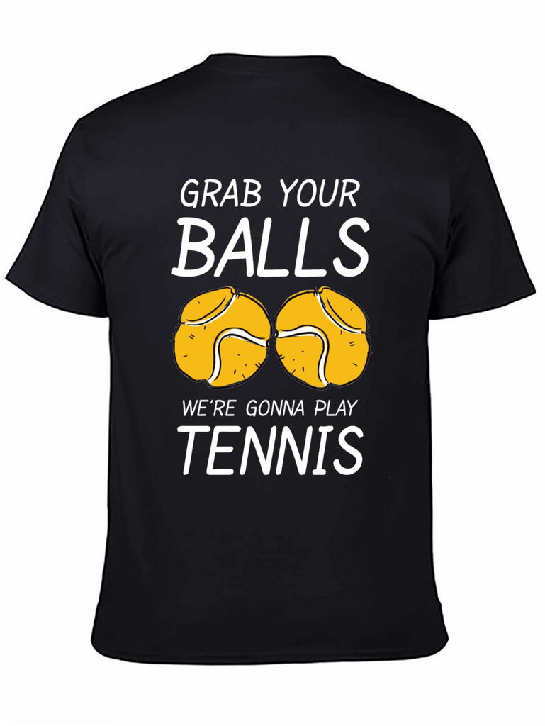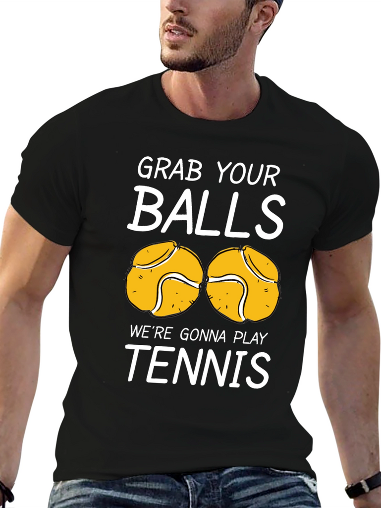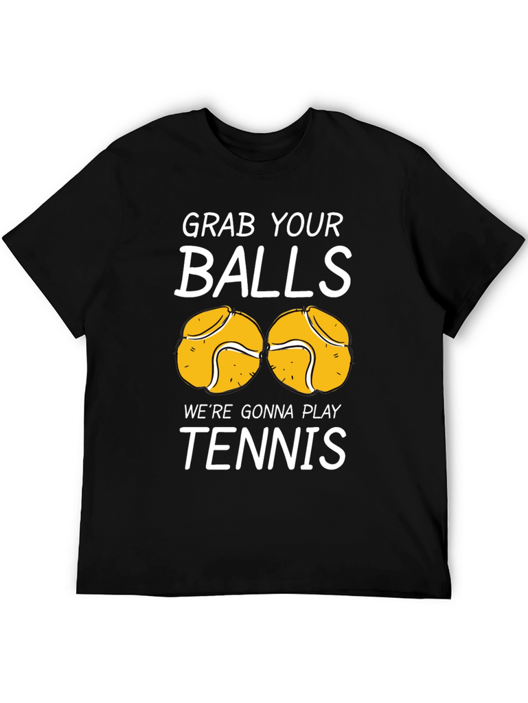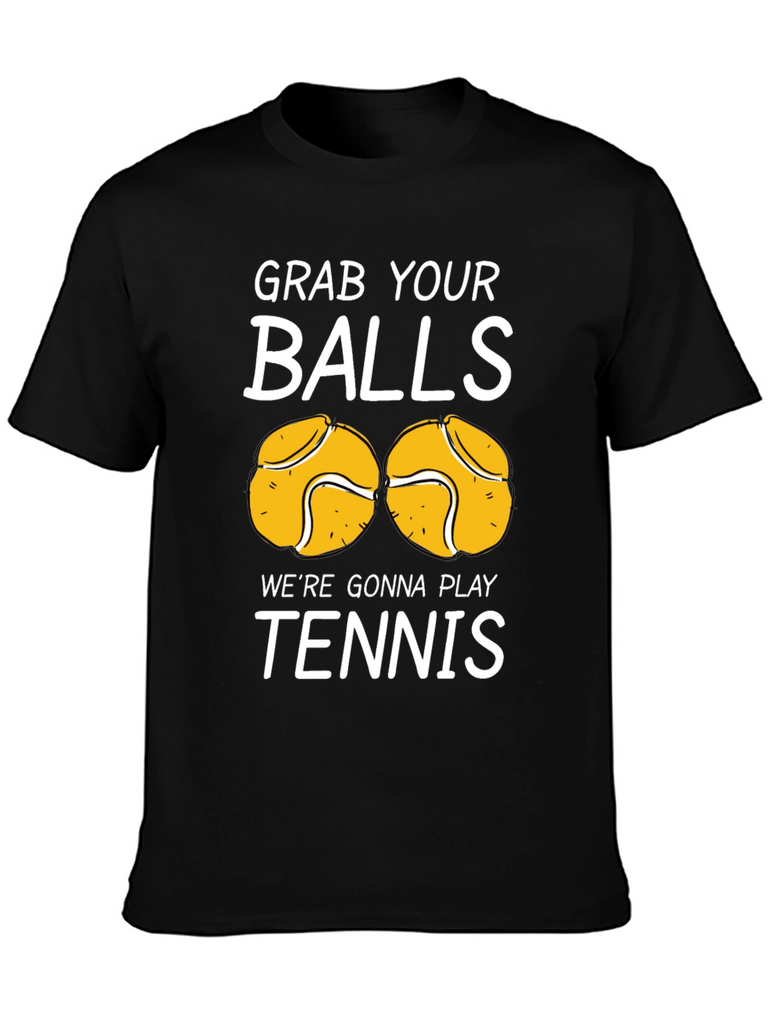Serve up some humor with this eye-catching black t-shirt! Featuring a playful graphic of two tennis balls alongside the cheeky phrase "Grab Your Balls - We're Gonna Play Tennis", this tee is sure to get a laugh. Made from what appears to be soft and comfortable fabric, it's perfect for casual wear, tennis practice, or just showing off your love for the game. This bold design makes it a great conversation starter and a fun addition to any tennis enthusiast's wardrobe. Get ready to ace your style game!