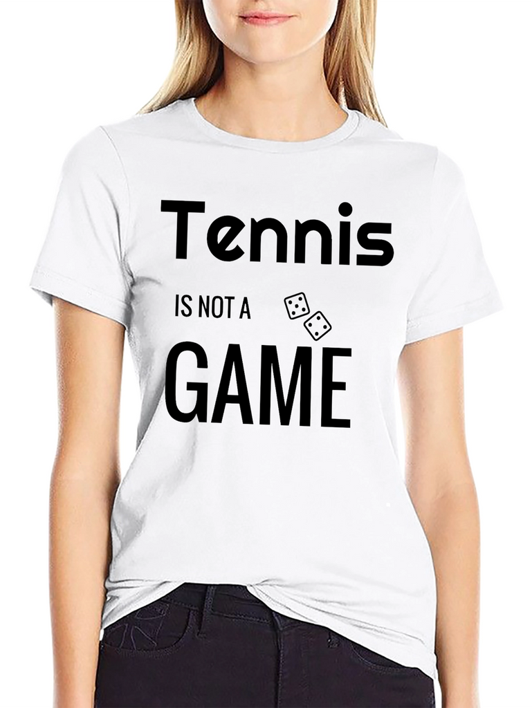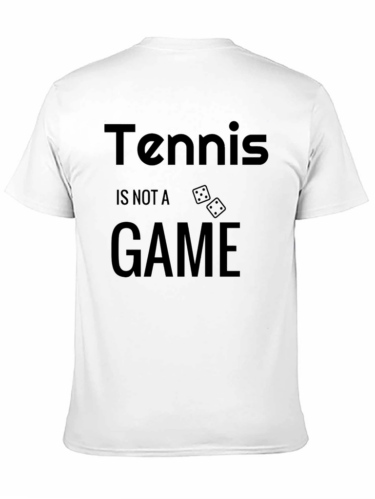 Showcase your passion for tennis with this bold black graphic T-shirt. The design features the statement "Tennis IS NOT a GAME" in striking black lettering, underlined by two dice illustrations. Crafted from a comfortable, breathable fabric, this tee is ideal for casual wear, tennis practice, or game day. Its classic fit suits all body types, making it a versatile addition to any wardrobe. Whether you're hitting the court or relaxing off-duty, this T-shirt is a must-have for dedicated tennis players and enthusiasts.