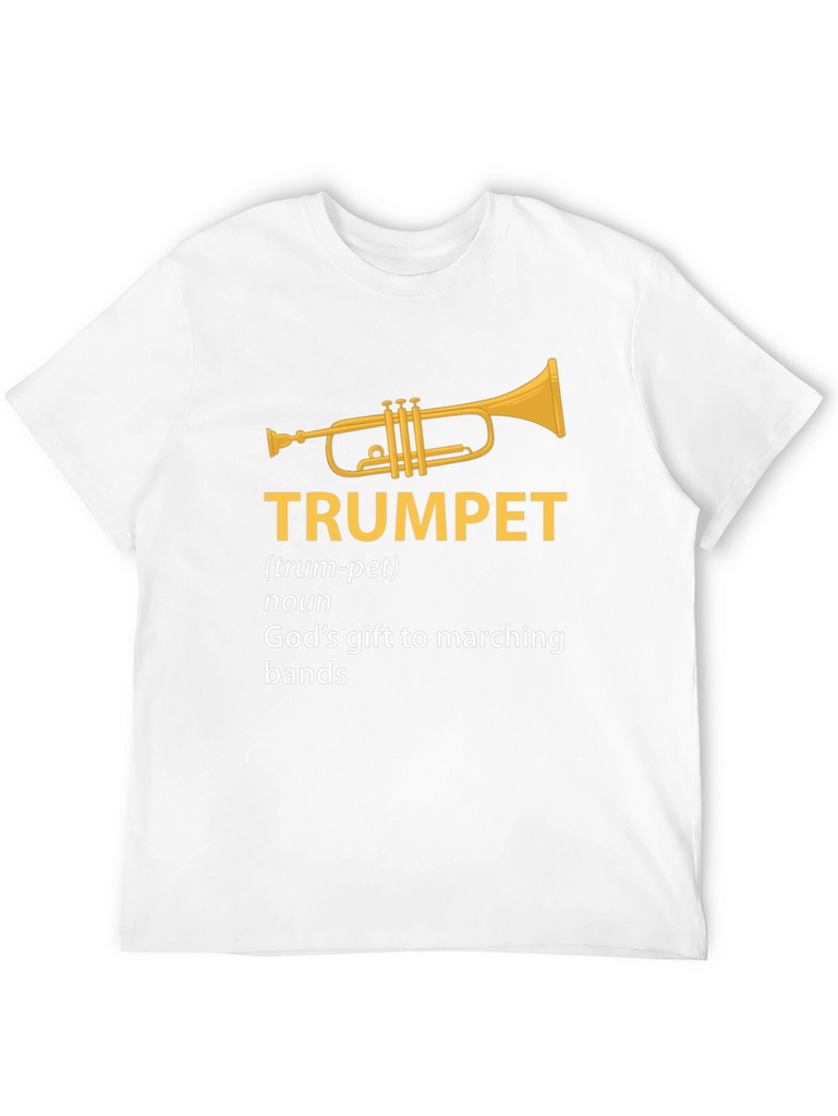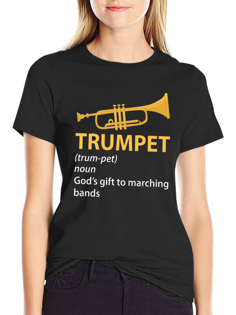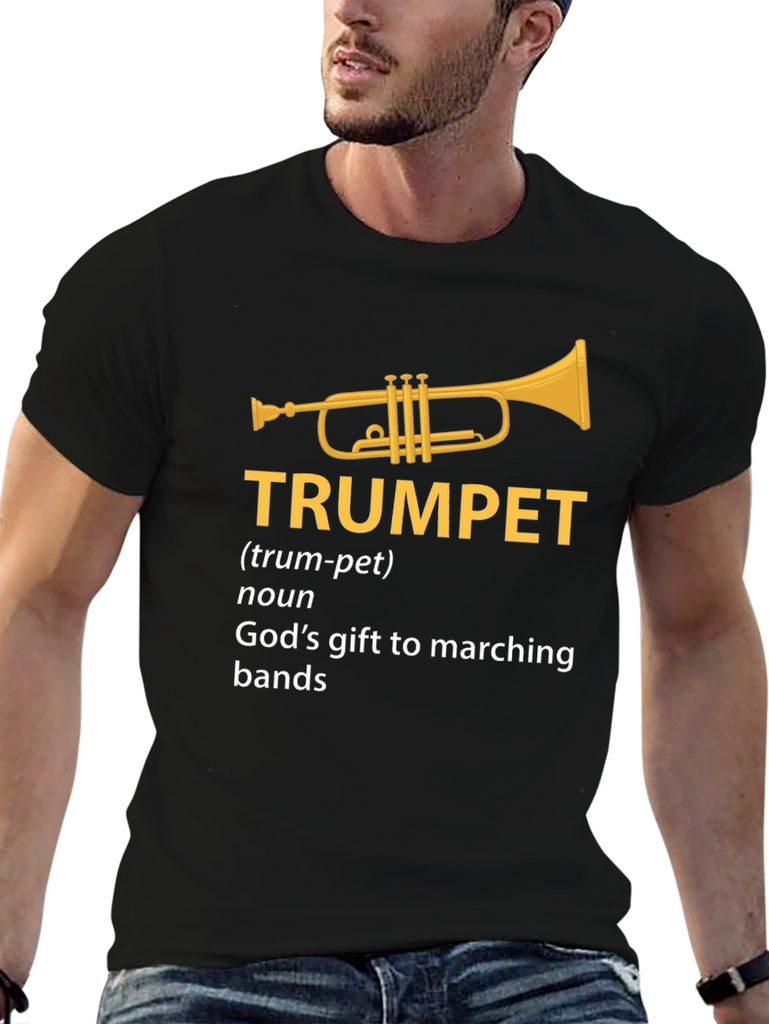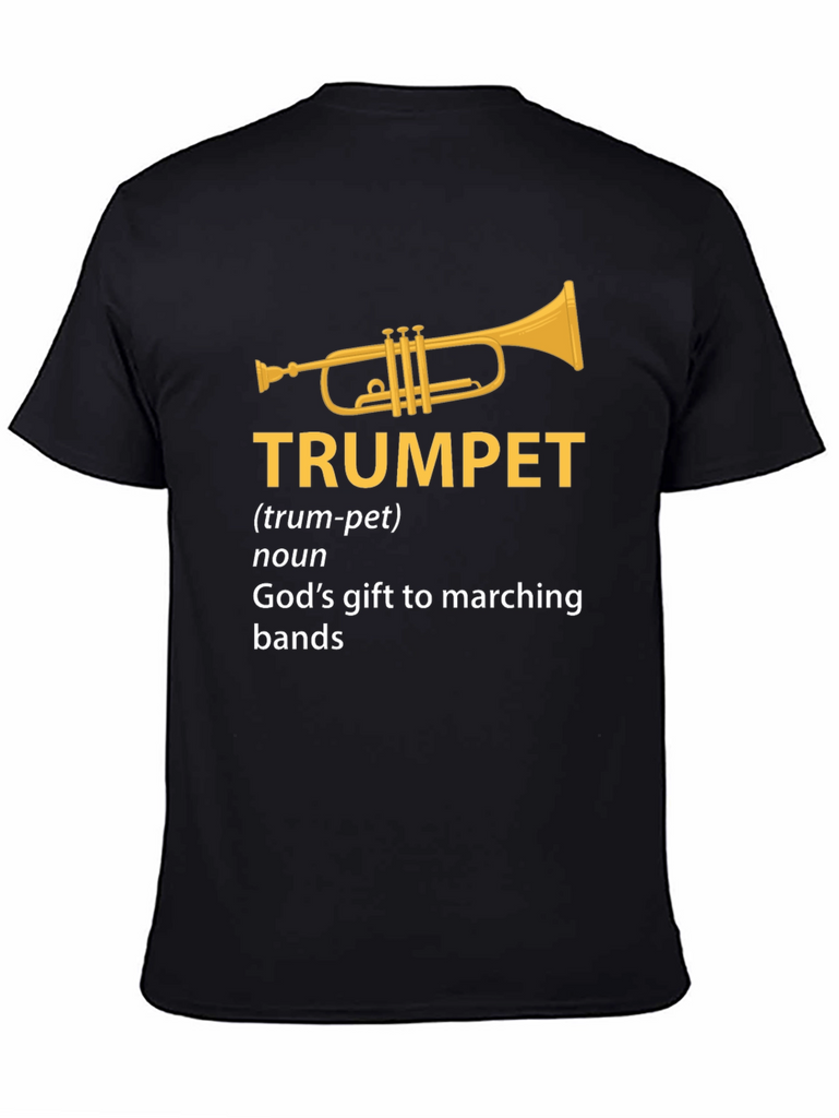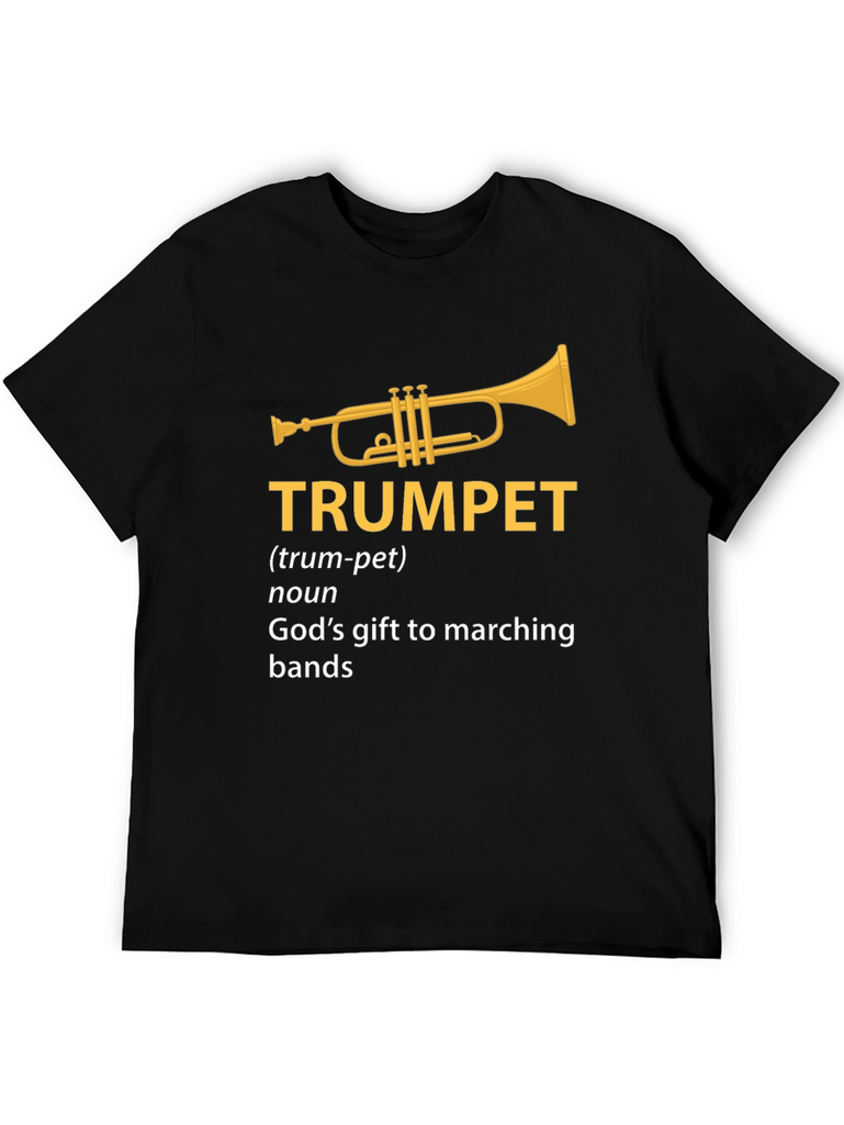 Show off your love for music with this unique graphic t-shirt! This black tee features a golden trumpet illustration above the word "TRUMPET" in bold, golden letters. Below, you'll find the definition (trum-pet) and noun, with the phrase "God's gift to marching bands." The shirt is perfect for band members, music teachers, or anyone who appreciates the beautiful sound of a trumpet. This comfortable and stylish tee is a great way to express your passion for music while making a statement. Get yours today and let the world know you're a trumpet enthusiast!