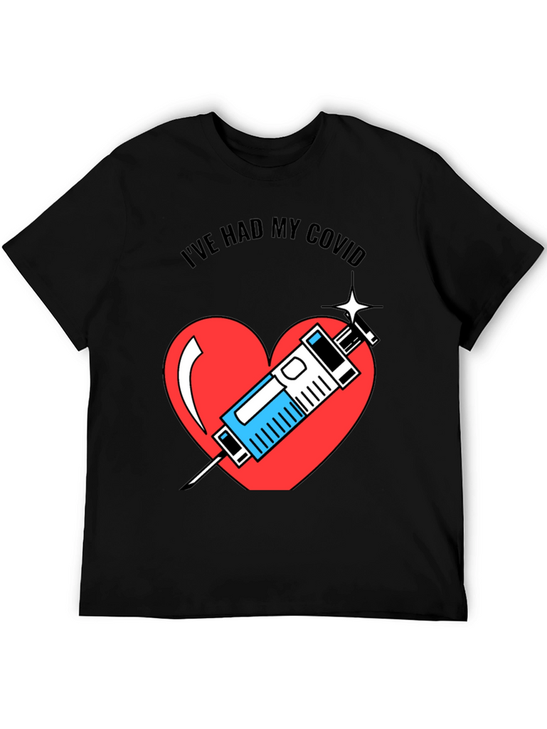 Show off your vaccination pride with this unique graphic t-shirt! This black, short-sleeve shirt features a bold design: a vibrant red heart with a syringe superimposed over it, symbolizing vaccination. The playful text above reads, "I've Had My COVID", making a statement with a touch of humor. Perfect for casual wear, public events, or as a conversation starter, this comfortable tee is a stylish way to promote awareness and celebrate your health decision. Made with soft, breathable fabric, it offers all-day comfort and durability. Get yours today and wear your support on your sleeve...or rather, your chest!