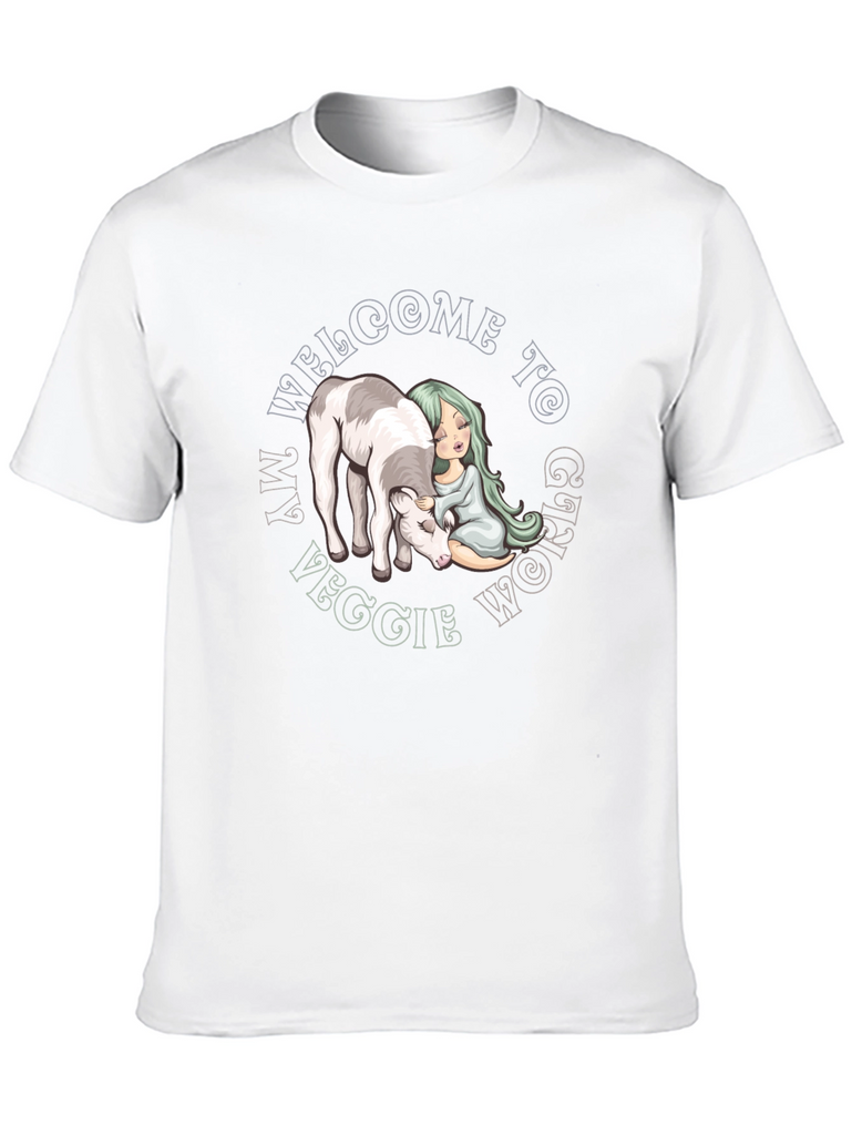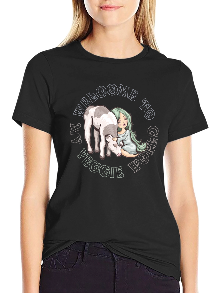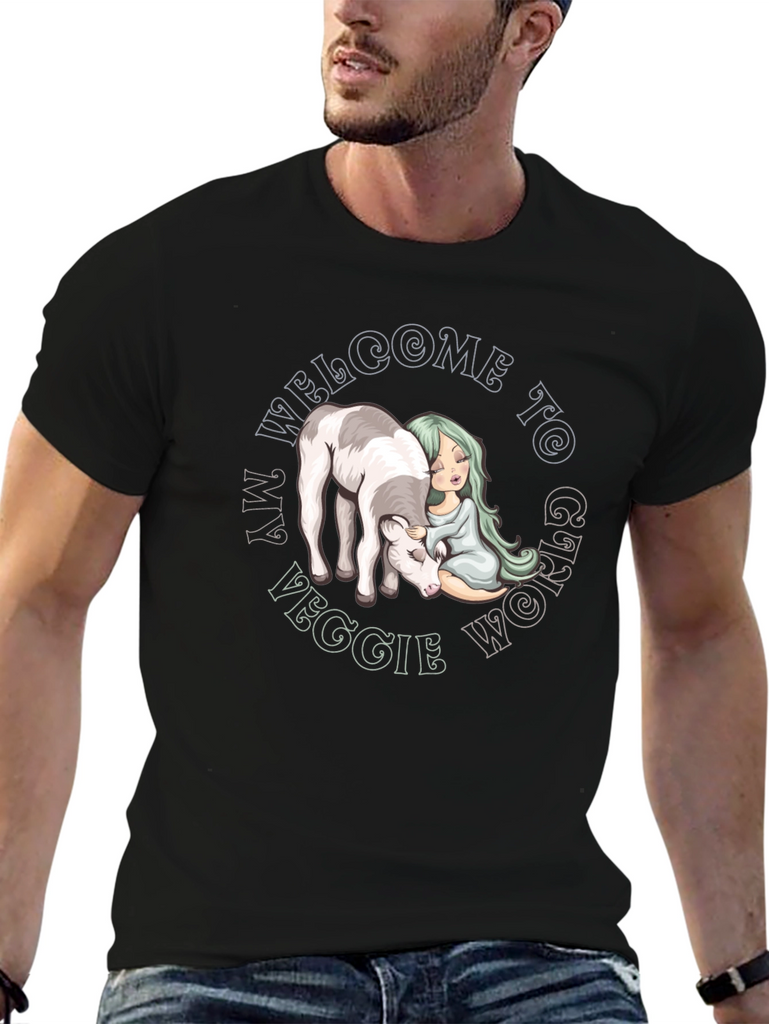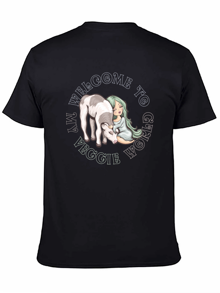 Showcase your love for animals and a plant-based lifestyle with this eye-catching black graphic tee. This shirt features a charming design of a girl and a calf nestled close, surrounded by the text "My Welcome To Veggie World". The design is perfect for vegans, animal lovers, and anyone who wants to spread a message of compassion and kindness. Made from soft, comfortable materials, this t-shirt is ideal for everyday wear. Pair it with jeans, shorts, or a skirt for a casual yet stylish look that speaks volumes about your values. Add this unique piece to your wardrobe and make a statement with your style.