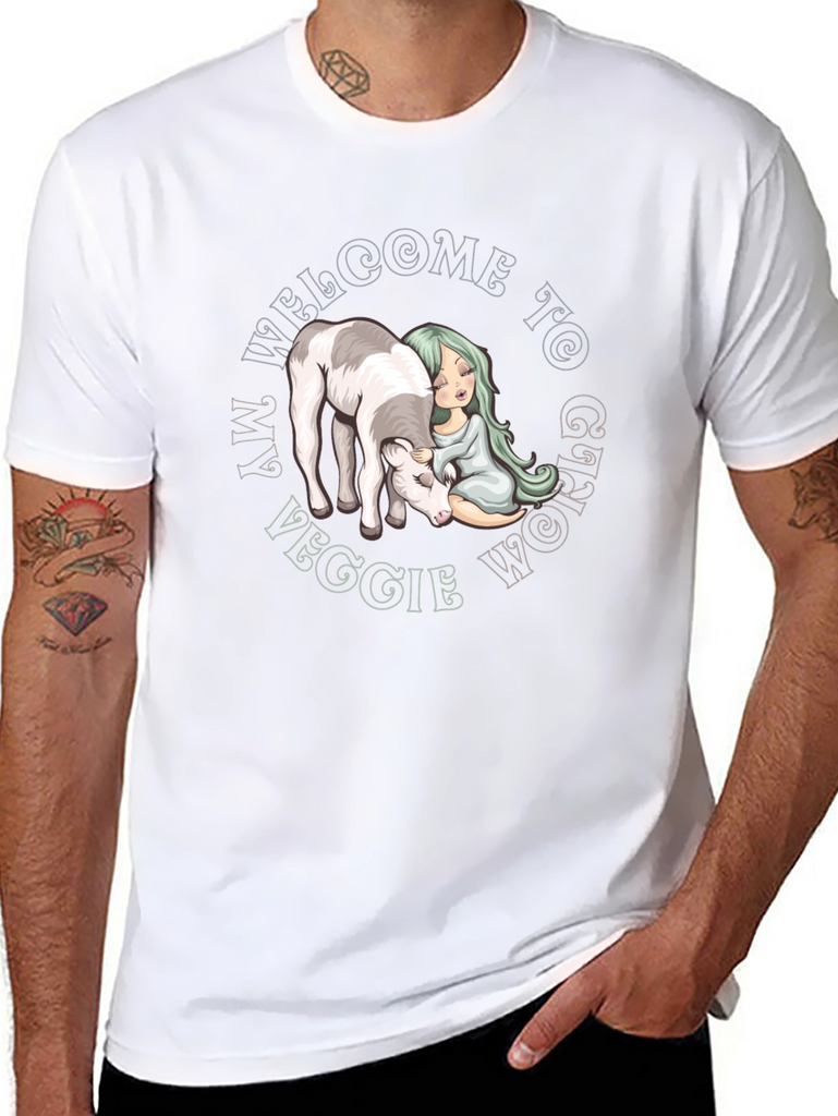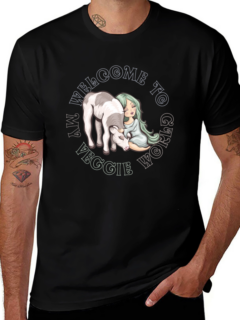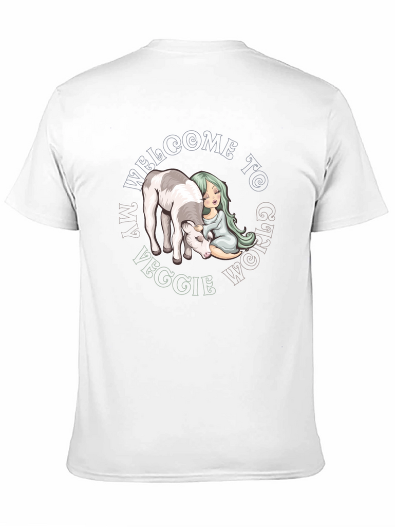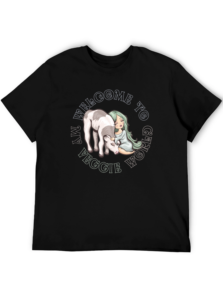 Showcase your love for animals and a plant-based lifestyle with this eye-catching black graphic tee. This shirt features a charming design of a girl and a calf nestled close, surrounded by the text "My Welcome To Veggie World". The design is perfect for vegans, animal lovers, and anyone who wants to spread a message of compassion and kindness. Made from soft, comfortable materials, this t-shirt is ideal for everyday wear. Pair it with jeans, shorts, or a skirt for a casual yet stylish look that speaks volumes about your values. Add this unique piece to your wardrobe and make a statement with your style.