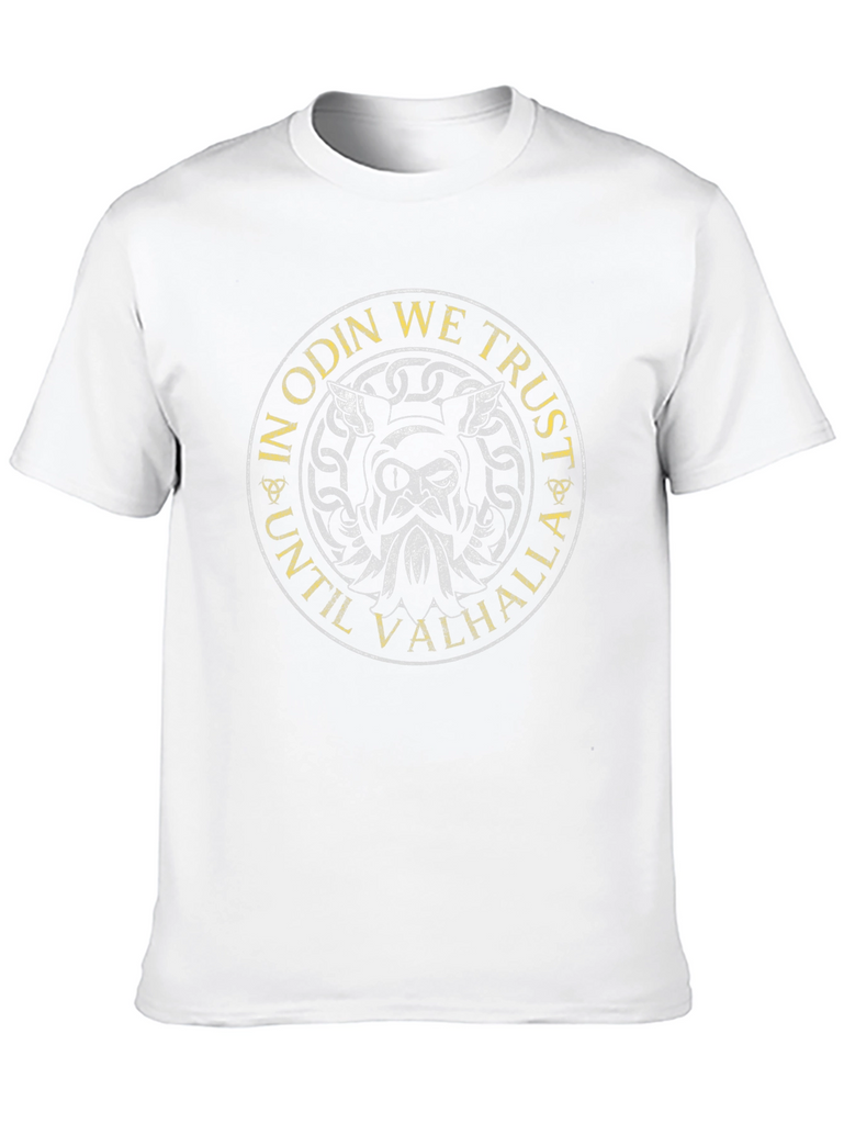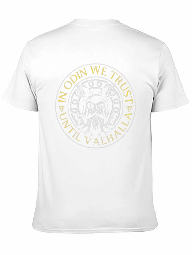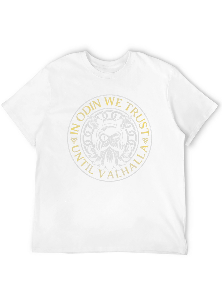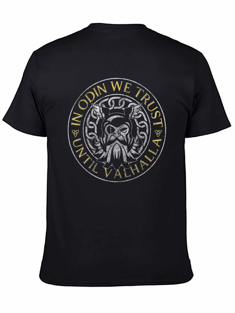 Embrace your inner Viking with this striking graphic t-shirt. The shirt features a bold circular design with the phrase "In Odin We Trust Until Valhalla" surrounding a detailed depiction of Odin. The design has a distressed, vintage look, adding to its rugged appeal. Crafted from a comfortable black fabric, this tee is perfect for casual wear, themed events, or as a unique addition to any wardrobe. Show off your Norse pride with this eye-catching and durable t-shirt.